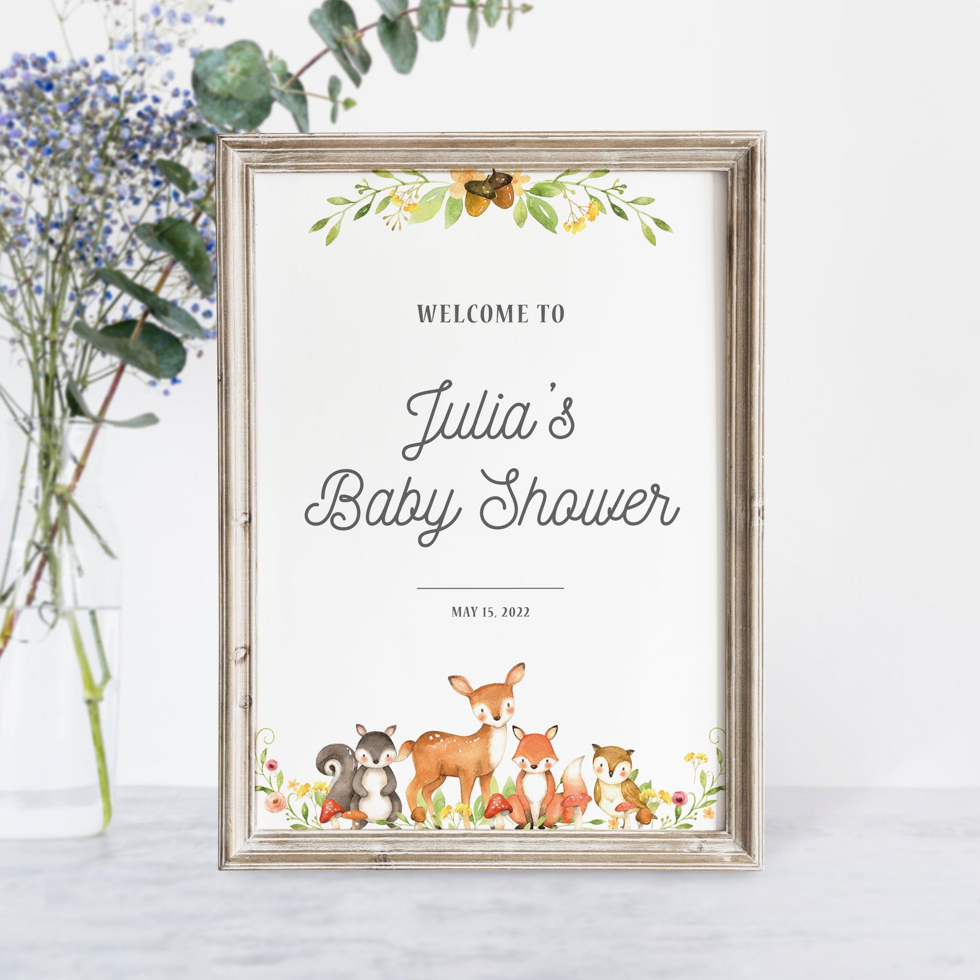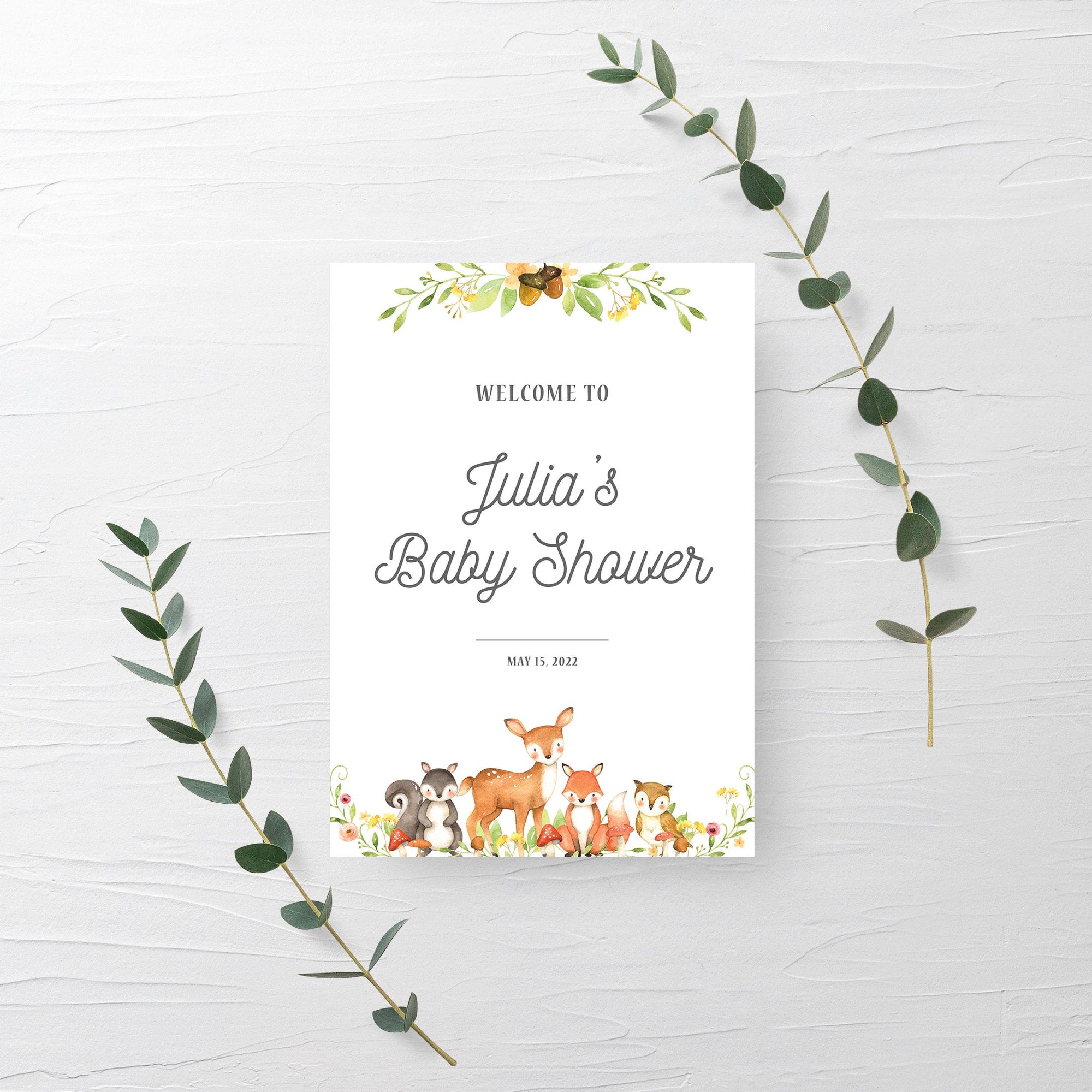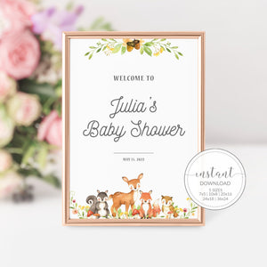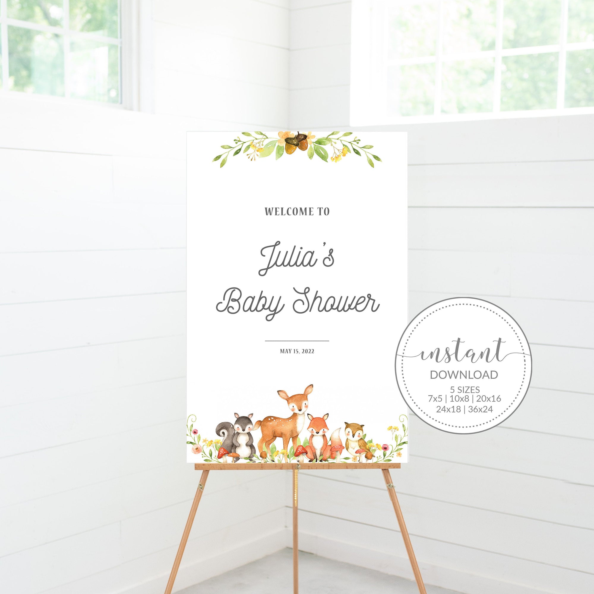 This woodland baby shower welcome sign is available as an INSTANT DOWNLOAD editable template. Edit right in your browser using the online program, Templett. No software to download or fonts to install and you can even try it out before you buy!