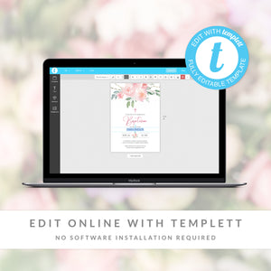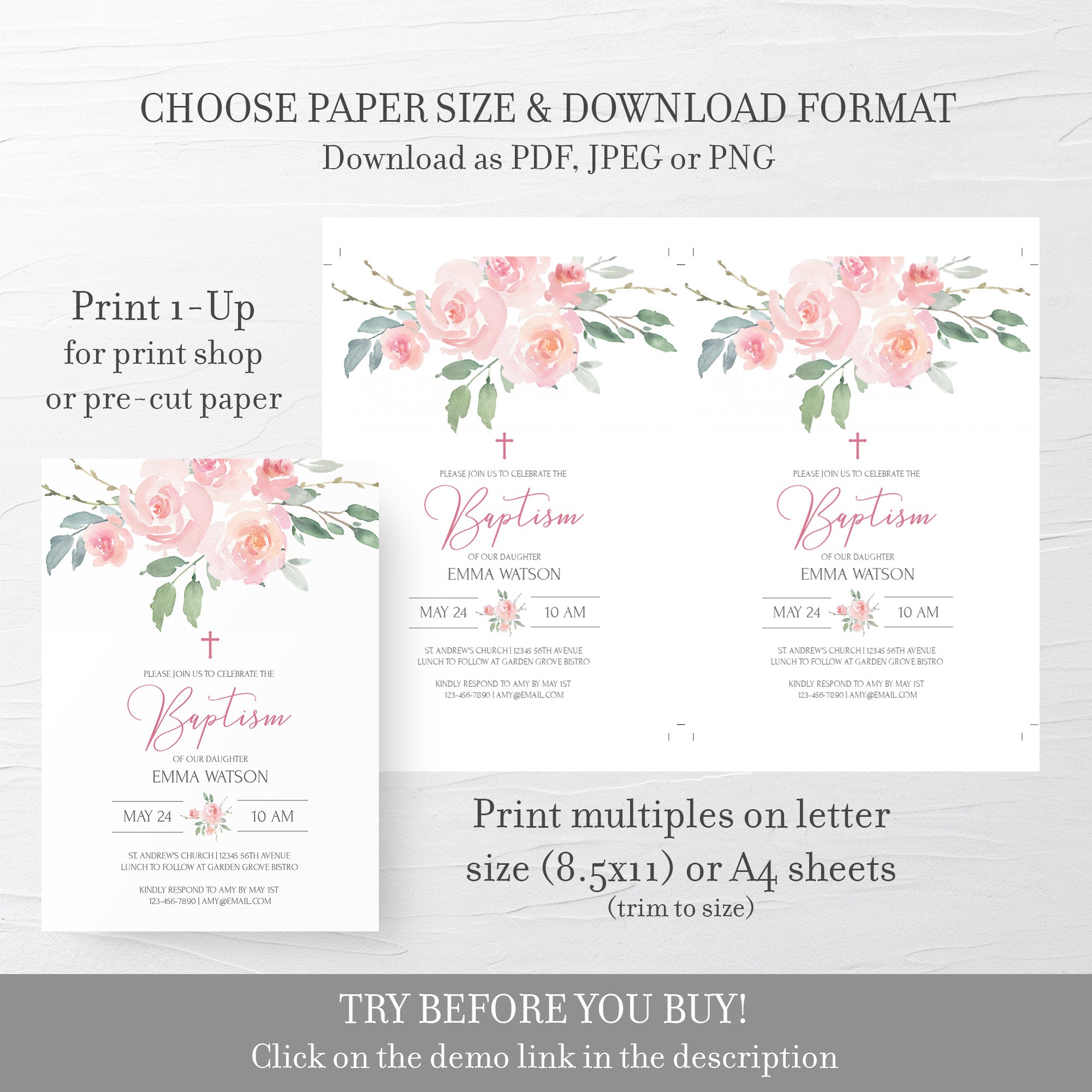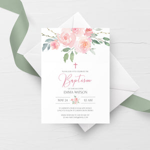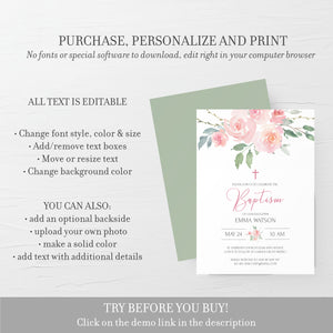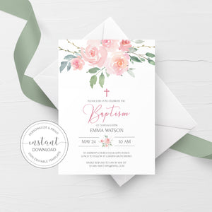 Blush Pink Floral Baby Girl Baptism Invitation Template, Printable Baptism Invite, Editable INSTANT DOWNLOAD - FR100
