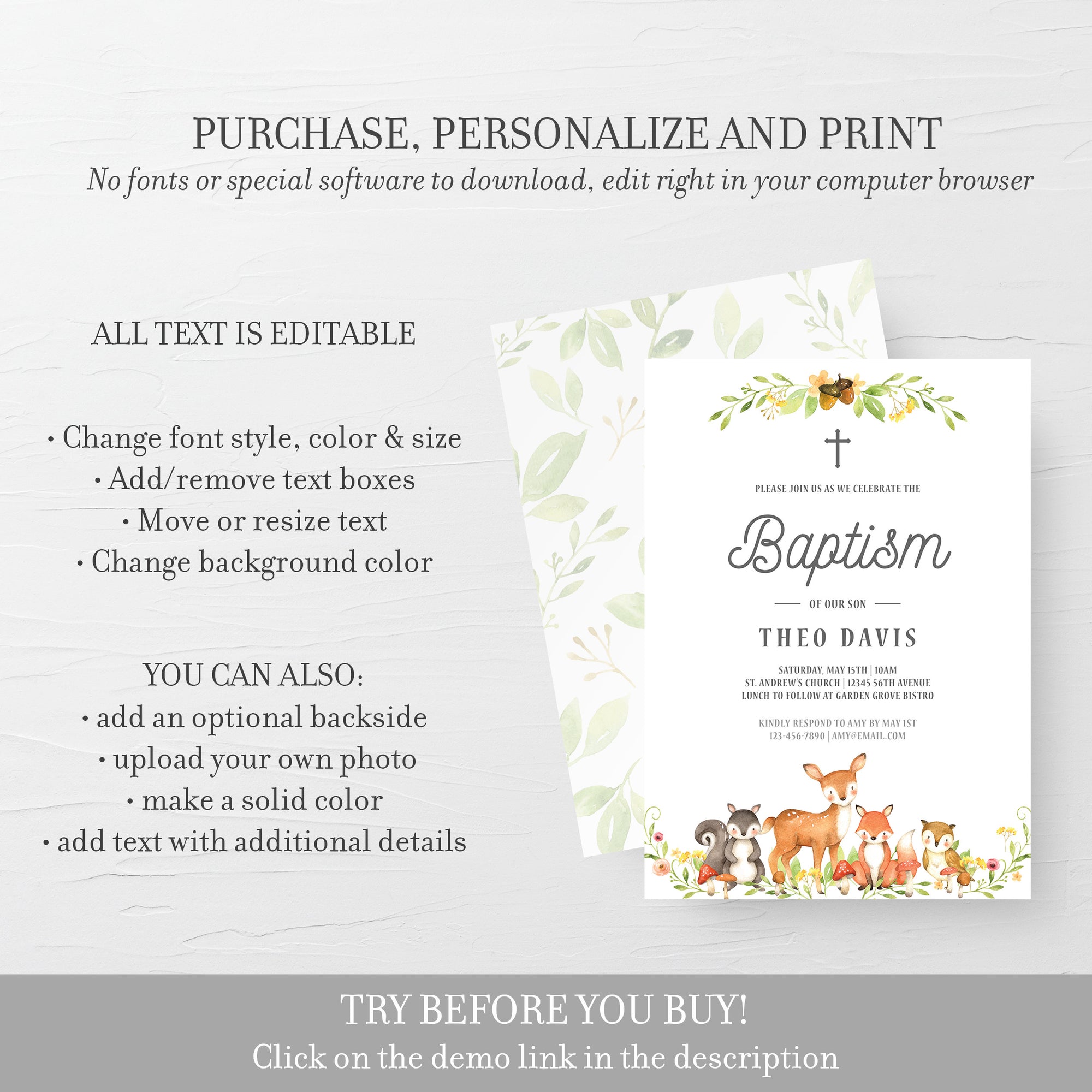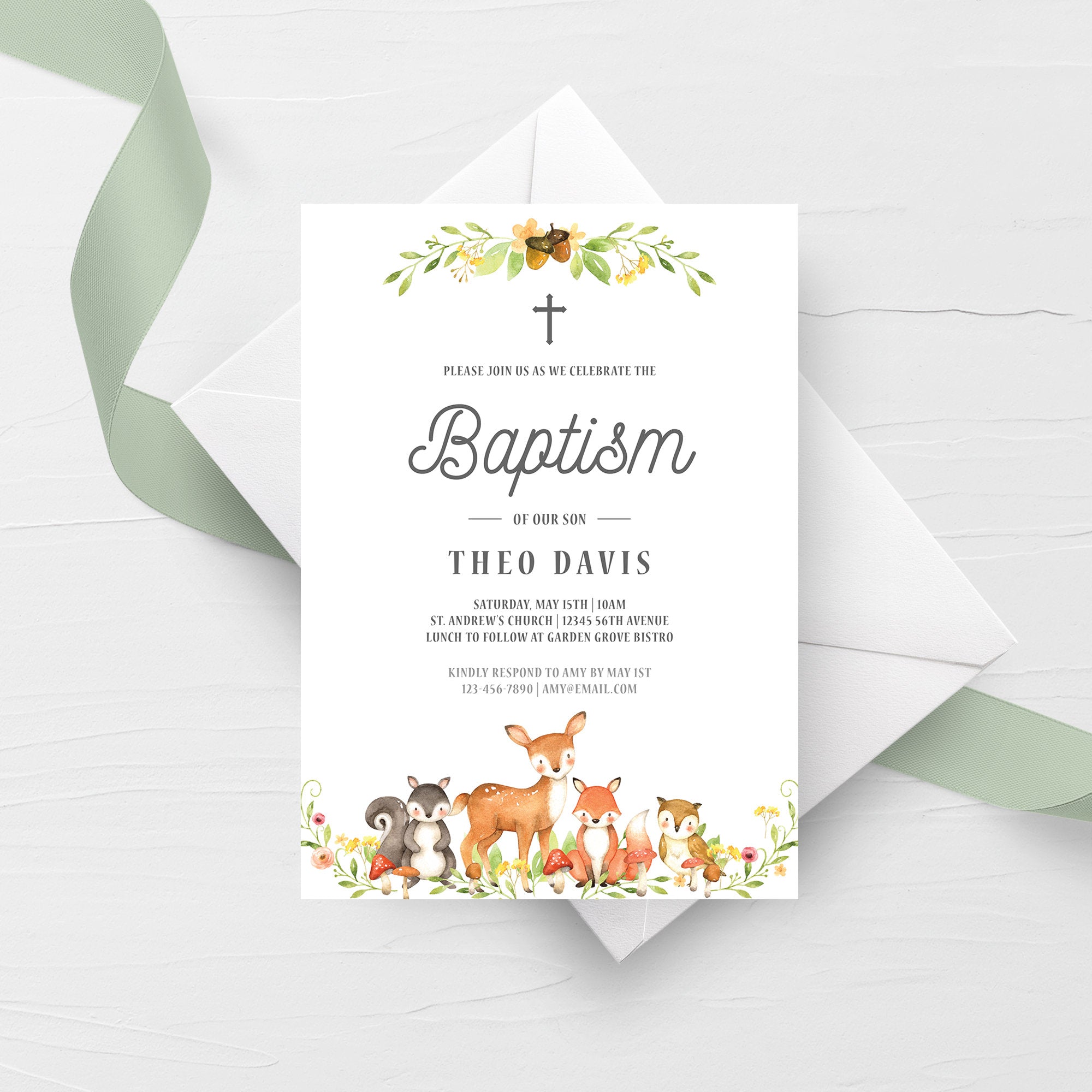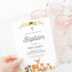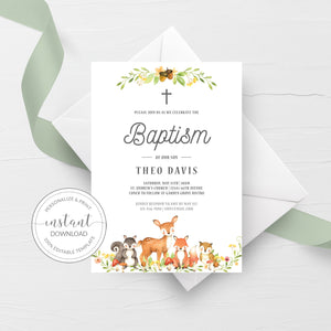 Woodland Themed Boy Baptism Invitation Template, Printable Baptism Invite, Editable INSTANT DOWNLOAD - W100
