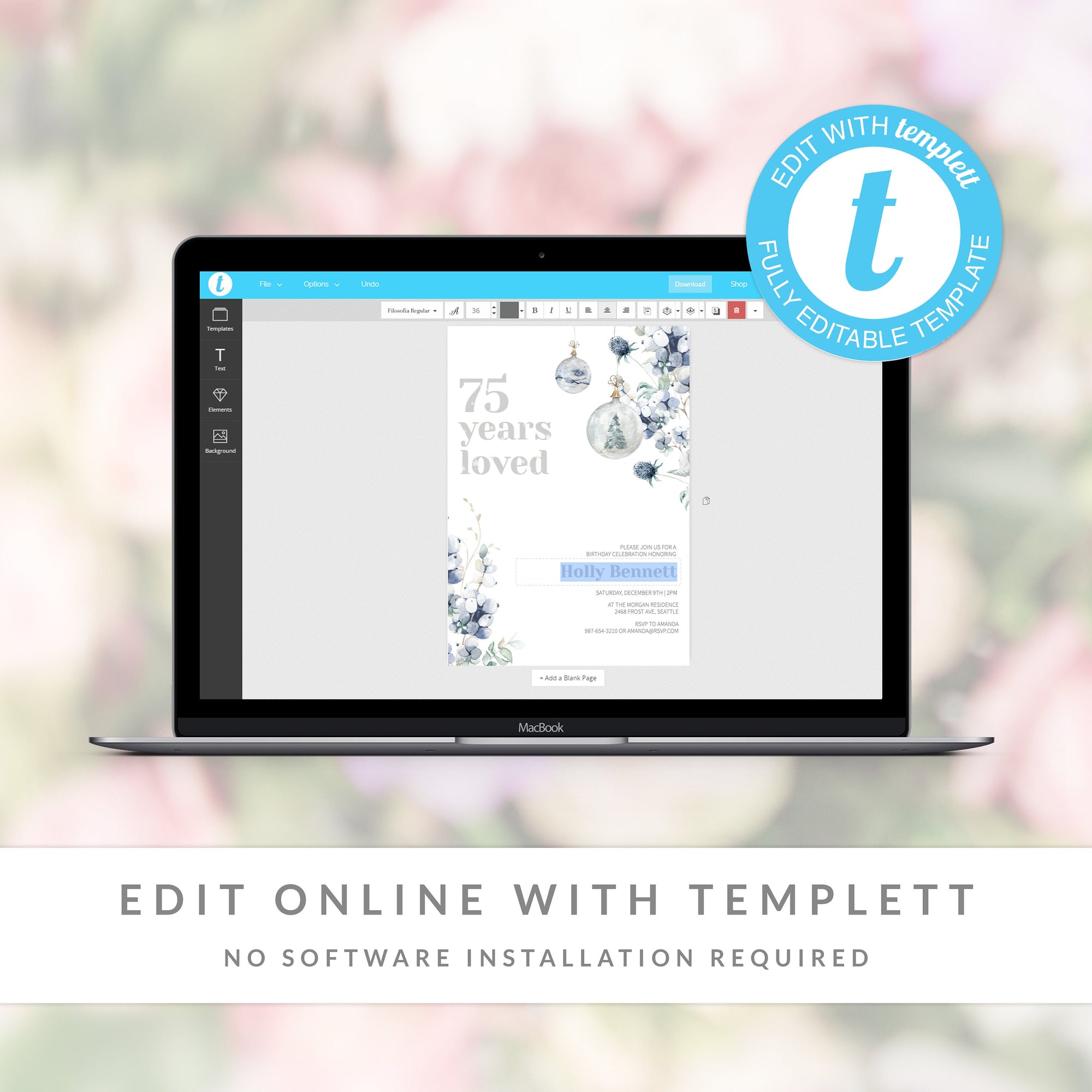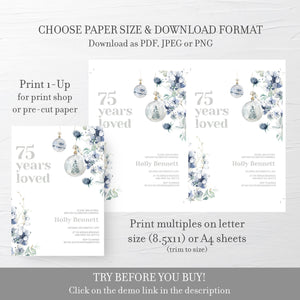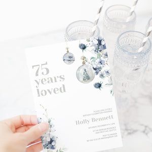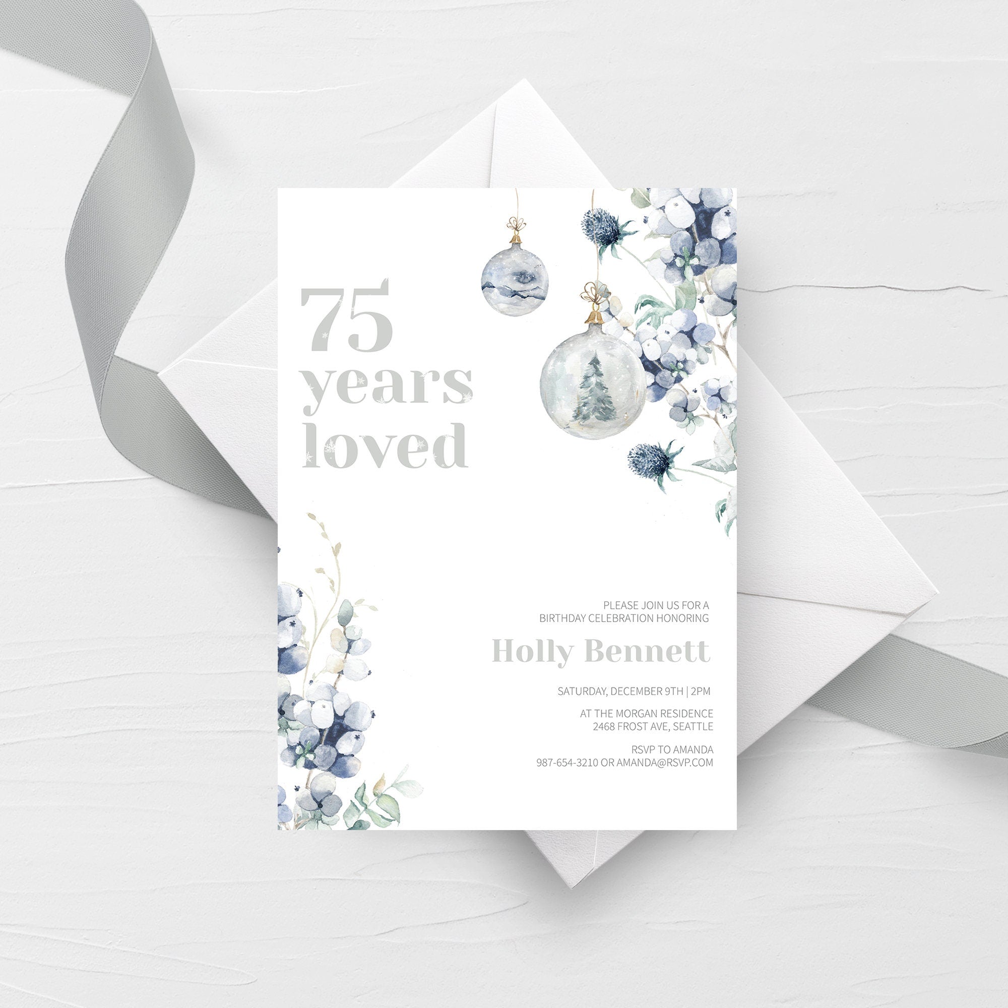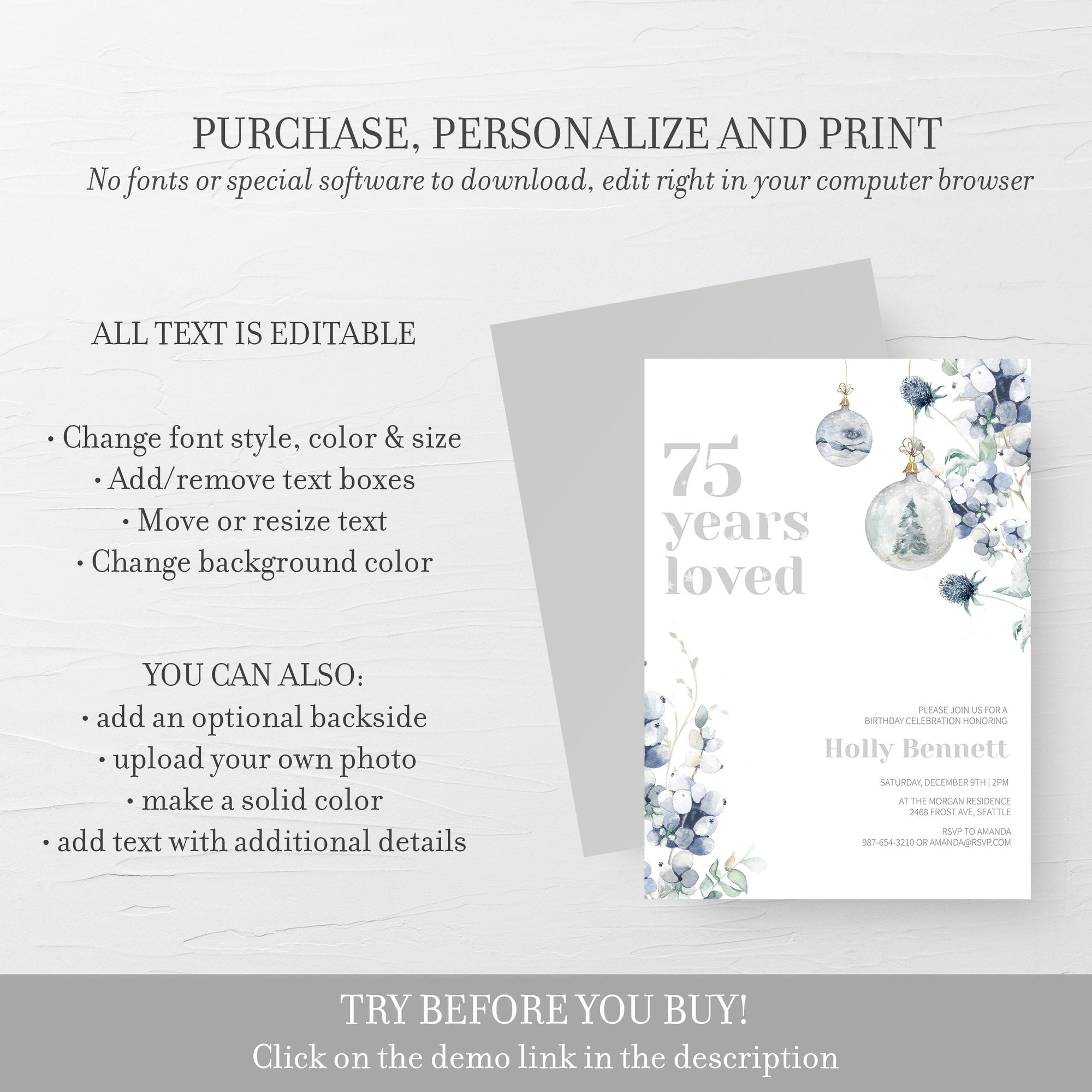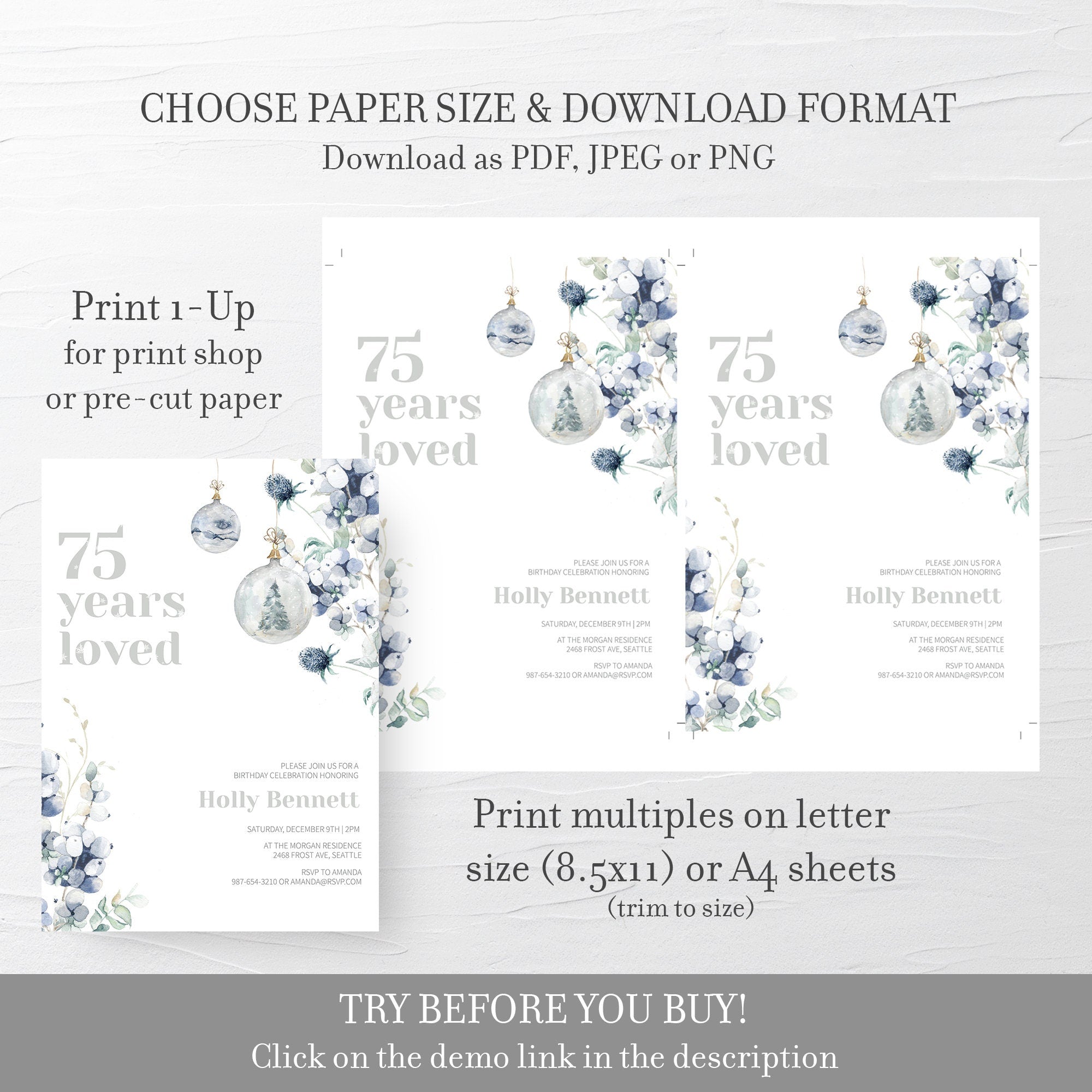 Winter 75th Birthday Invitation Template, Printable Christmas Birthday Invite, Editable INSTANT DOWNLOAD - AW100