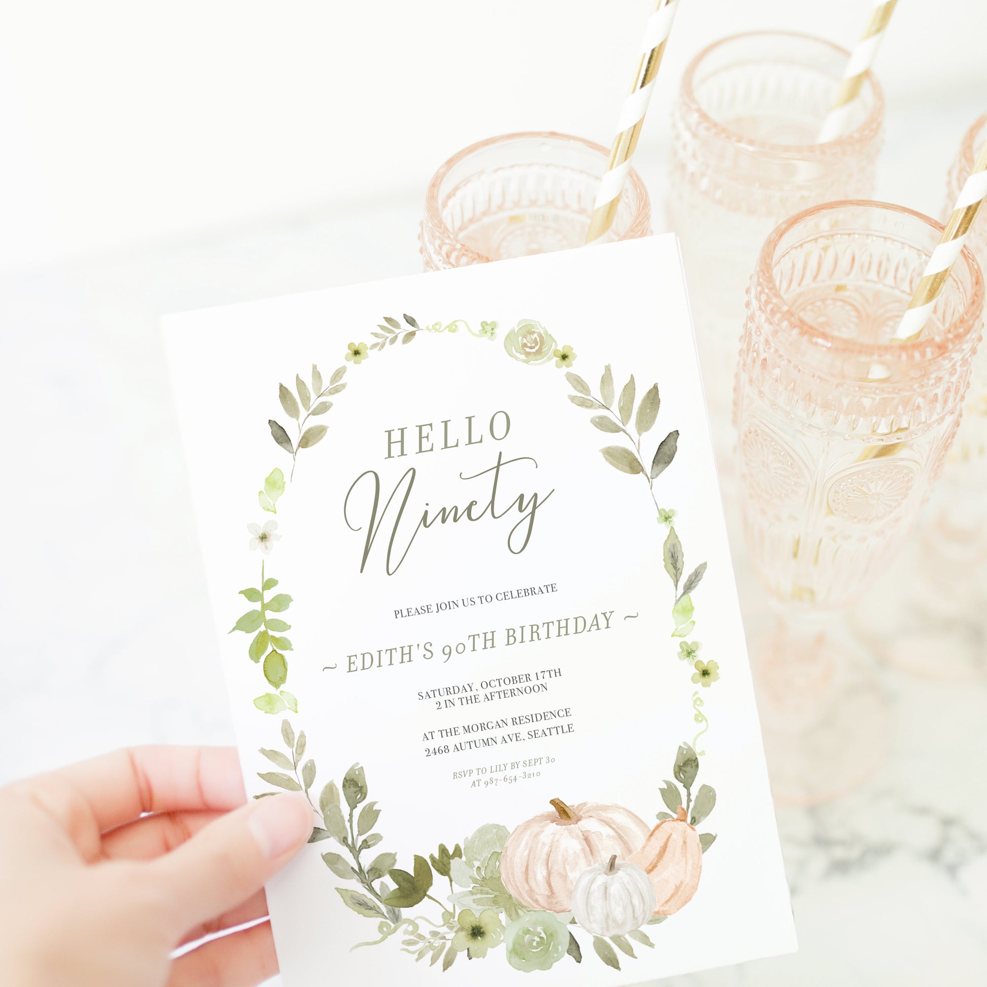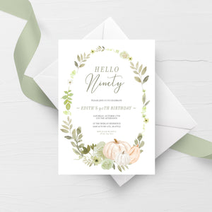 Fall Greenery Pumpkin 90th Birthday Invitation Template, Printable Birthday Invite, Editable INSTANT DOWNLOAD - PG100