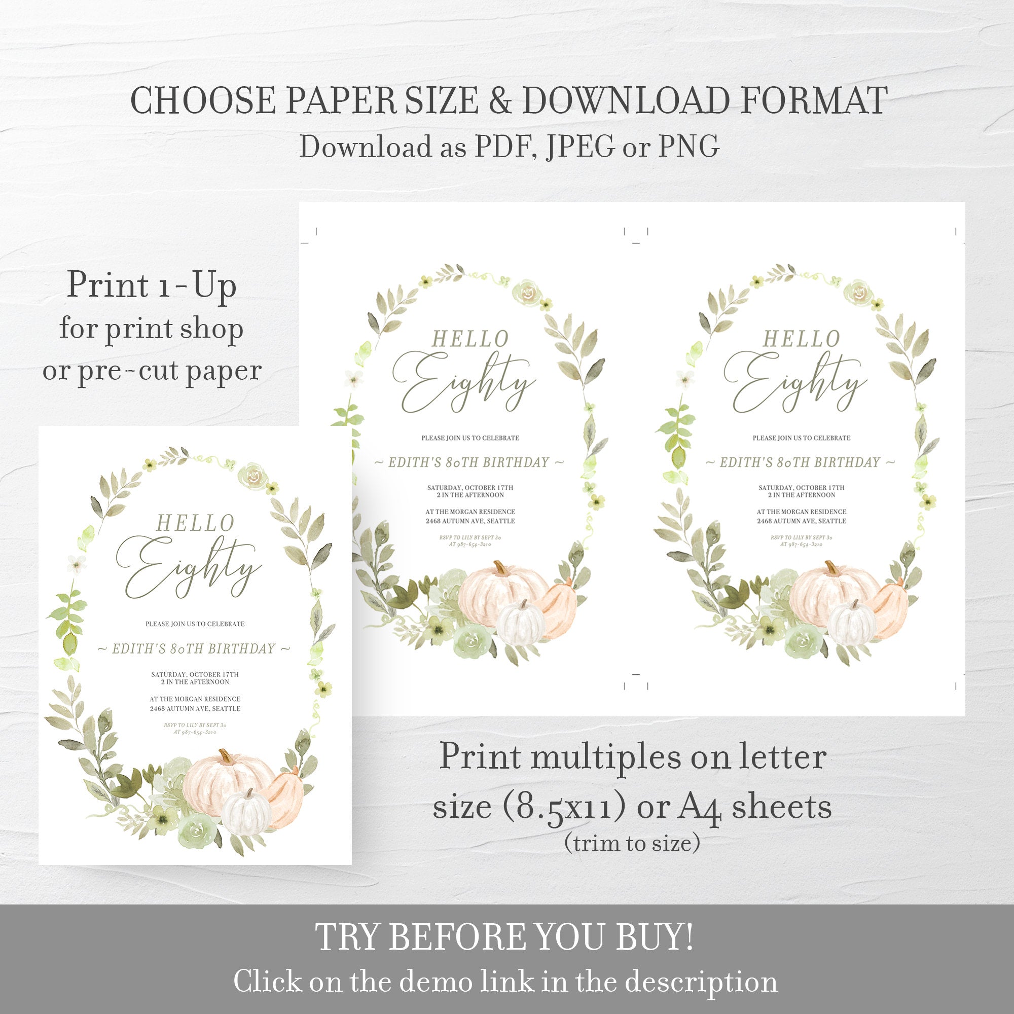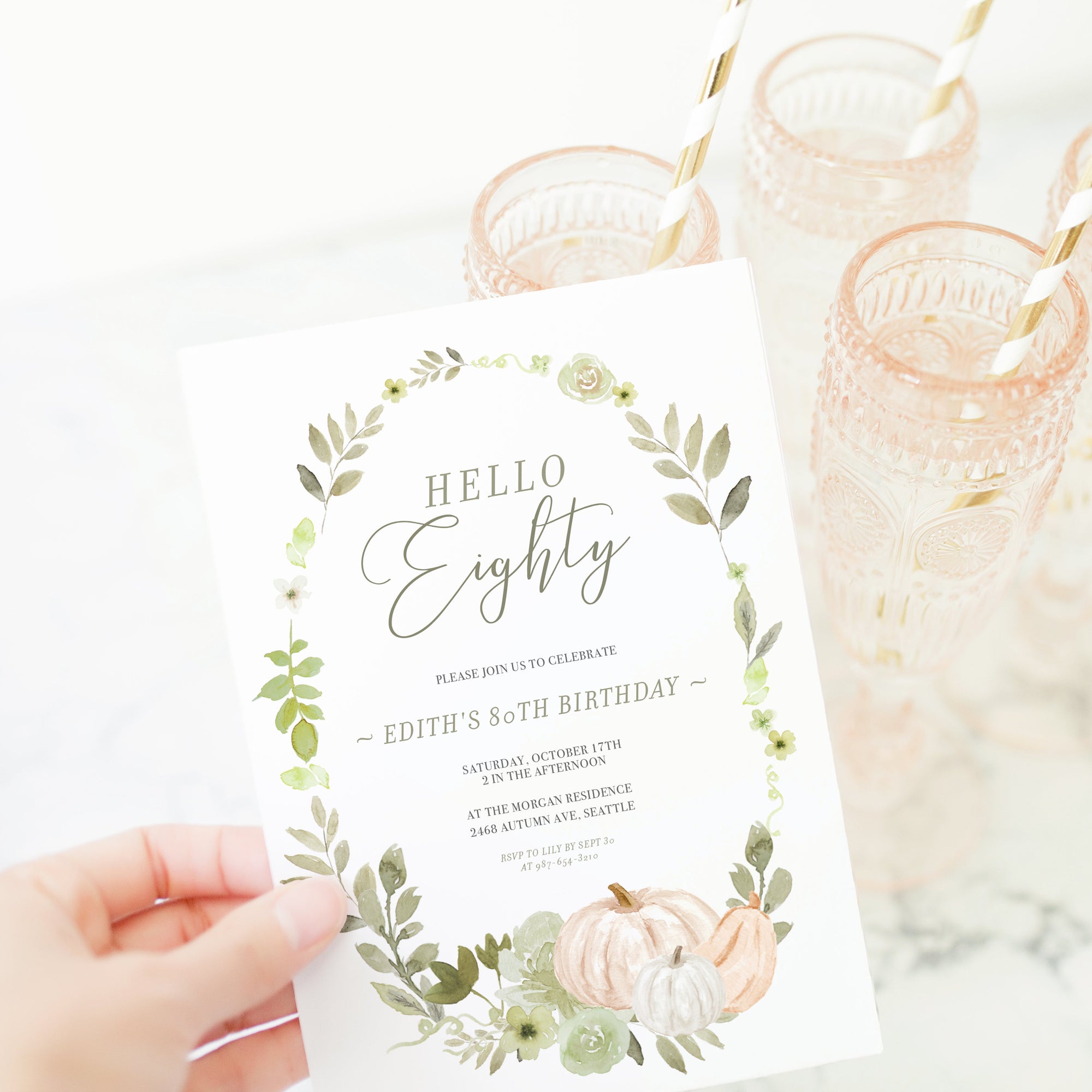 Fall Greenery Pumpkin 80th Birthday Invitation Template, Printable Birthday Invite, Editable INSTANT DOWNLOAD - PG100