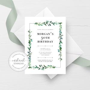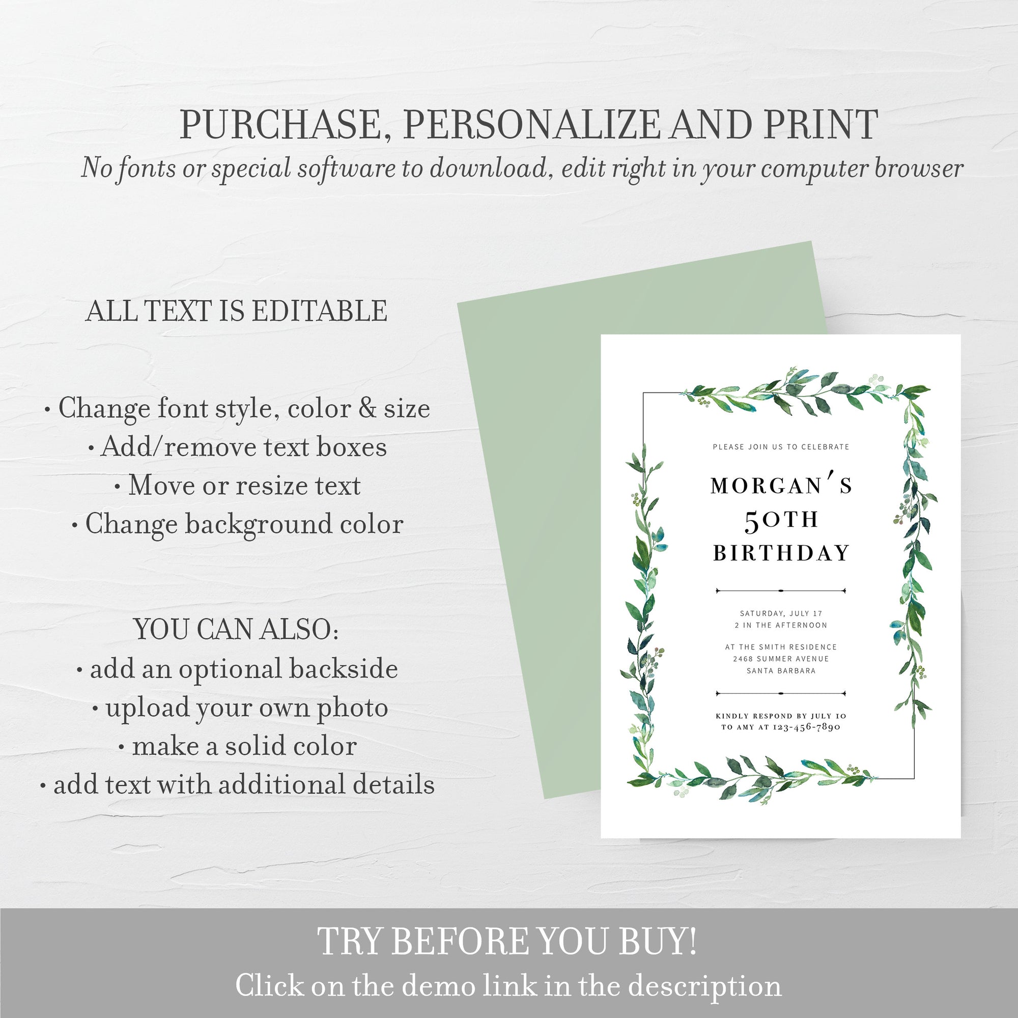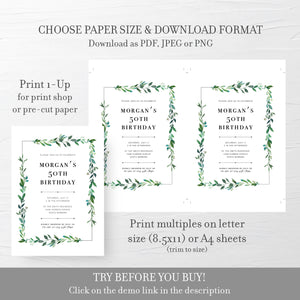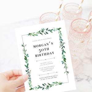 Greenery 50th Birthday Invitation Template, Printable 50th Party Invite, Editable INSTANT DOWNLOAD - G100