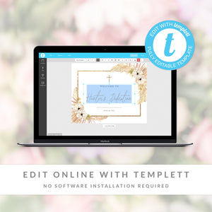 This baby dedication welcome sign is available as an INSTANT DOWNLOAD editable template. Edit right in your browser using the online program, Templett. No software to download or fonts to install and you can even try it out before you buy!