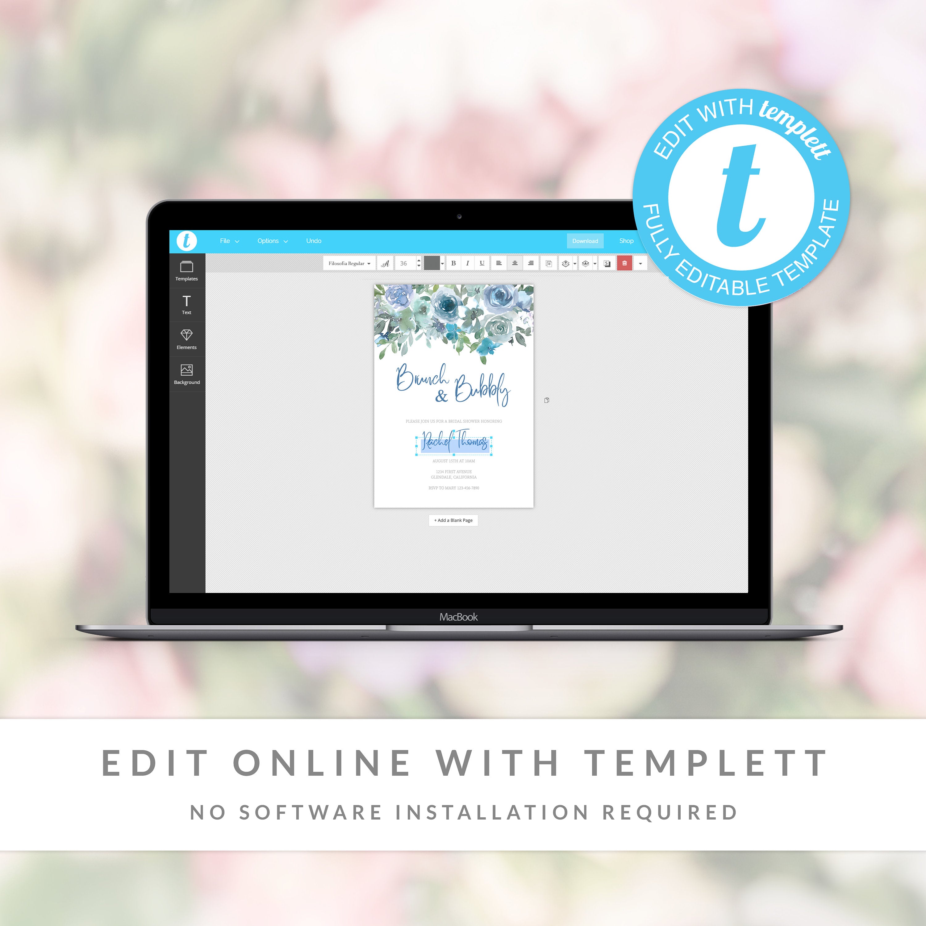 Blue Floral Brunch and Bubbly Bridal Shower Invitation Template, Printable Bridal Shower Invite - BF100