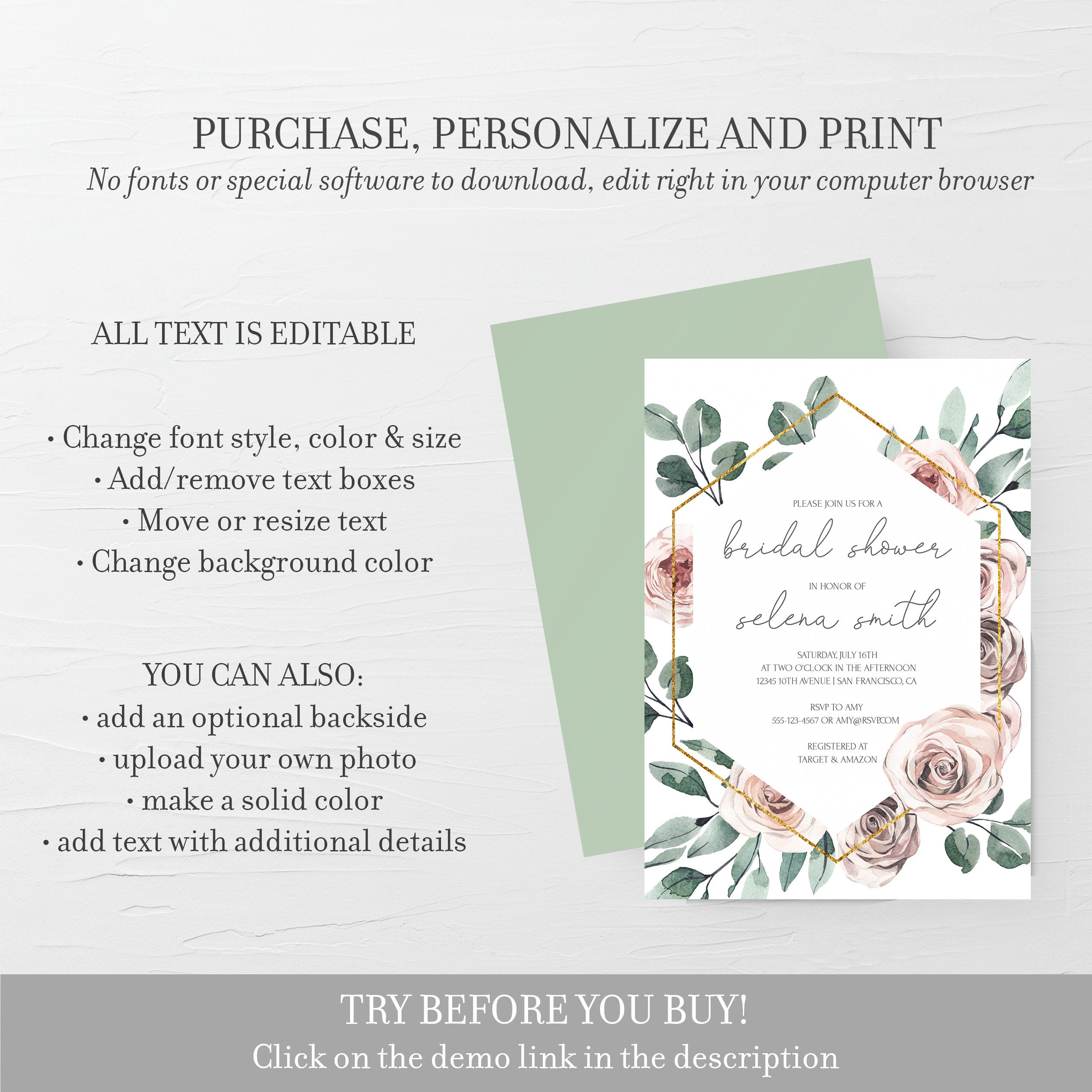 Boho Rose Bridal Shower Invitation Template, Printable Floral Shower Invite, Editable INSTANT DOWNLOAD - BR100