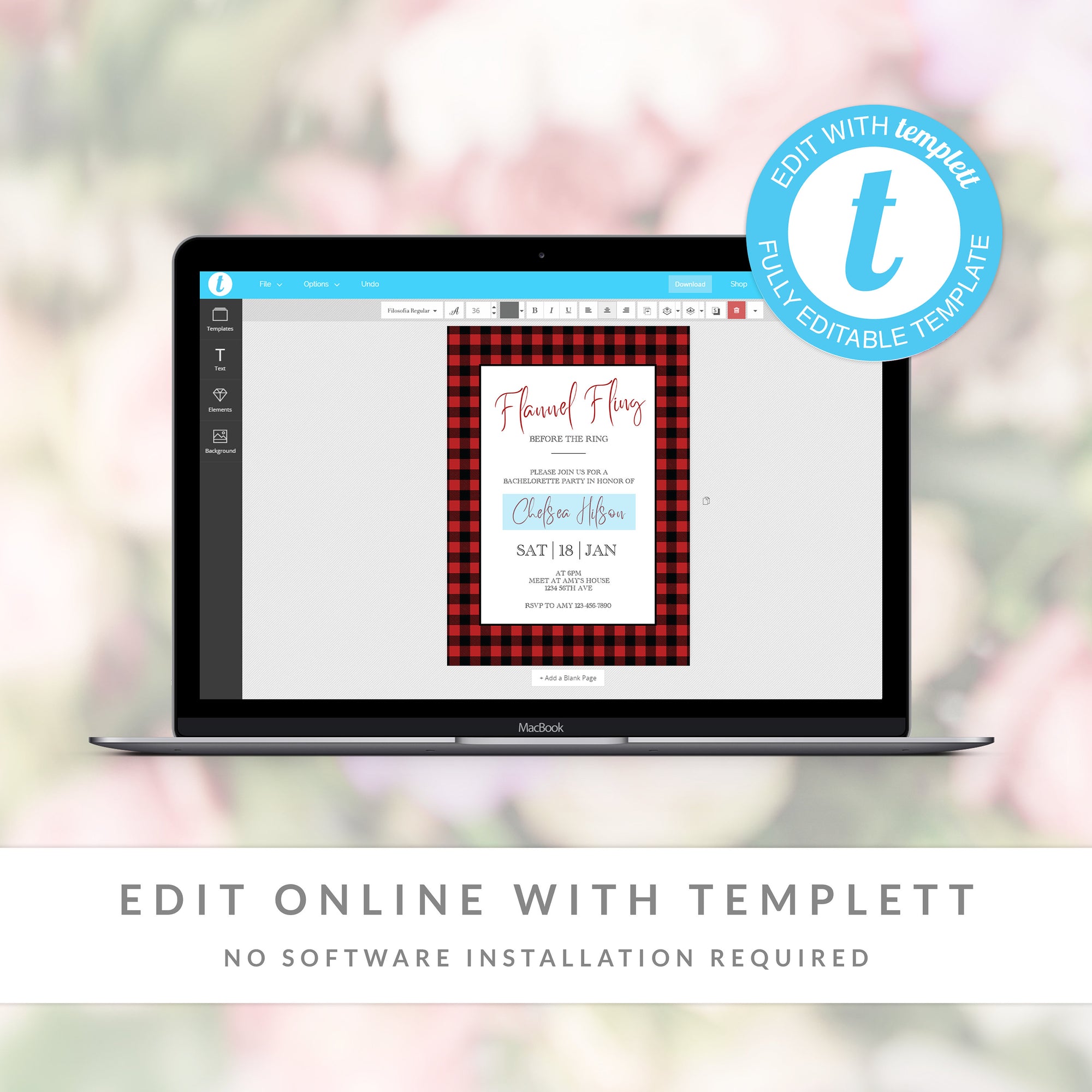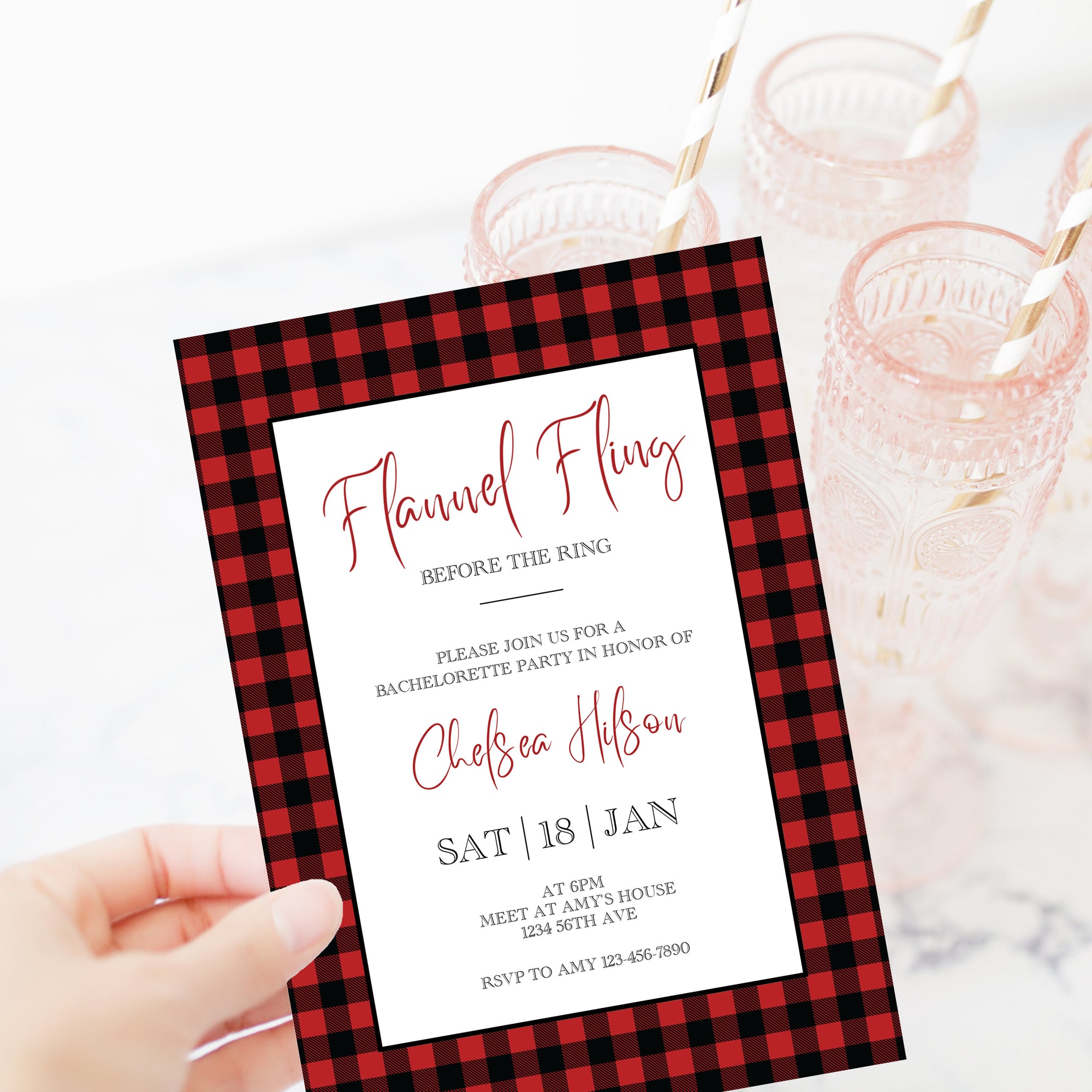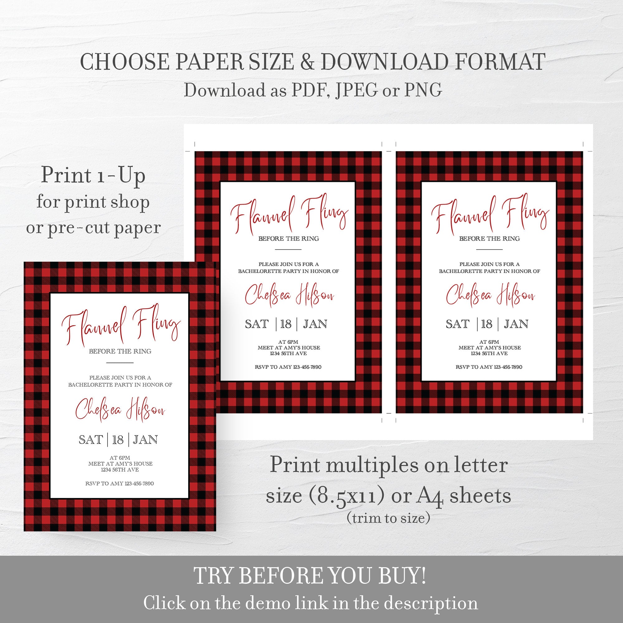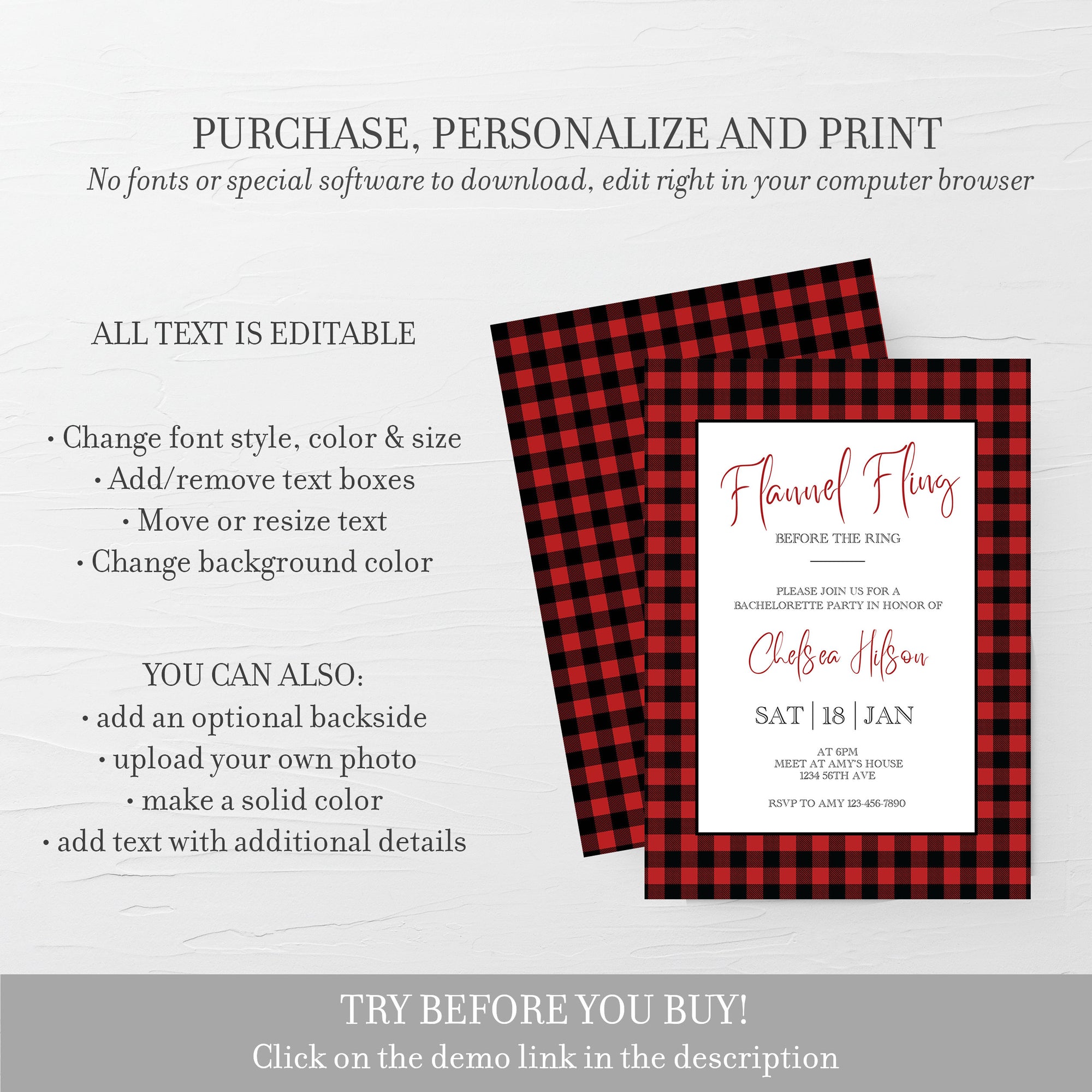This flannel fling bachelorette party invitation is available as an INSTANT DOWNLOAD editable template. Edit right in your browser using the online program, Templett. No software to download or fonts to install and you can even try it out before you buy!