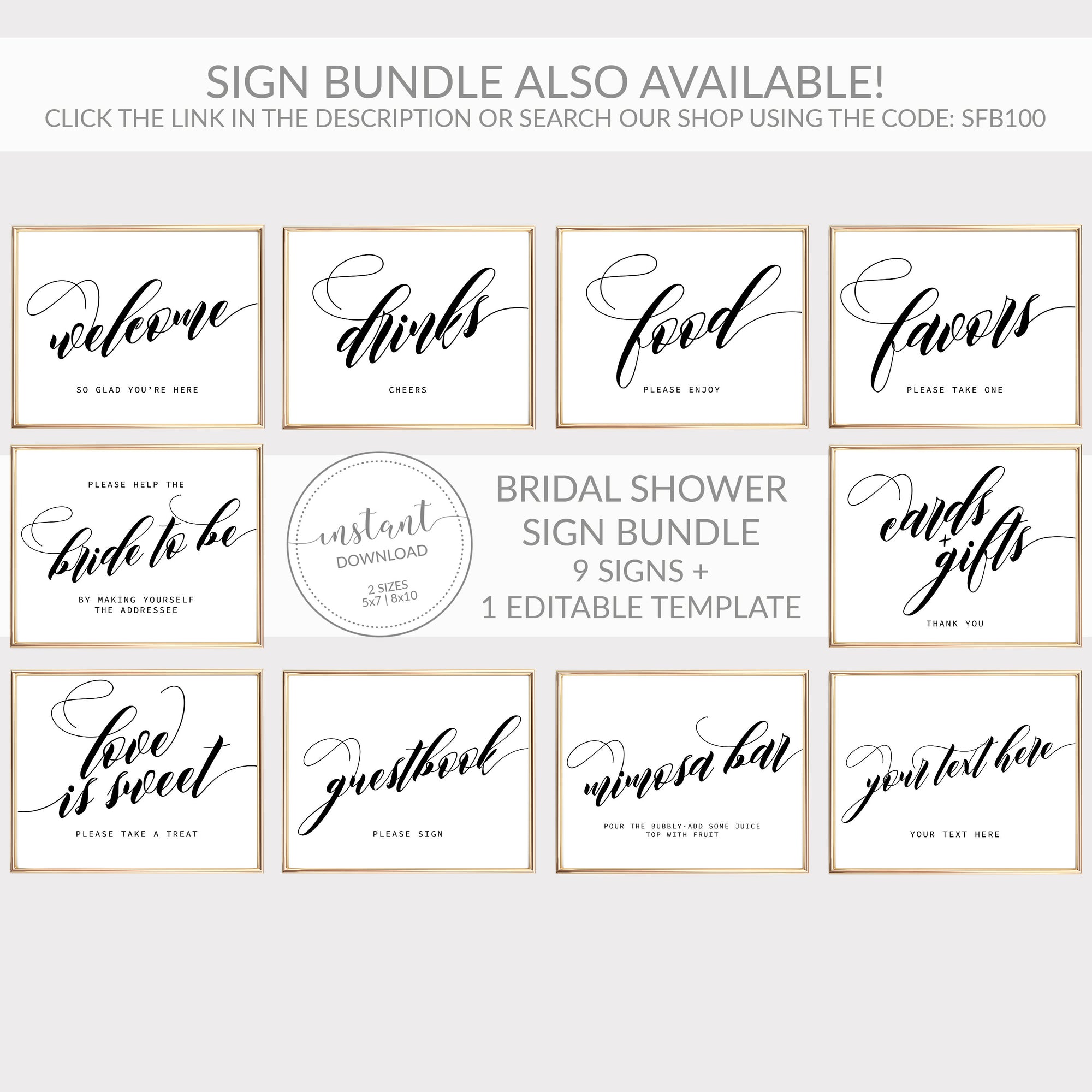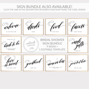 This bridal shower welcome sign is available as an INSTANT DOWNLOAD editable template. Edit right in your browser using the online program, Templett. No software to download or fonts to install and you can even try it out before you buy!