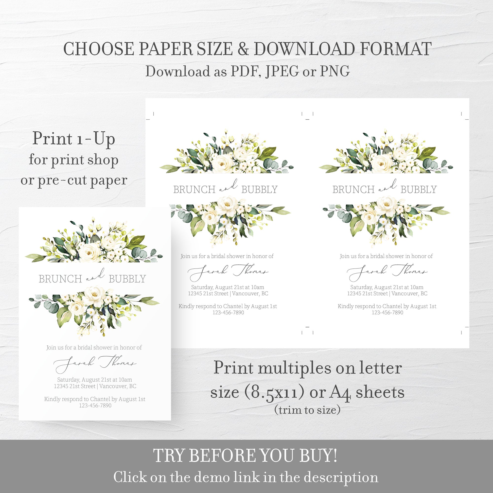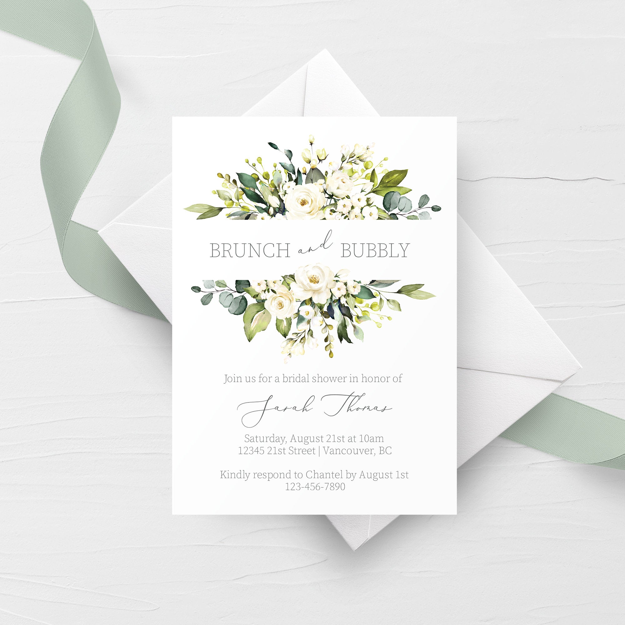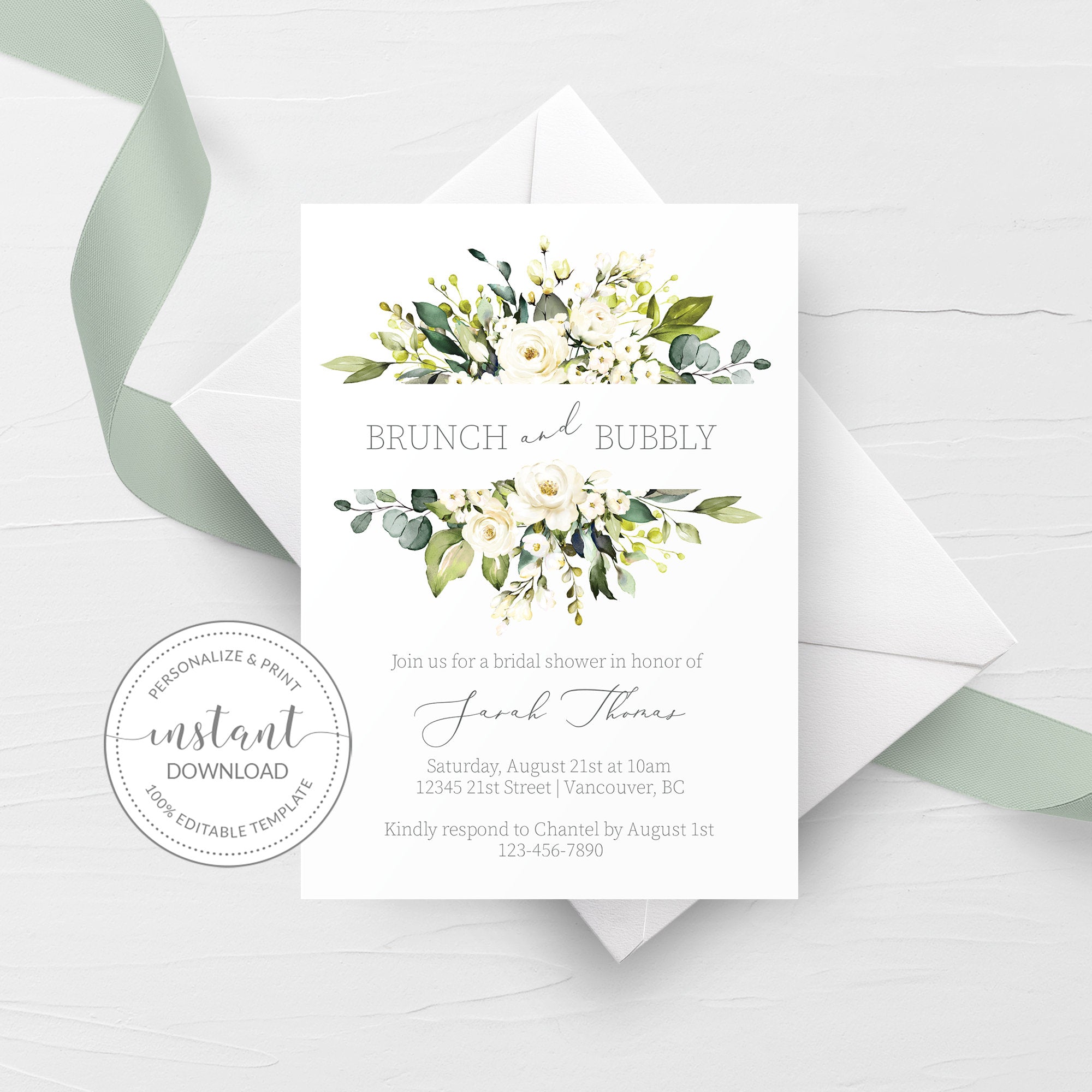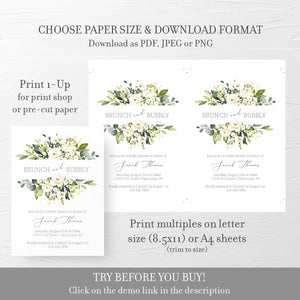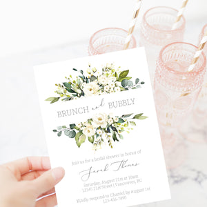 White Floral Greenery Brunch and Bubbly Bridal Shower Invitation Template, Printable Bridal Shower Invite 5x7, Editable INSTANT DOWNLOAD - WRG100