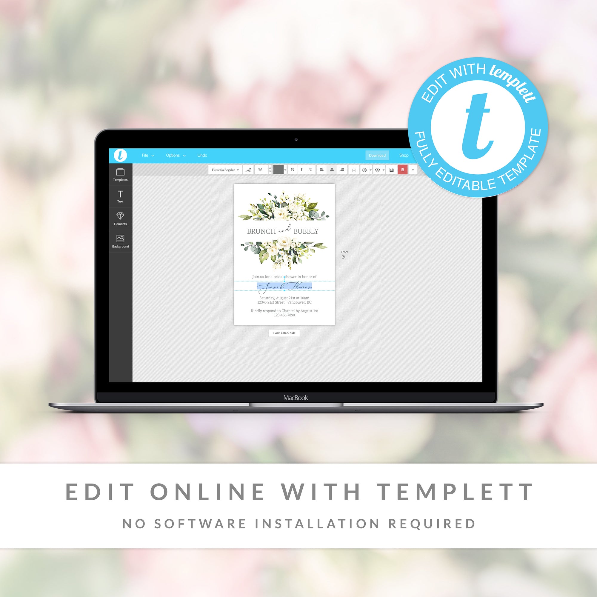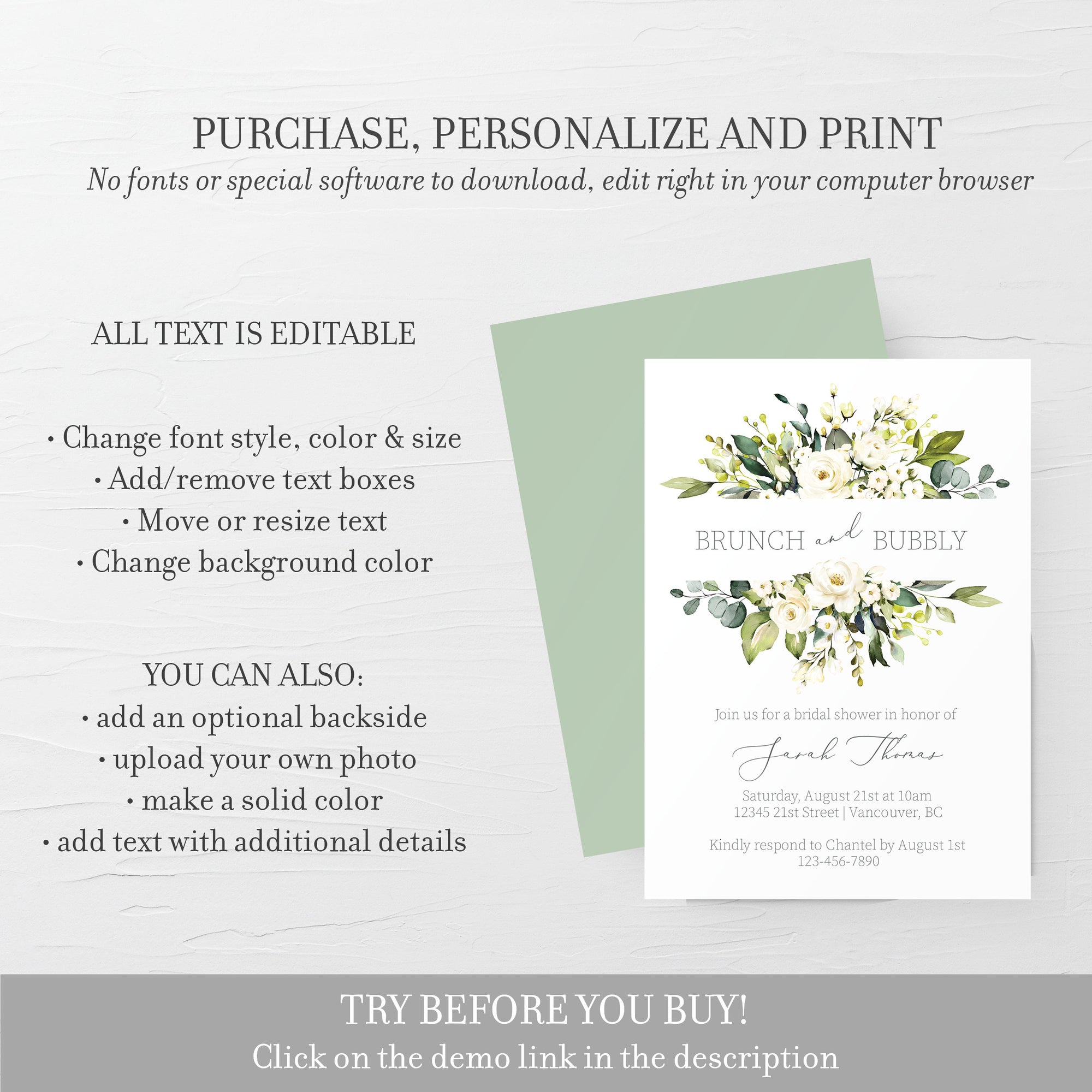 This creamy white floral greenery bridal shower invitation is available as an INSTANT DOWNLOAD editable template. Edit right in your browser using the online program, Templett. No software to download or fonts to install and you can even try it out before you buy!