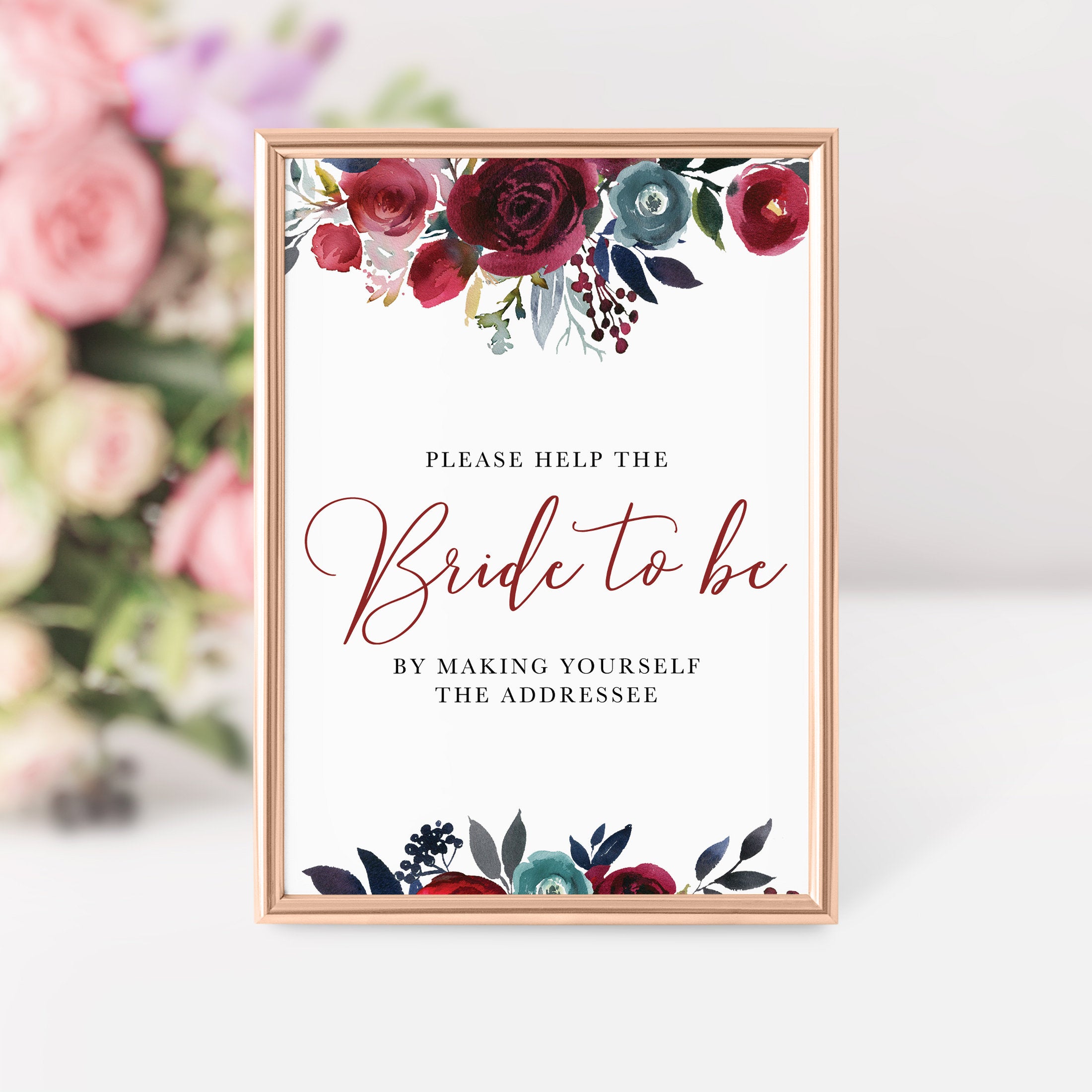 Burgundy and Navy Bridal Shower Address an Envelope Sign, Printable Boho Help The Bride To Be Sign, INSTANT DOWNLOAD - BB100