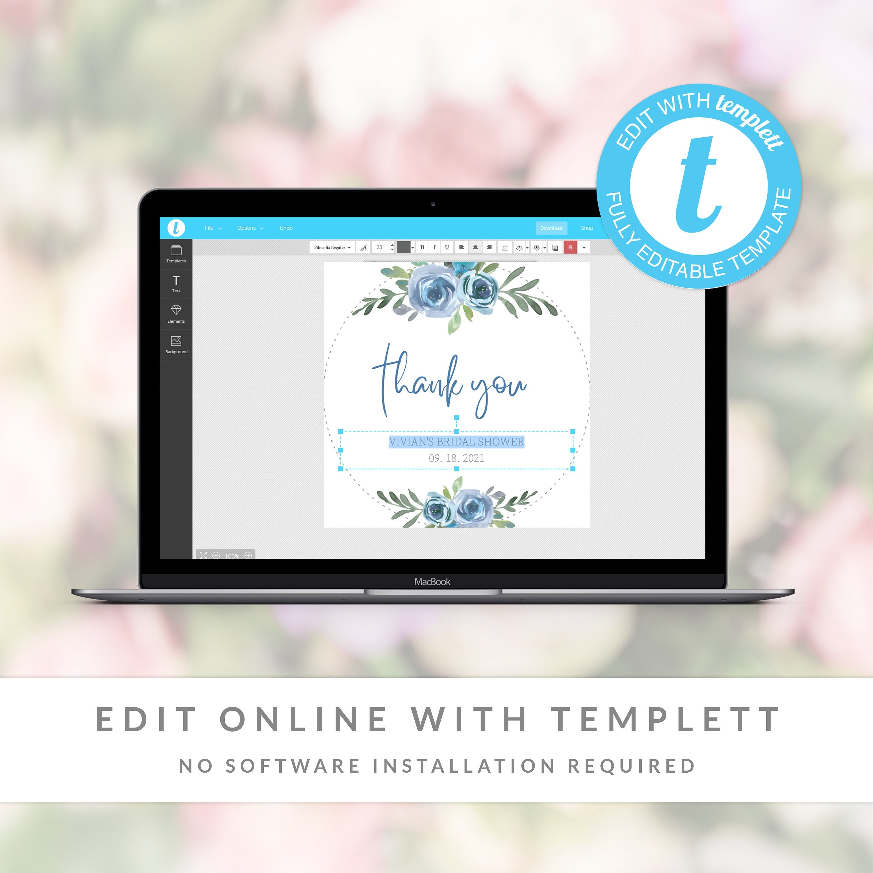 Blue Floral Bridal Shower Favor Tags Template, Printable Thank You Tags, Round Square or Rectangle, Editable INSTANT DOWNLOAD - BF100