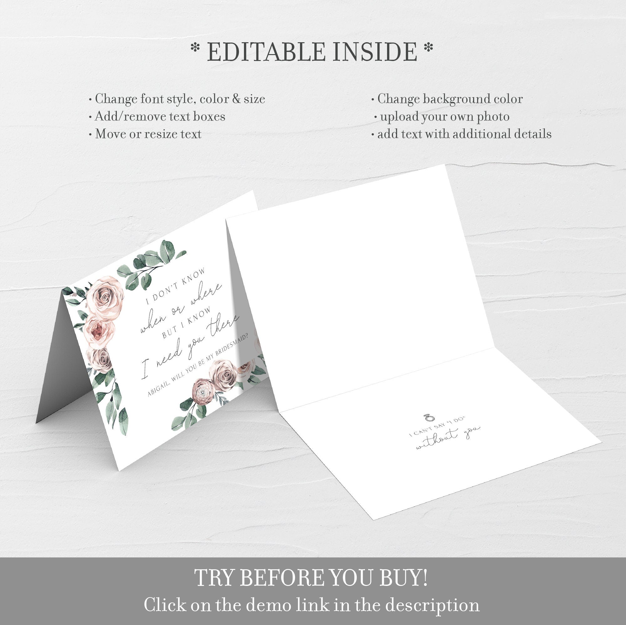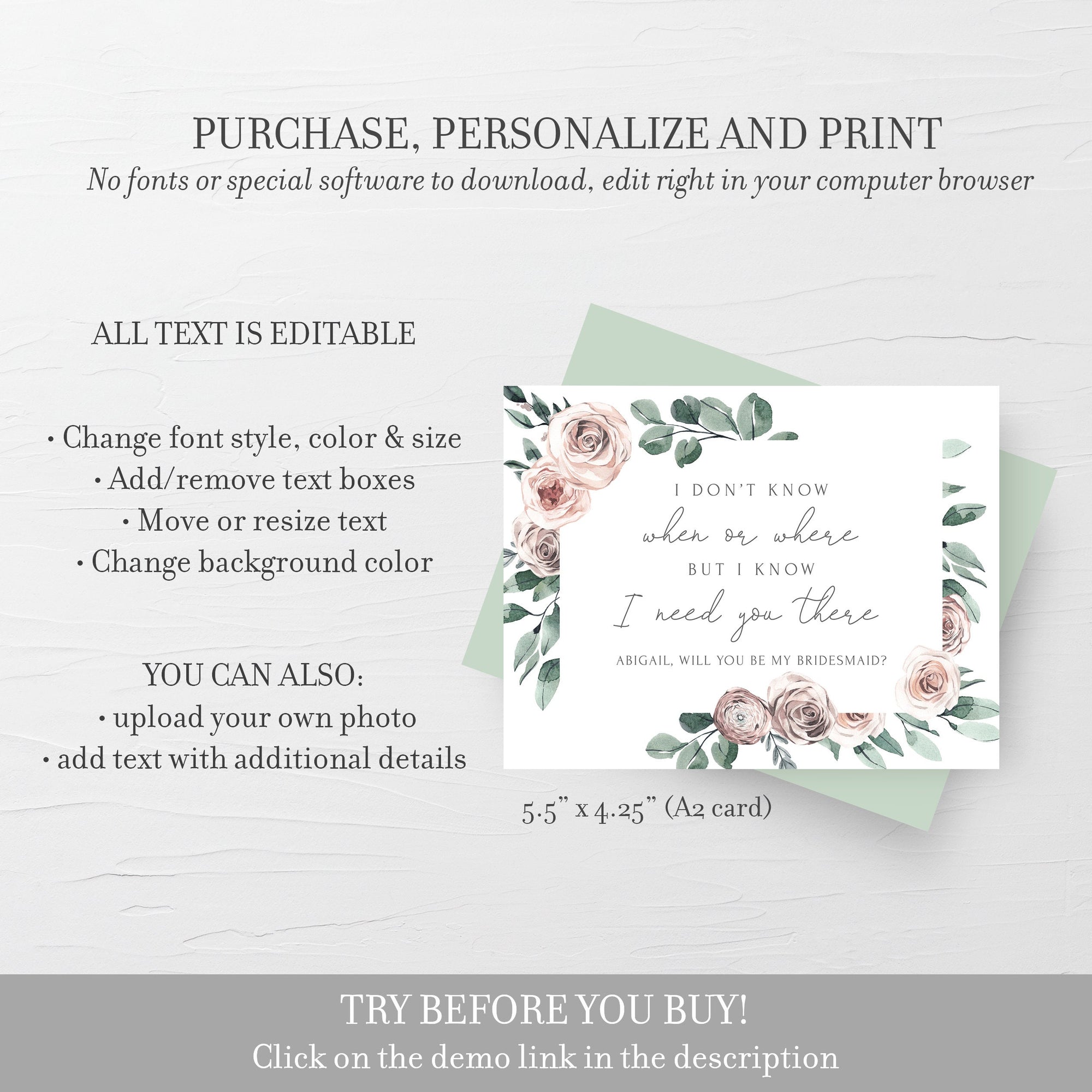 Boho Rose Funny Bridesmaid Proposal Card Template, Printable Need You There Bridesmaid Card, Editable INSTANT DOWNLOAD, A2 Size - BR100
