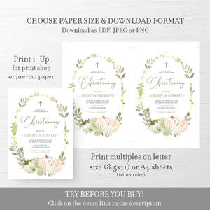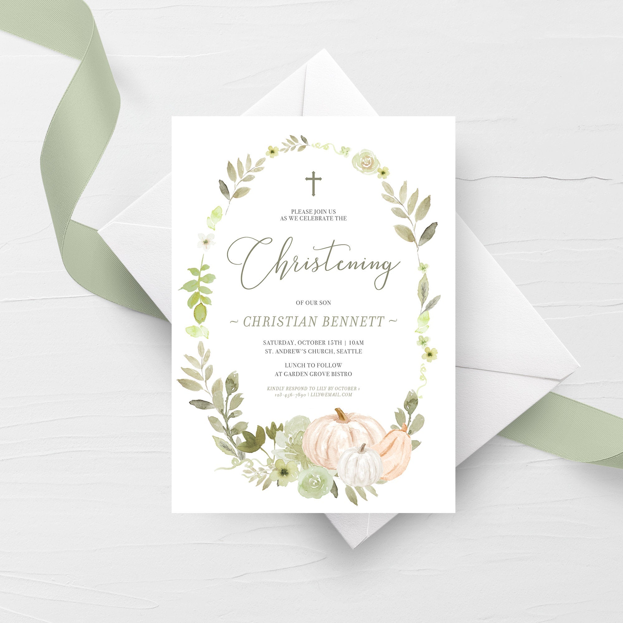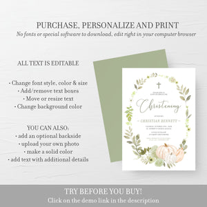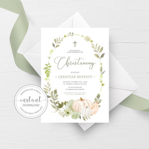 Fall Greenery Christening Invitation Template, Printable Pumpkin Invite, Editable INSTANT DOWNLOAD - PG100
