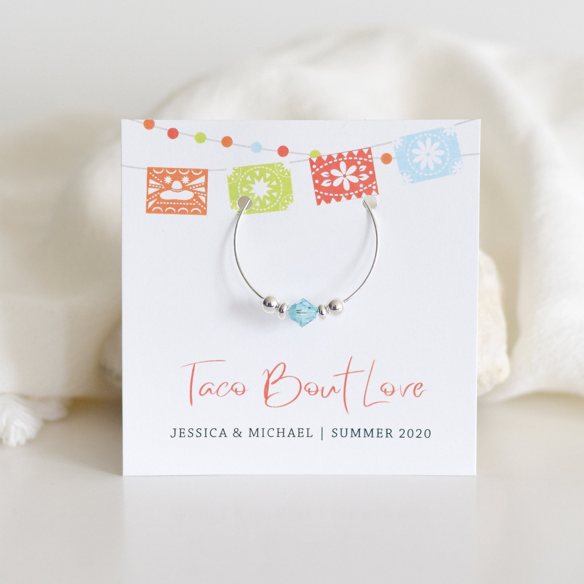 Taco Bout Love!! Our Swarovski crystal wine charm favors are the perfect giveaway for your fiesta themed engagement party. A fun and unique way to say 'thank you' to your guests. Every time they use the charms, they will think of the fabulous details and awesome time they had in anticipation of the big day!