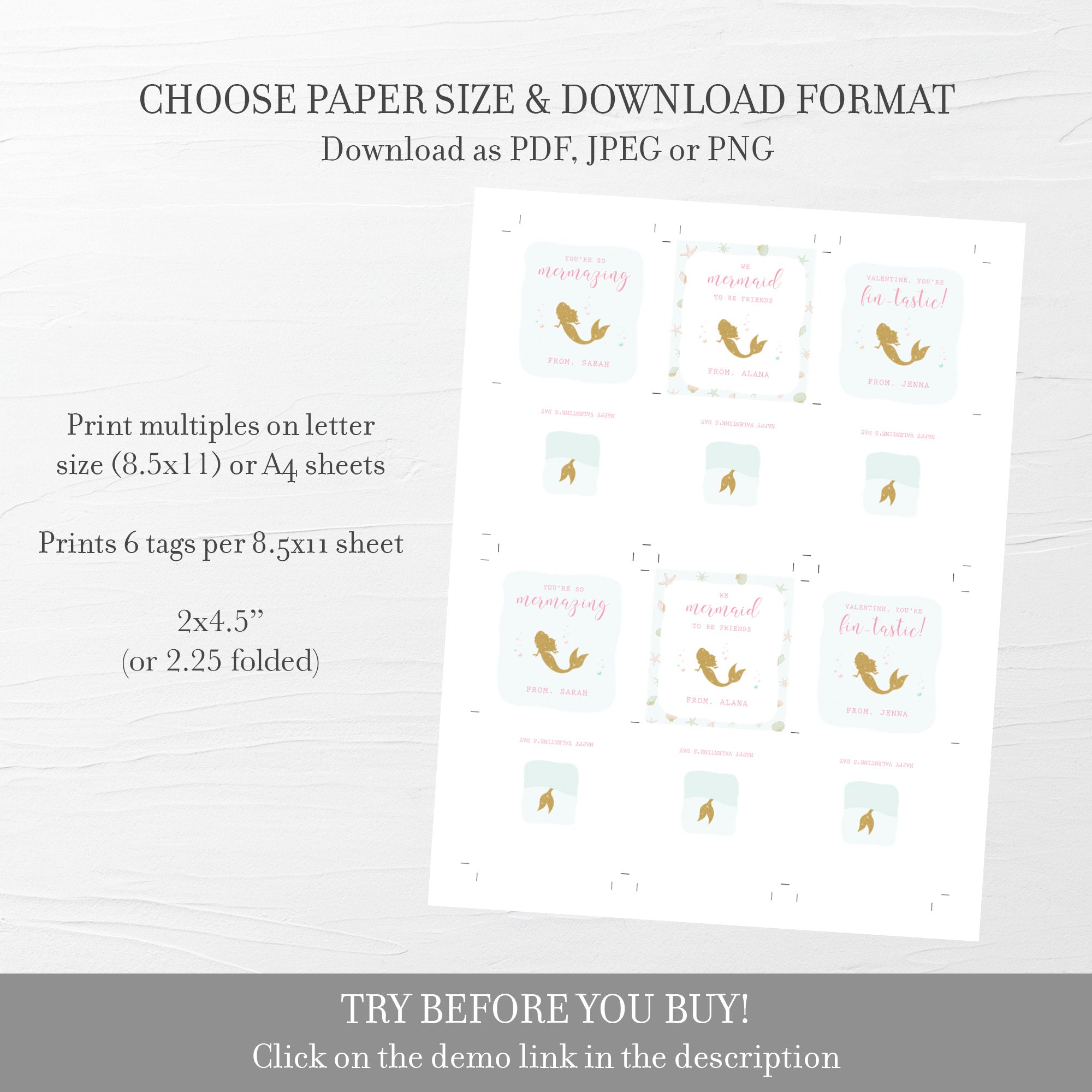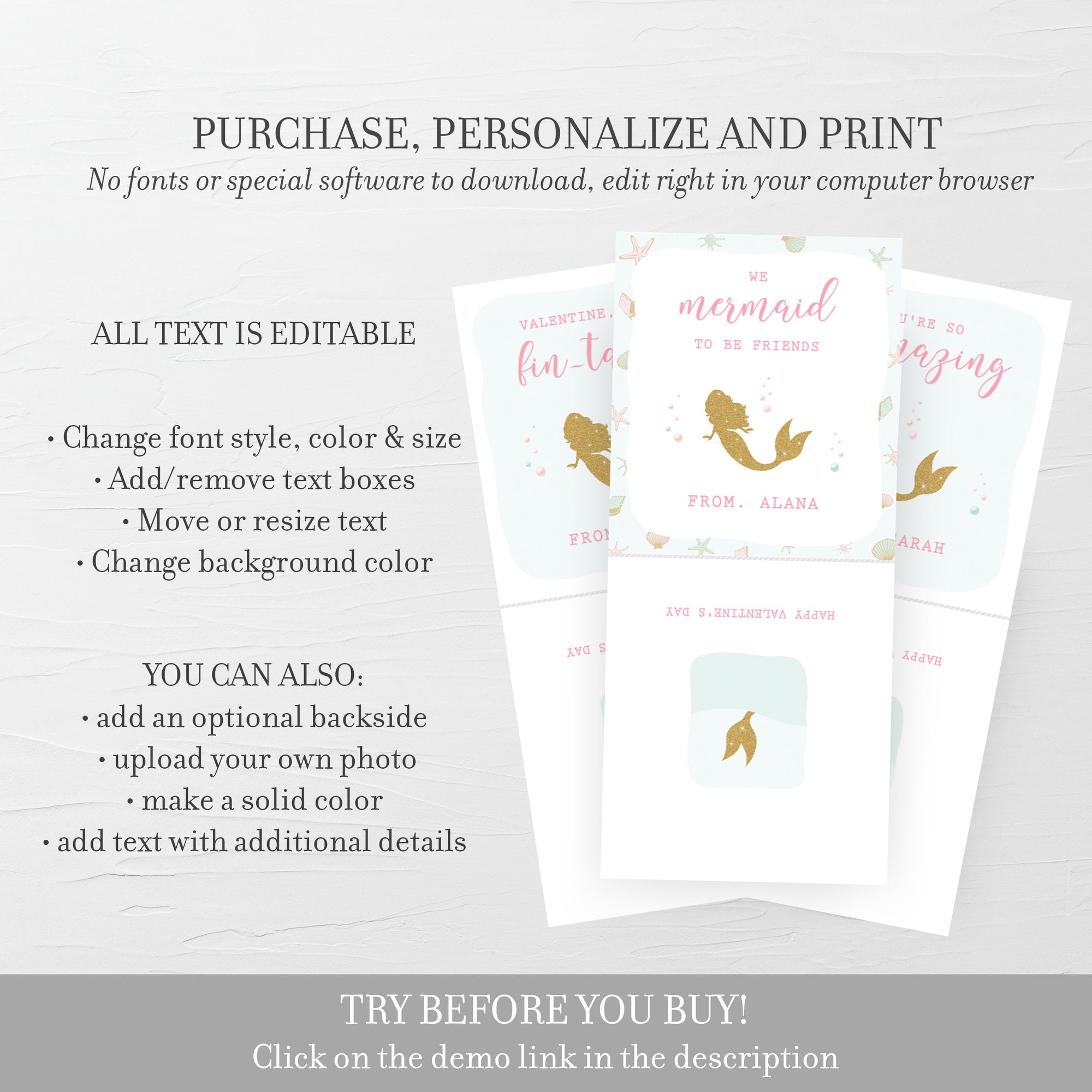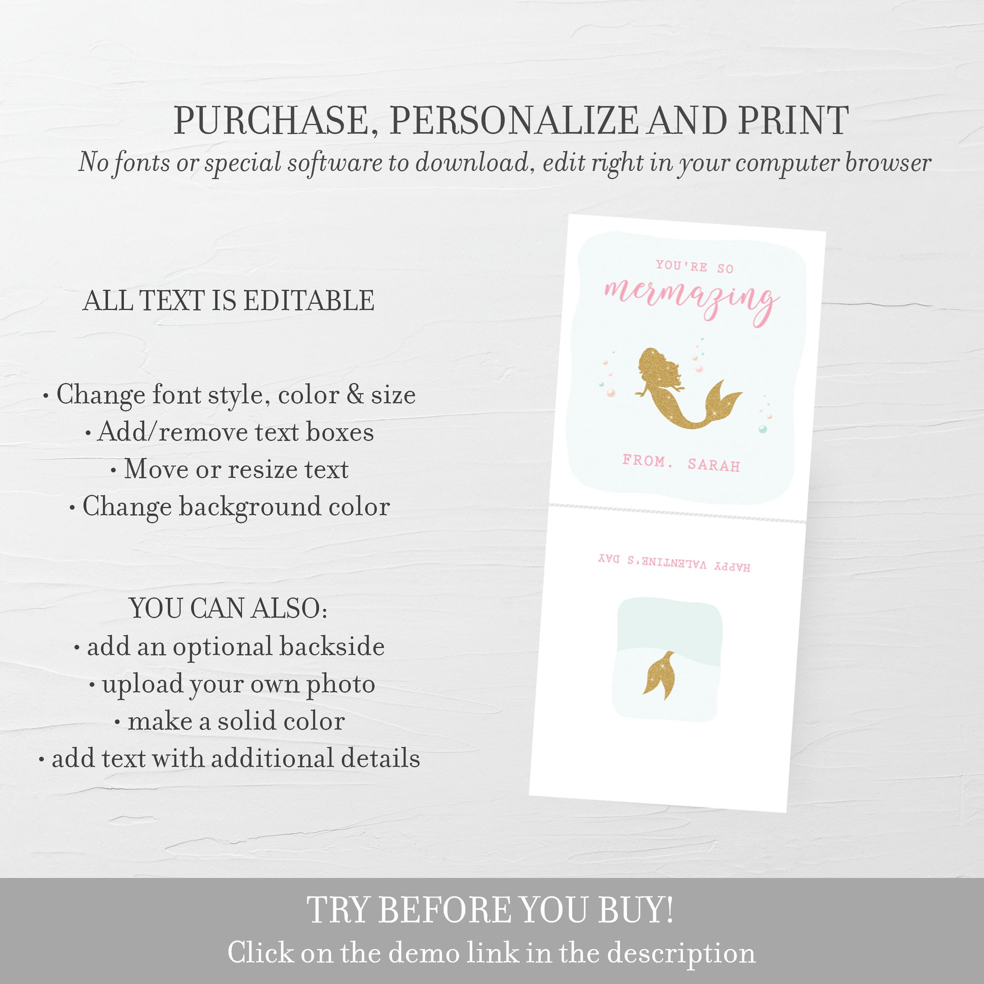 Mermaid Valentine Card Template for Hair Scrunchies, Printable Mermaid Valentine's Day Scrunchie Tag, Editable INSTANT DOWNLOAD - M100