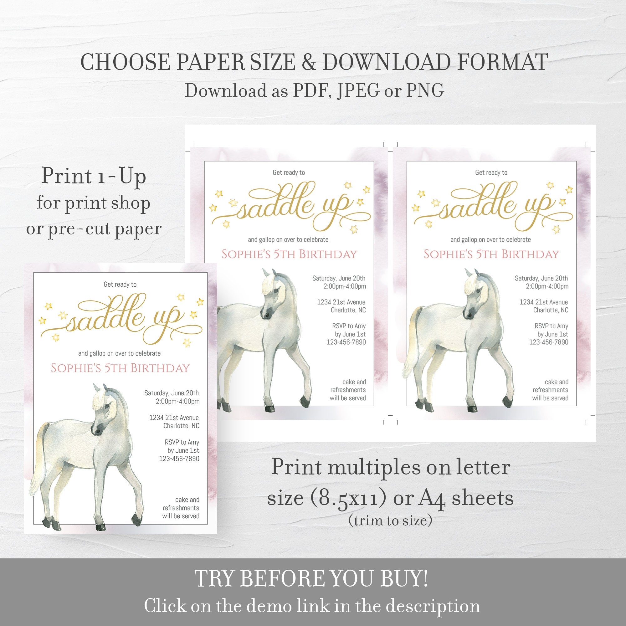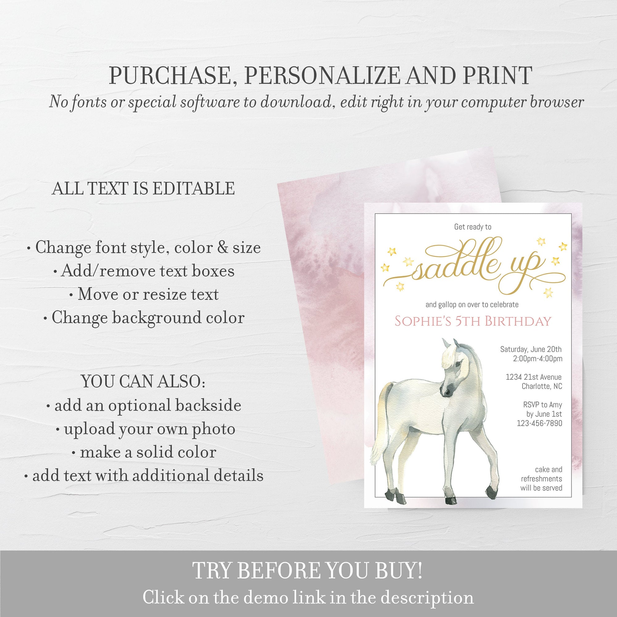 This horse invitation is available as an INSTANT DOWNLOAD editable template. Edit right in your browser using the online program, Templett. No software to download or fonts to install and you can even try it out before you buy!
