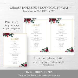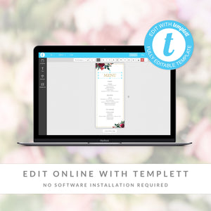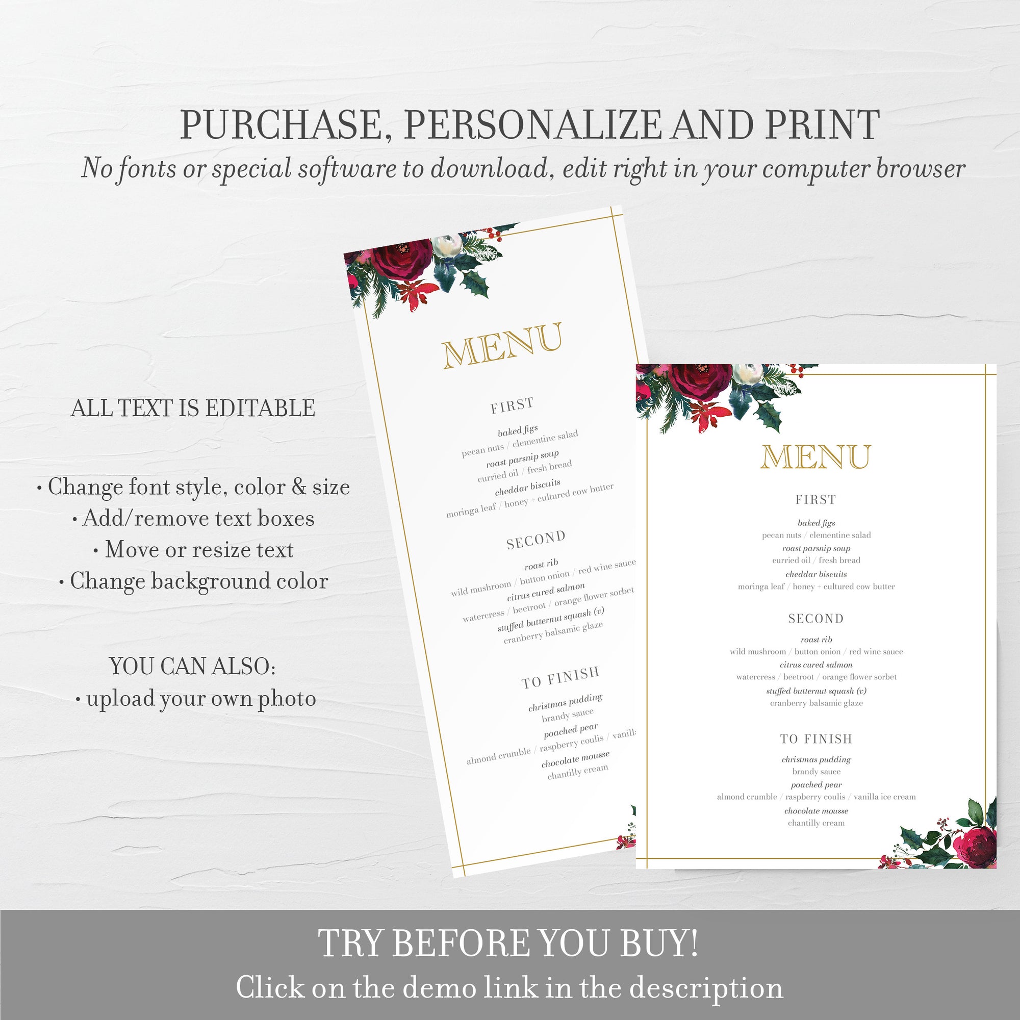 This Christmas menu card is available as an INSTANT DOWNLOAD editable template. Edit right in your browser using the online program, Templett. No software to download or fonts to install and you can even try it out before you buy!
