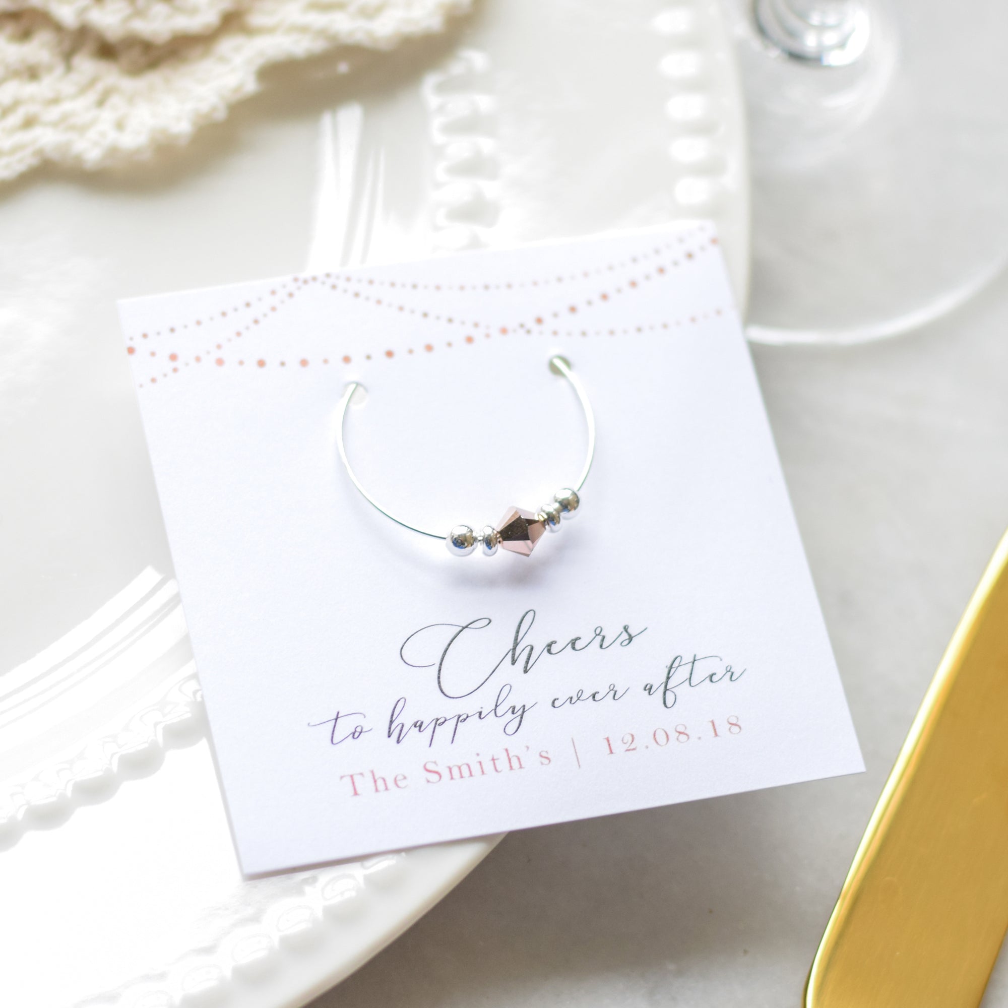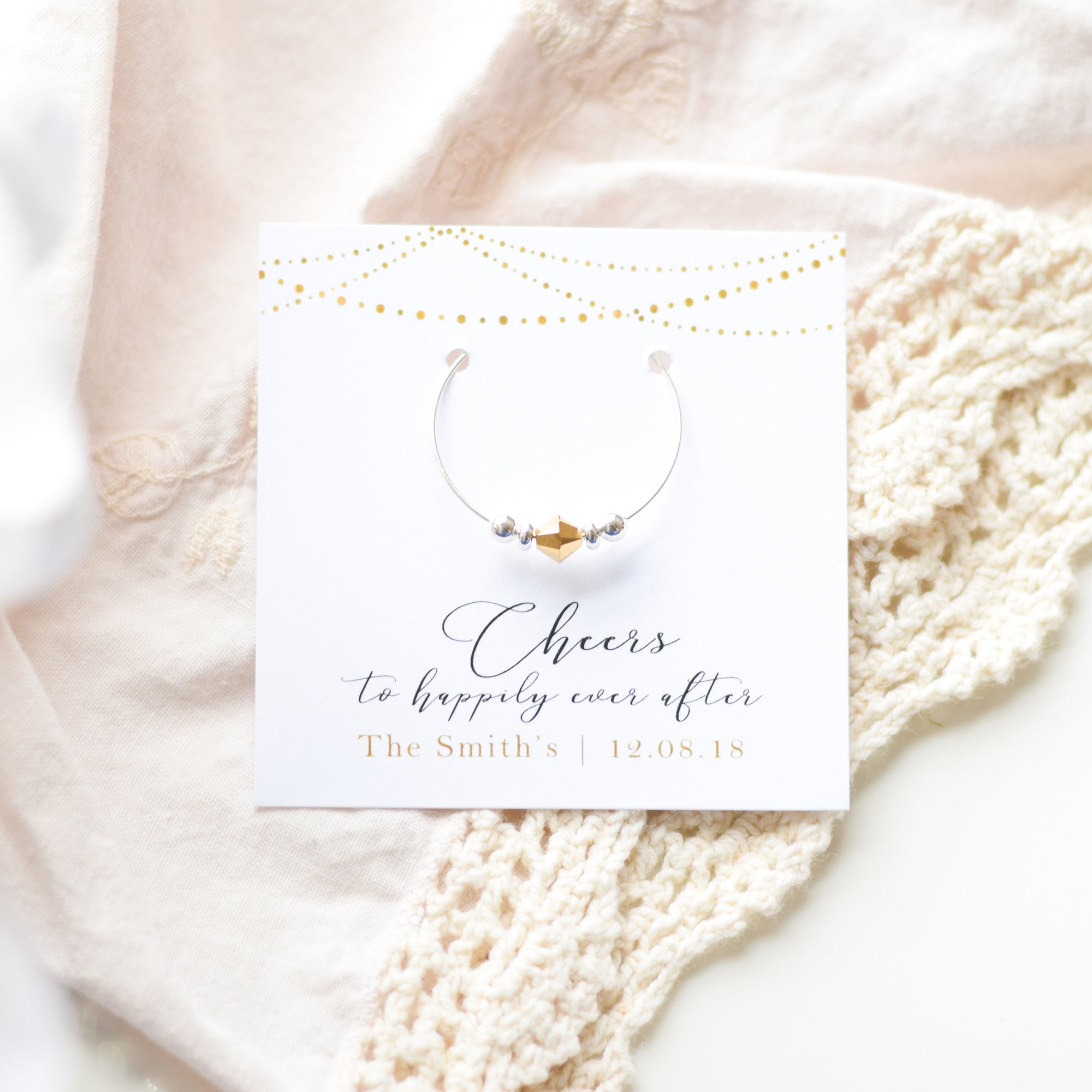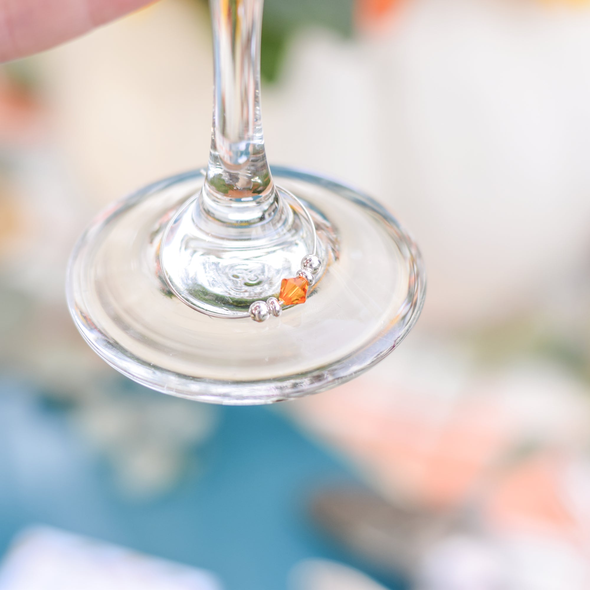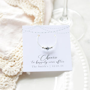 Each Swarovski crystal wine charm comes affixed to a personalized card and packaged in a clear cello envelope, perfect for gifting to your guests.
