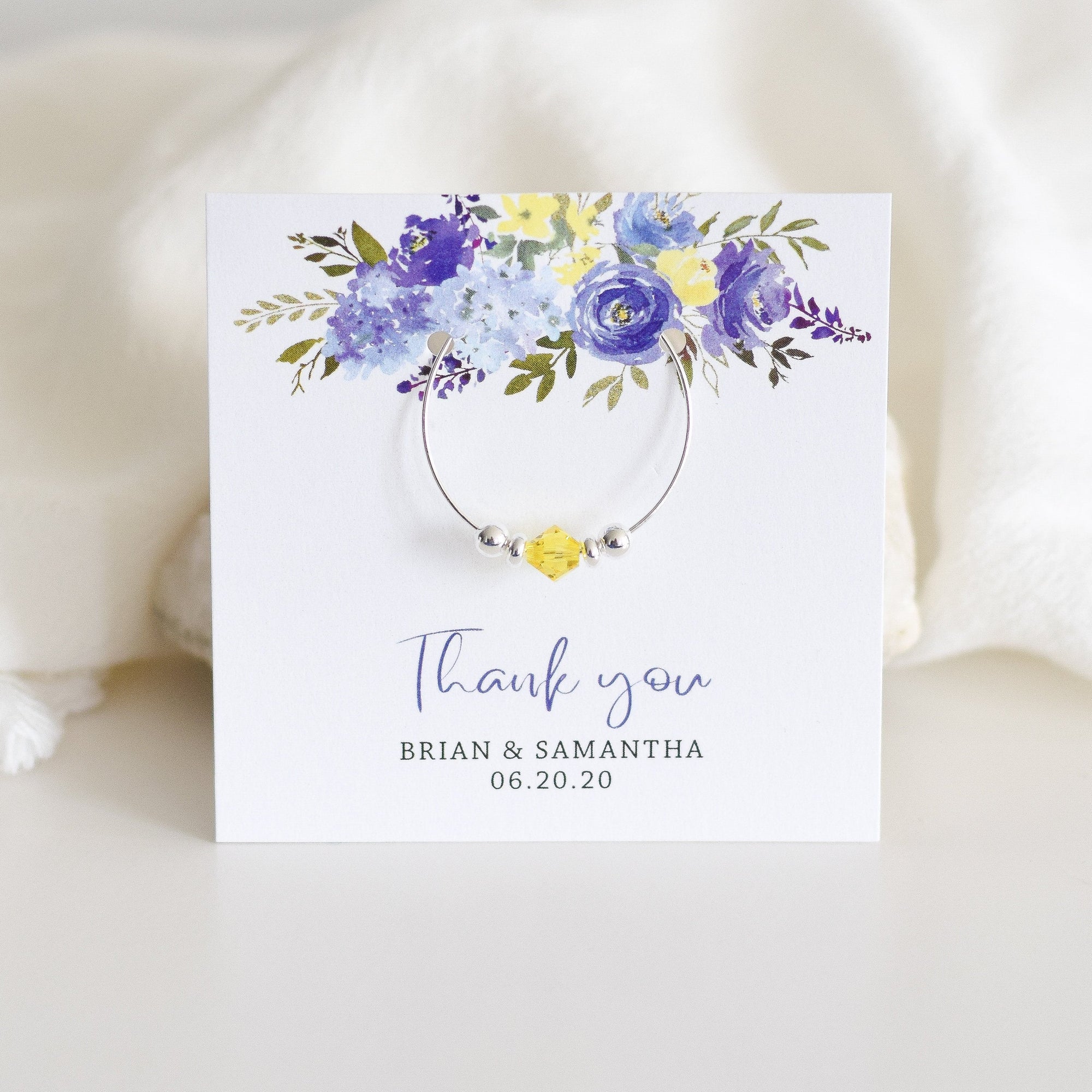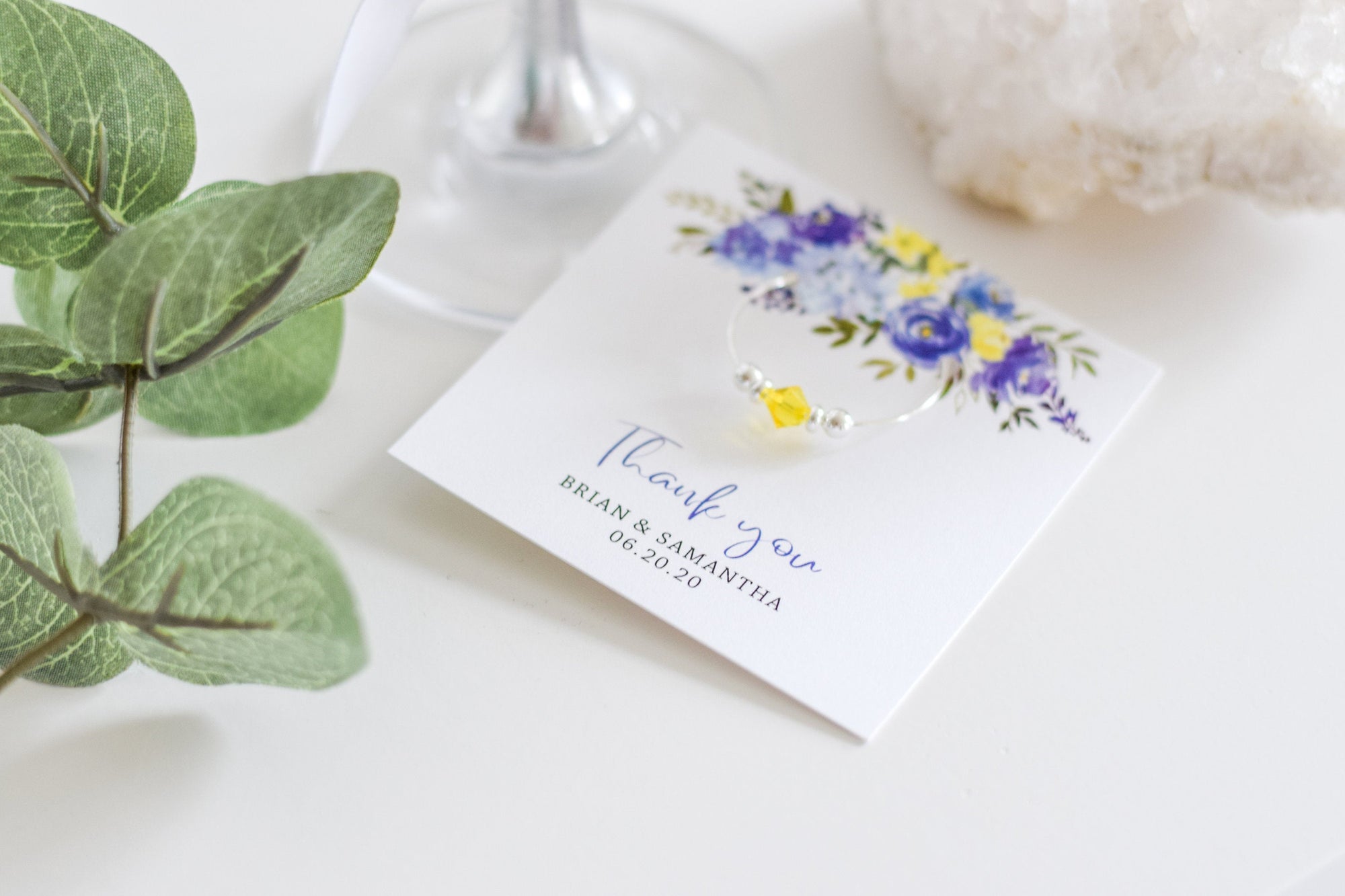 Each Swarovski crystal wine charm comes affixed to a card and packaged in a clear cello envelope, perfect for gifting to your guests.