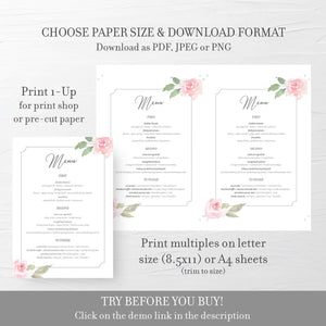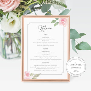 Blush Pink Floral Wedding Menu Template, Printable, Editable INSTANT DOWNLOAD - FR100