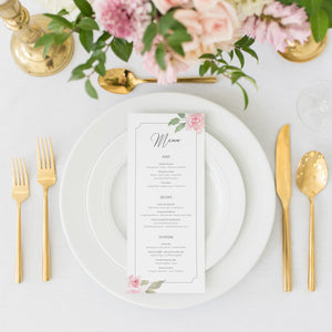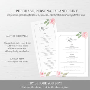 This pink floral menu card is available as an INSTANT DOWNLOAD editable template. Edit right in your browser using the online program, Templett. No software to download or fonts to install and you can even try it out before you buy!