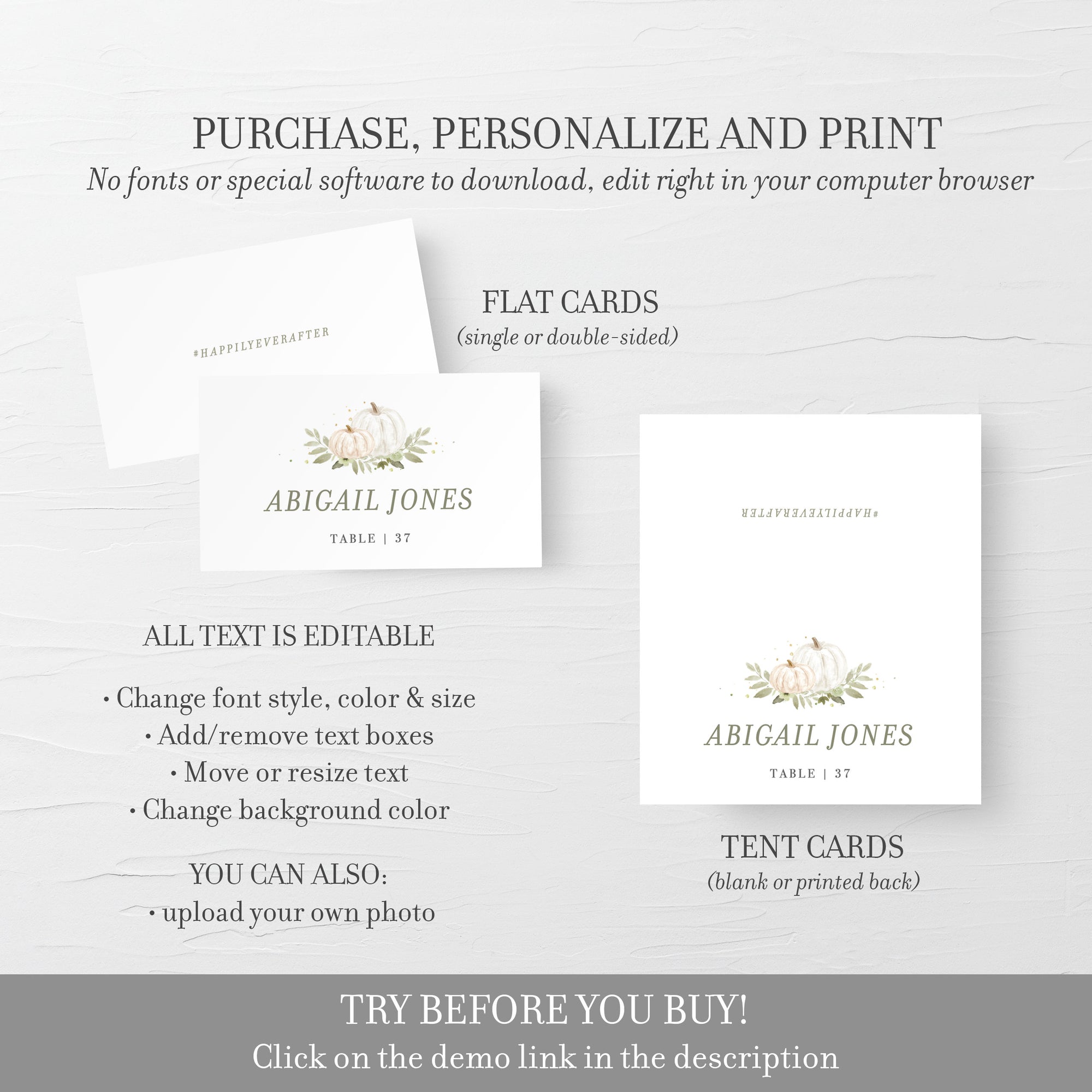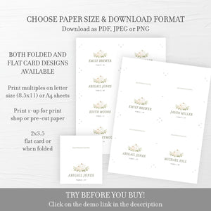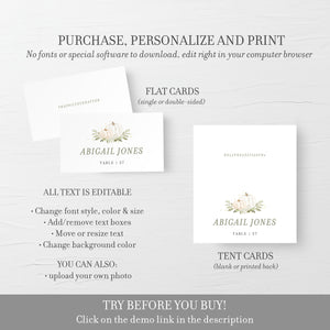 These place cards are available as an INSTANT DOWNLOAD editable template. Edit right in your browser using the online program, Templett. No software to download or fonts to install and you can even try it out before you buy!