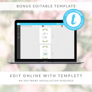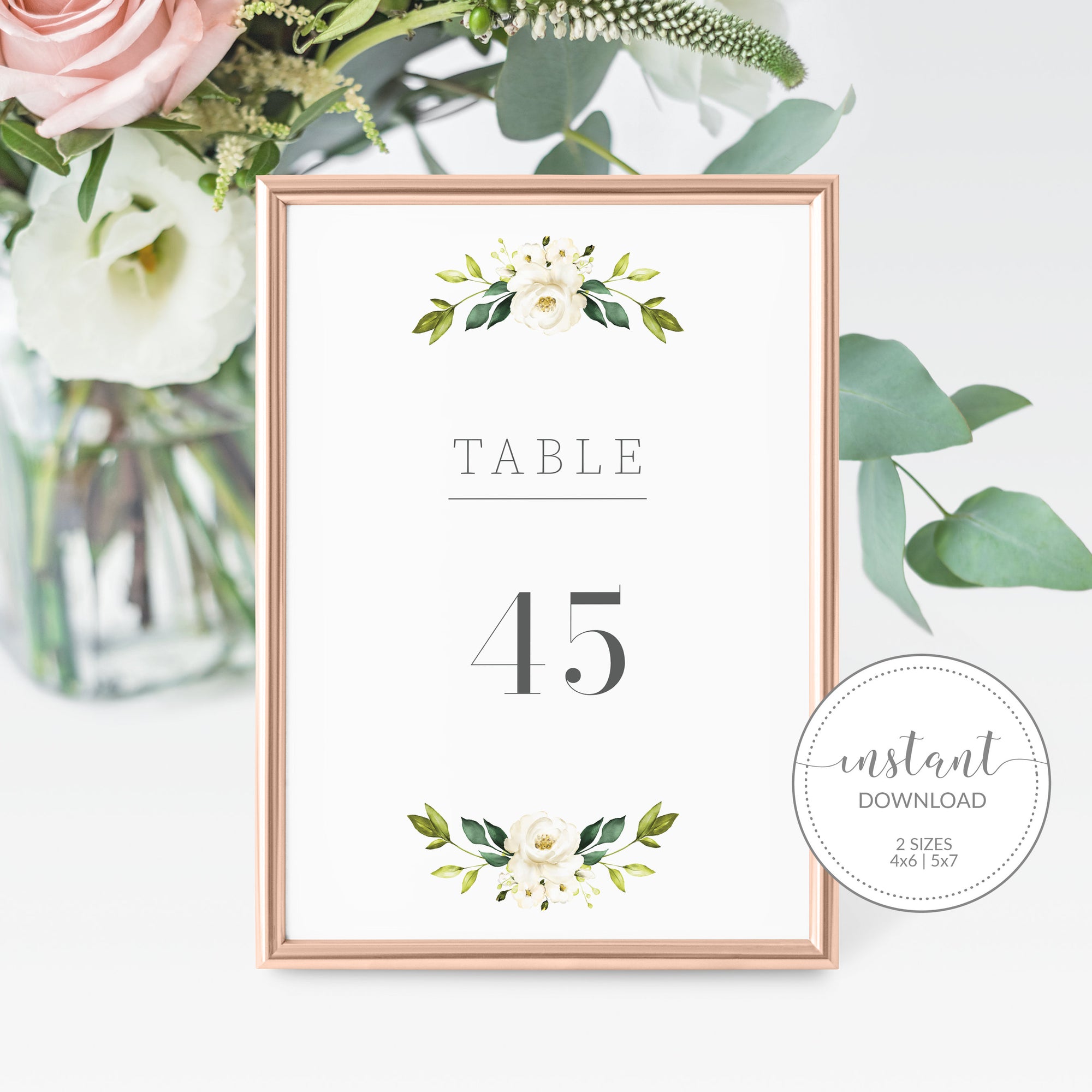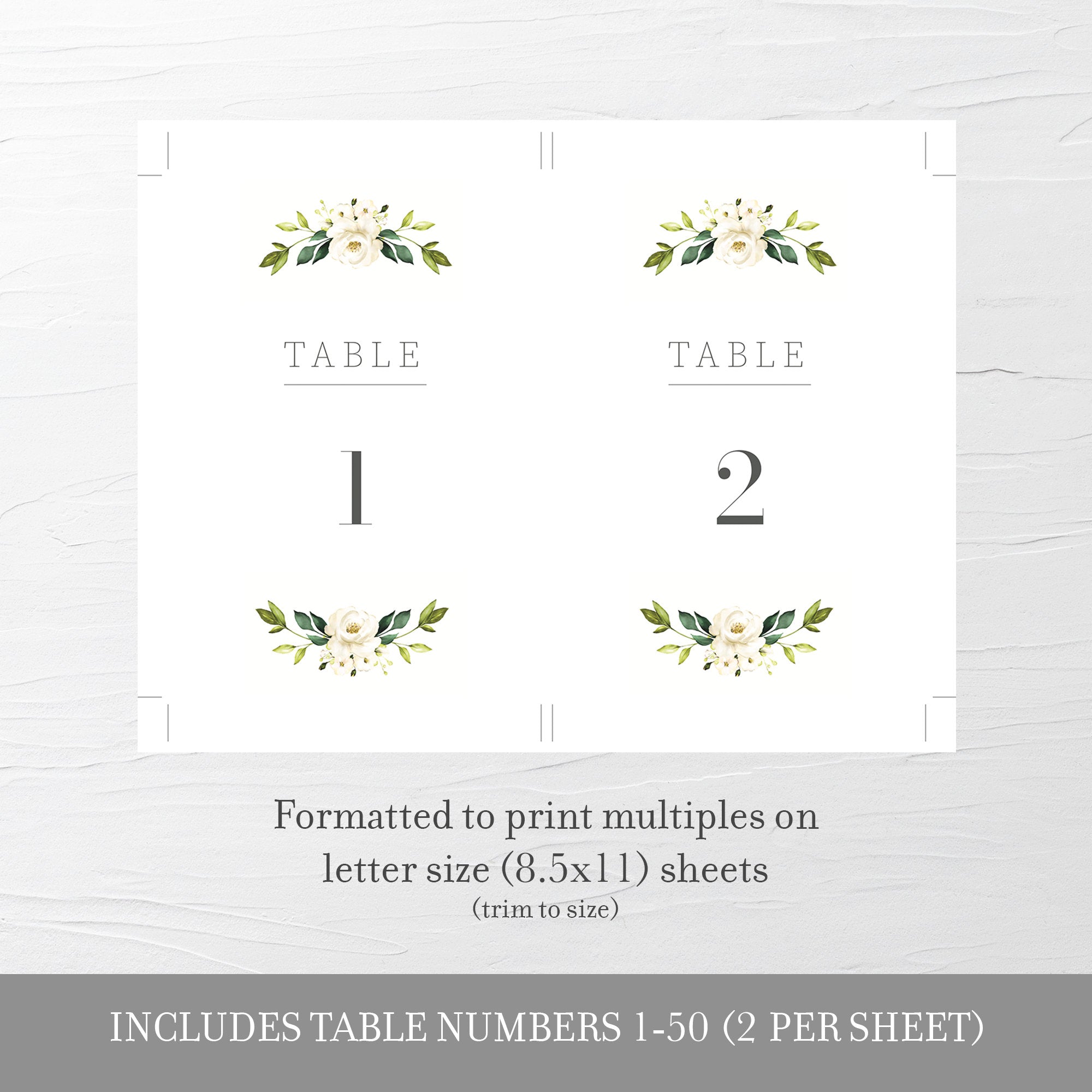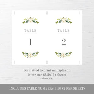White Floral Greenery Wedding Table Numbers 1-50 Template, Printable Table Number Cards, Editable INSTANT DOWNLOAD - WRG100
