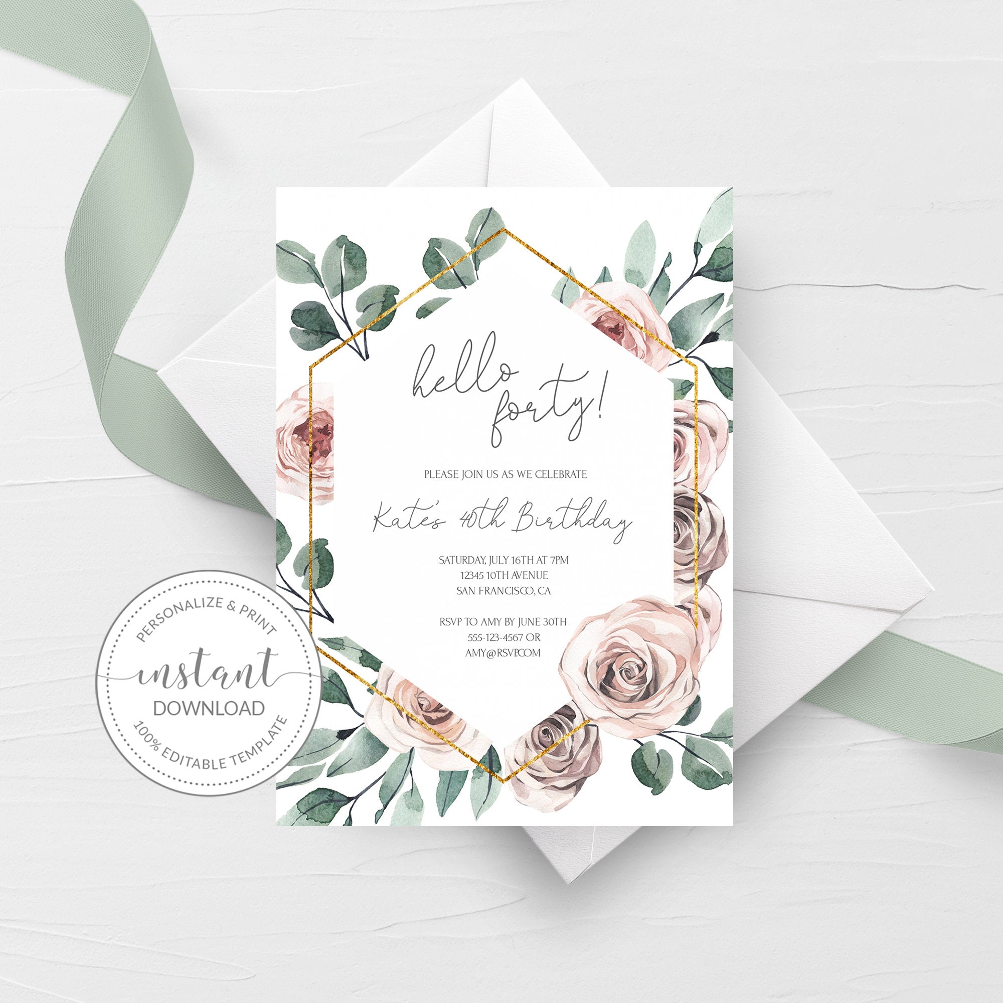 Boho Rose 40th Birthday Invitation Template, Printable Party Invite, Editable INSTANT DOWNLOAD - BR100