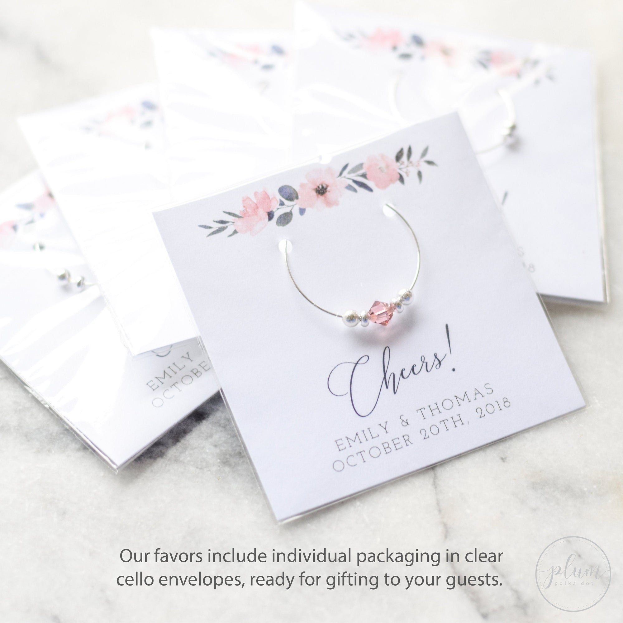 Each gold Swarovski crystal wine glass charm comes affixed to a personalized card and packaged in a clear cello envelope, perfect for gifting to your guests.