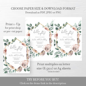 Boho Rose 80th Birthday Invitation Template, Printable Party Invite, Editable INSTANT DOWNLOAD - BR100