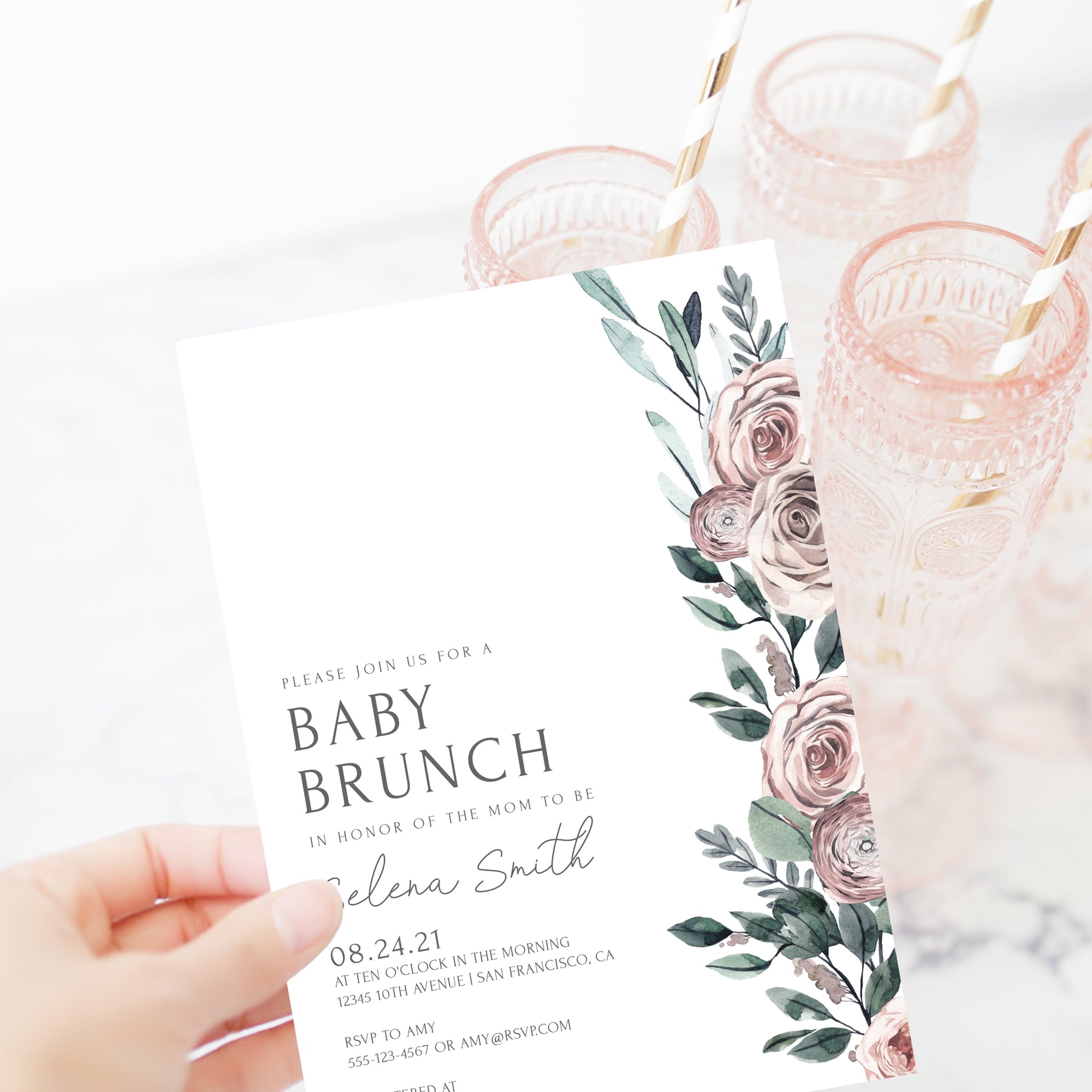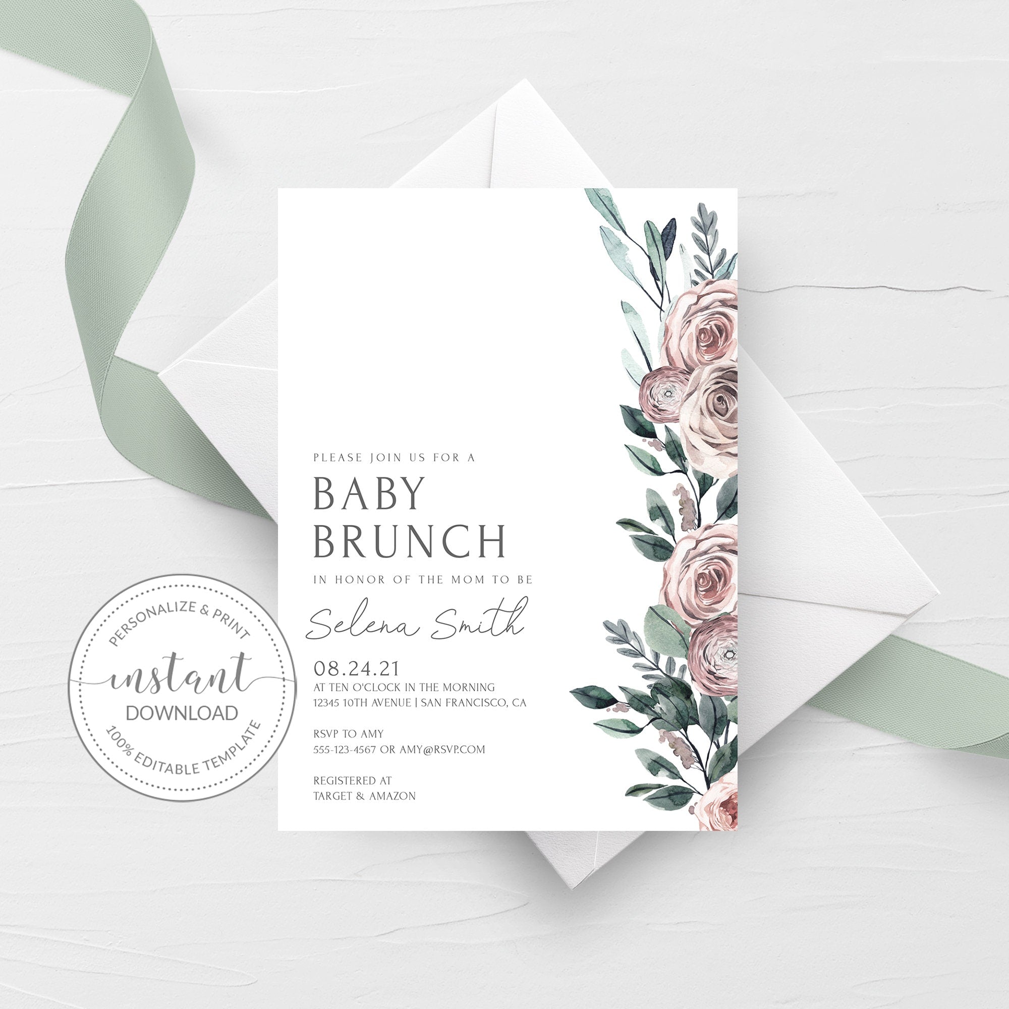 Boho Rose Baby Shower Brunch Invitation Template, Printable Shower Invite, Editable INSTANT DOWNLOAD - BR100