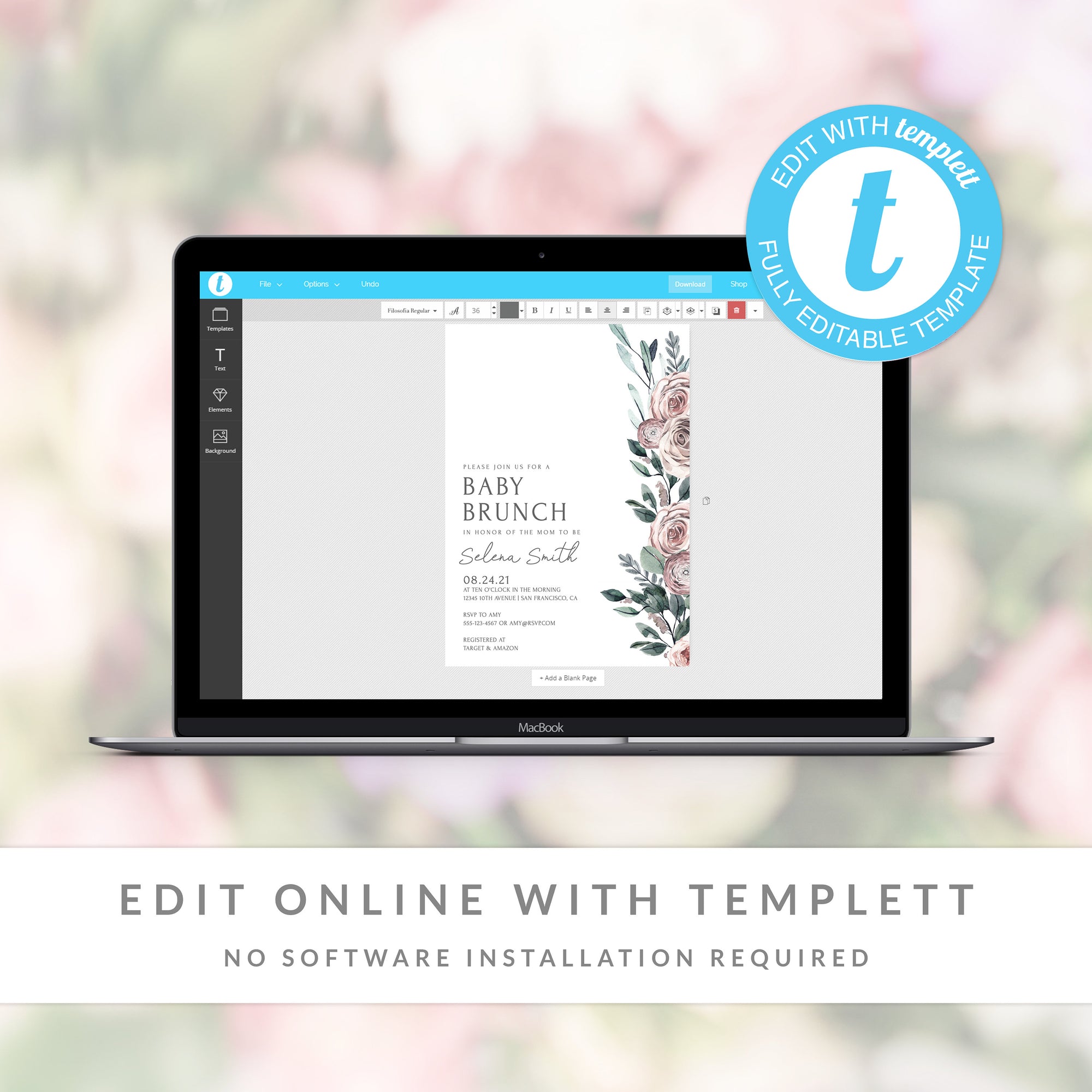 This baby shower brunch invitation is available as an INSTANT DOWNLOAD editable template. Edit right in your browser using the online program, Templett. No software to download or fonts to install and you can even try it out before you buy!