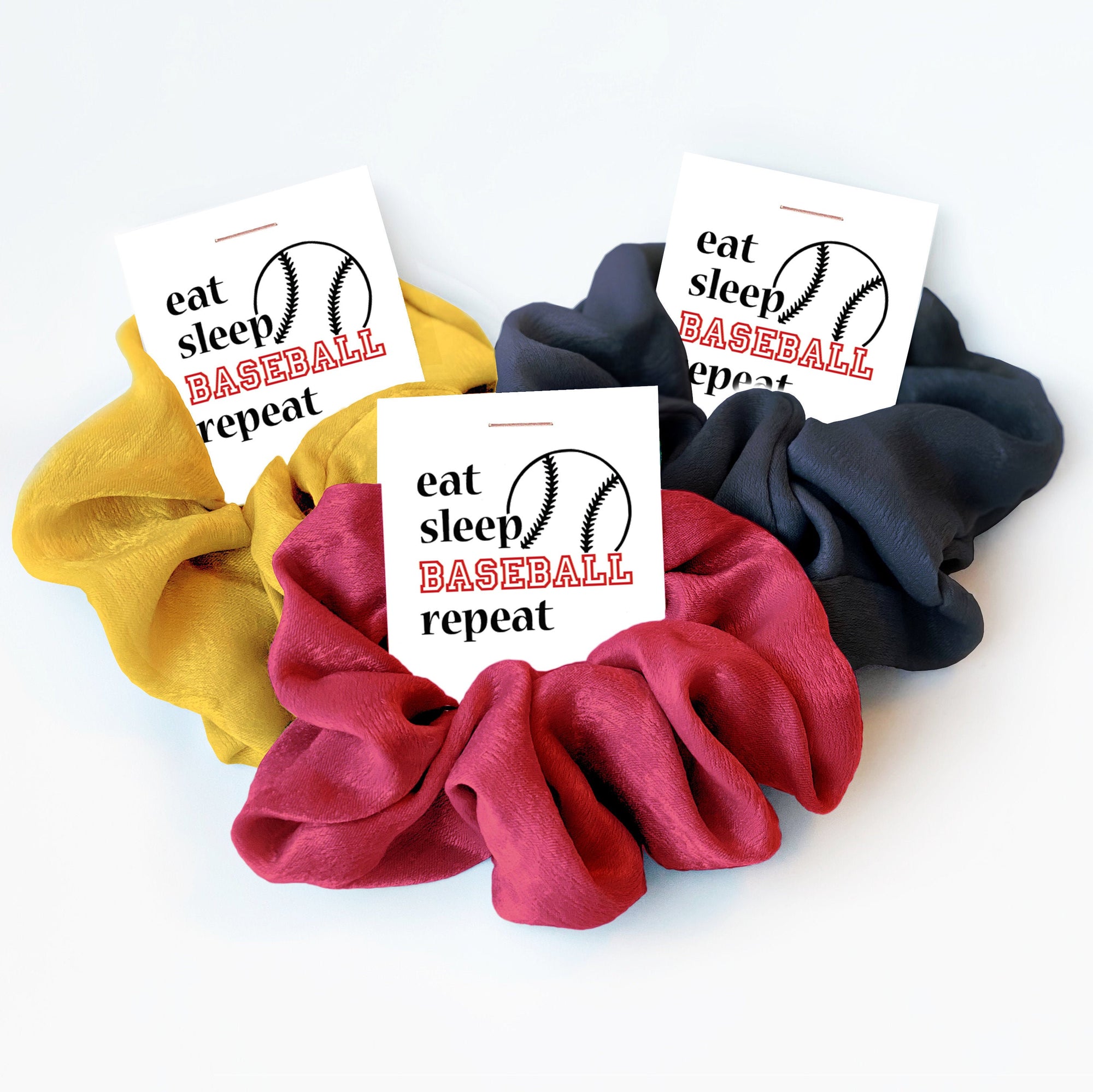 The tags come with the following message: "Eat Sleep Baseball Repeat". If you would like to add a line of personalized text below (for orders of 5+ scrunchies), write it in the notes at checkout.