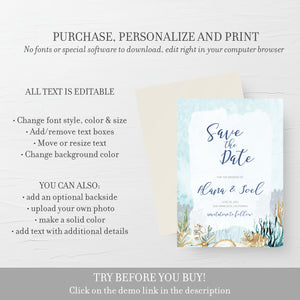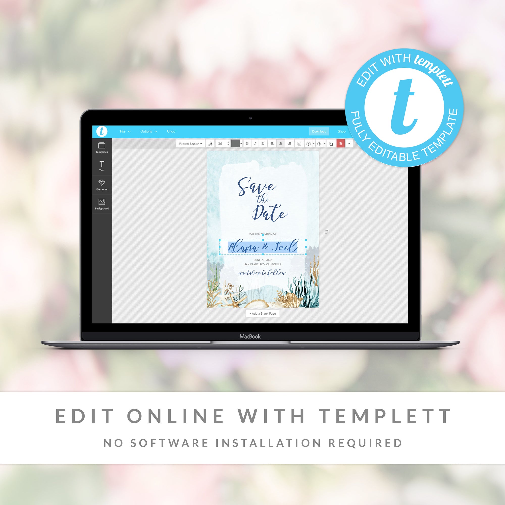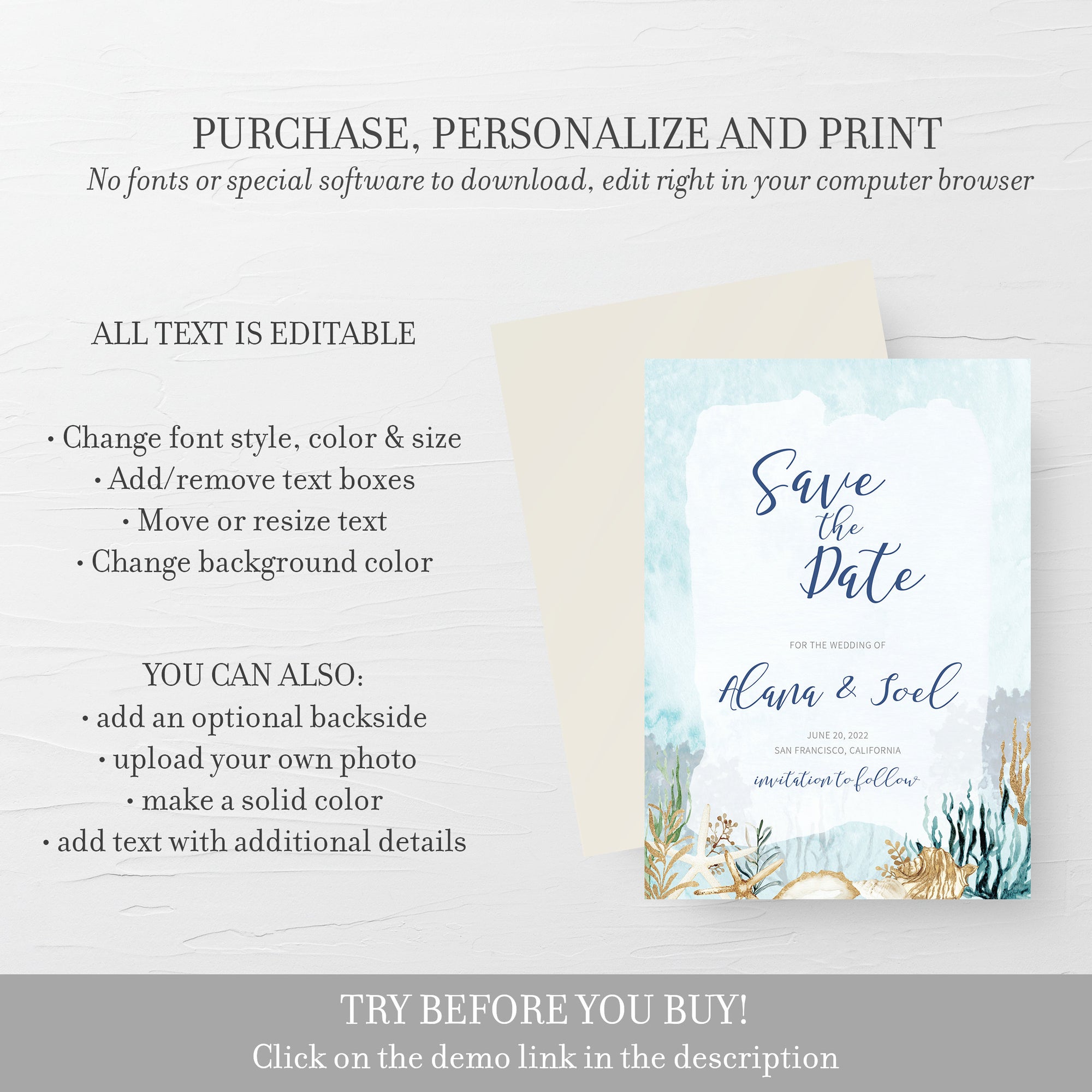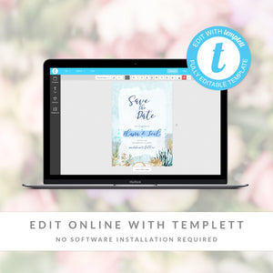This beachy save the date card is available as an INSTANT DOWNLOAD editable template. Edit right in your browser using the online program, Templett. No software to download or fonts to install and you can even try it out before you buy!