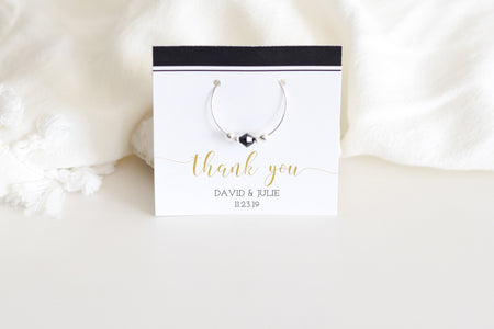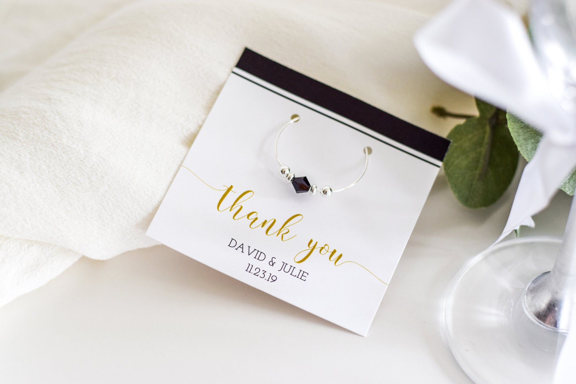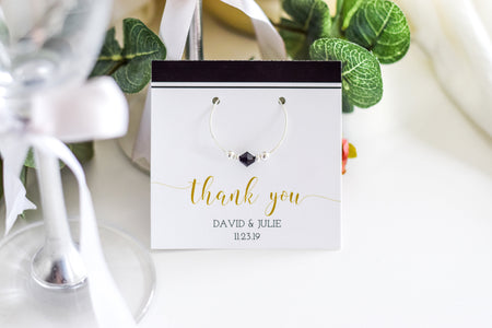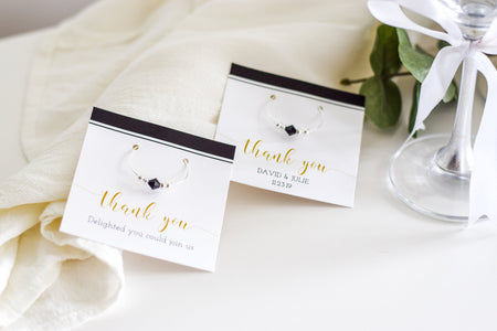Cheers to love! Our Swarovski crystal wine charms are an elegant and unique way to say 'thank you' to your guests. Every time they use the charms, they will think of the fabulous details and awesome time they had celebrating the marriage of two special people.