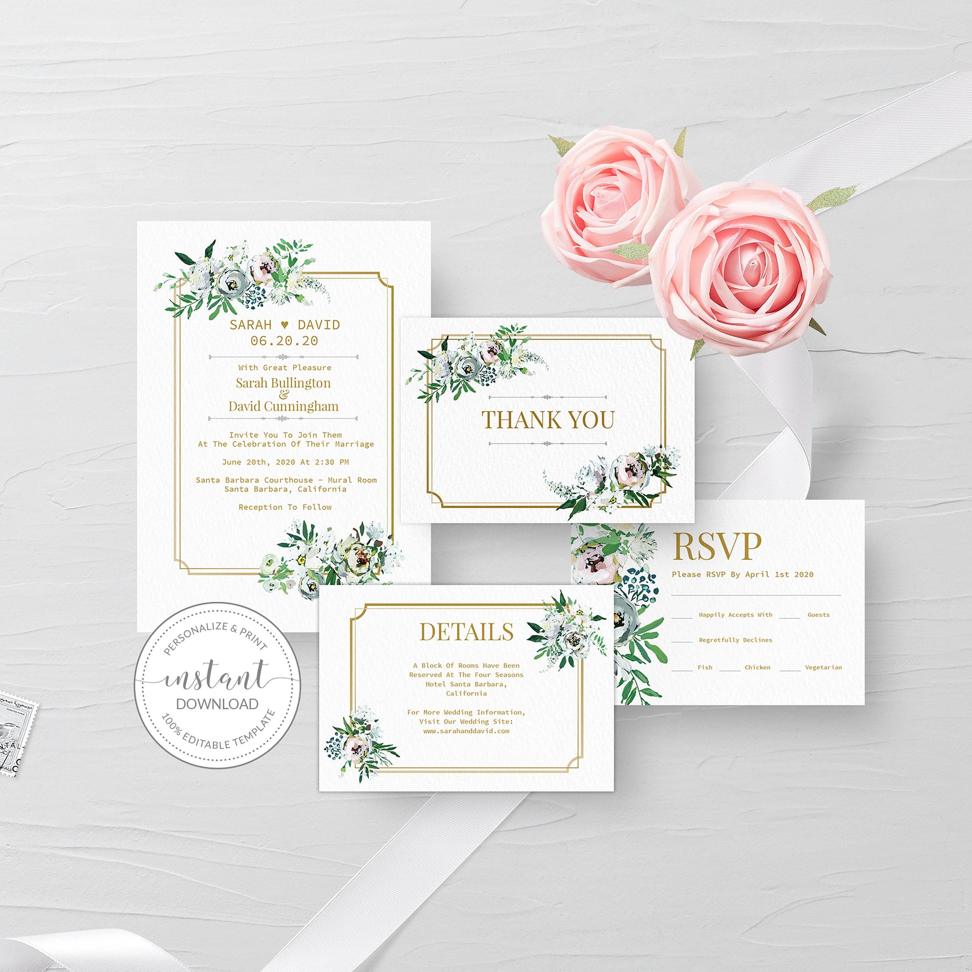 Blush Floral Greenery Wedding Invitation Suite Template, Printable Gold Wedding Invite, Editable INSTANT DOWNLOAD - BGF100