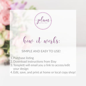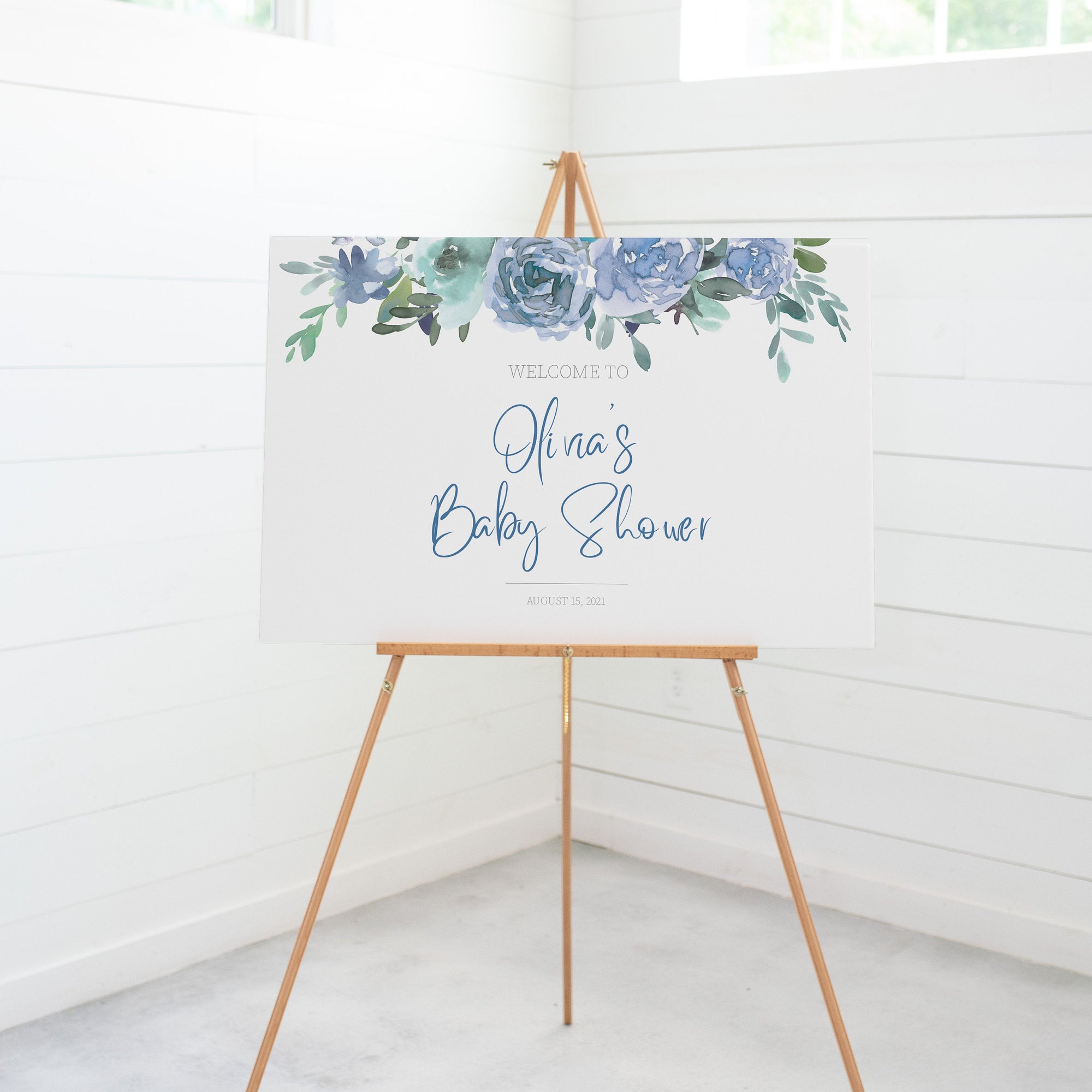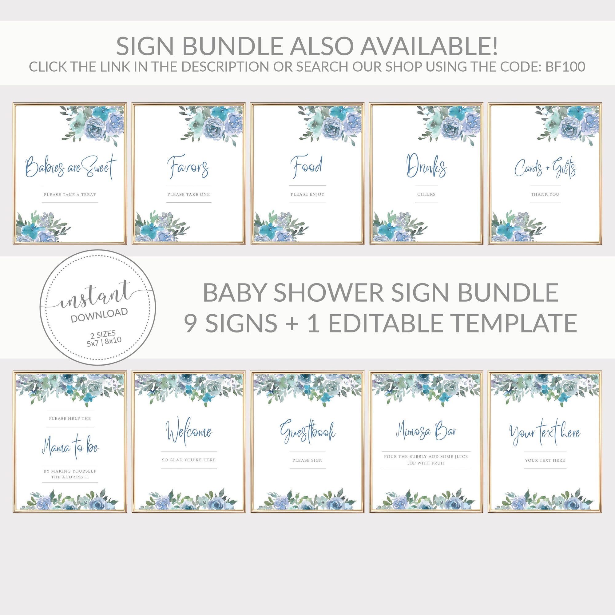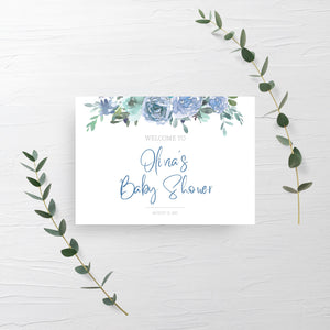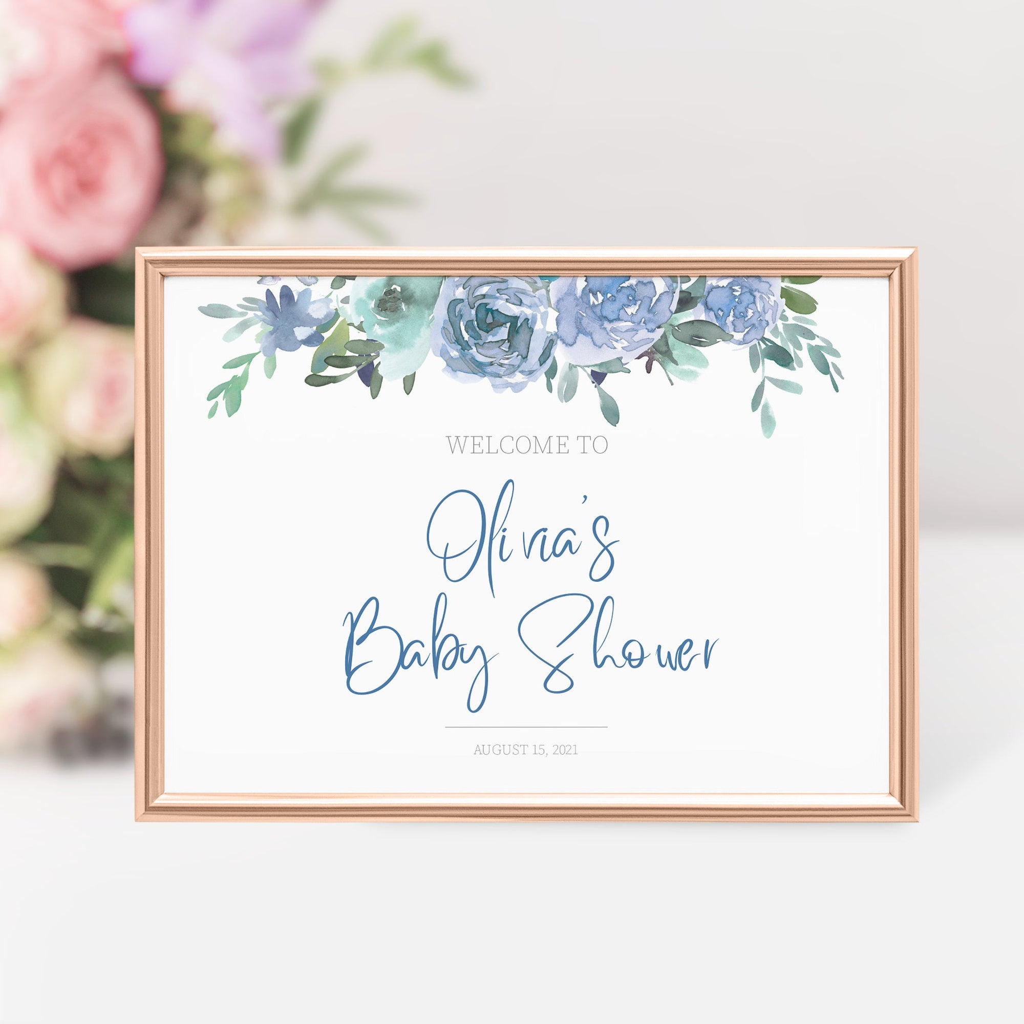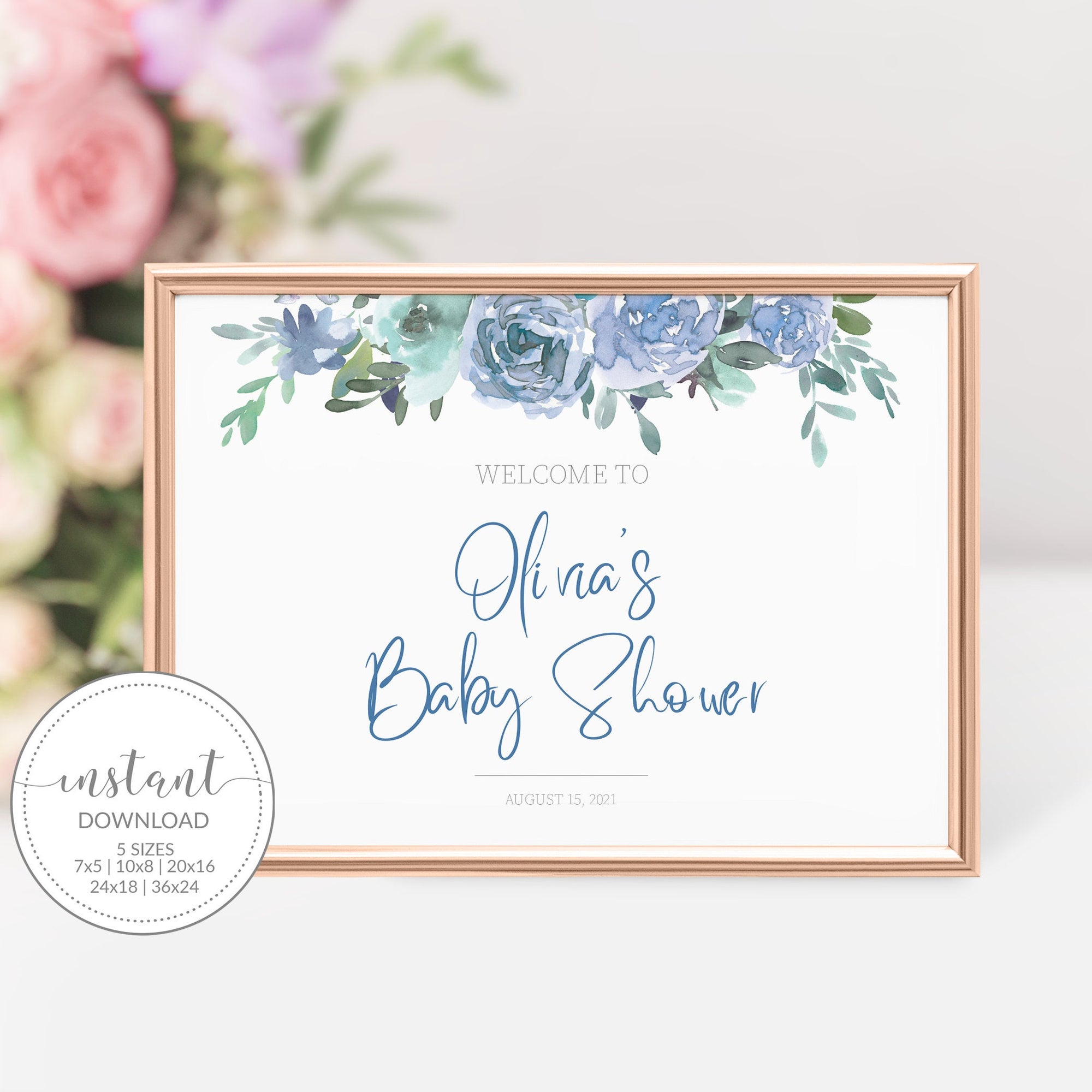 This blue floral baby shower welcome sign is available as an INSTANT DOWNLOAD editable template. Edit right in your browser using the online program, Templett. No software to download or fonts to install and you can even try it out before you buy!