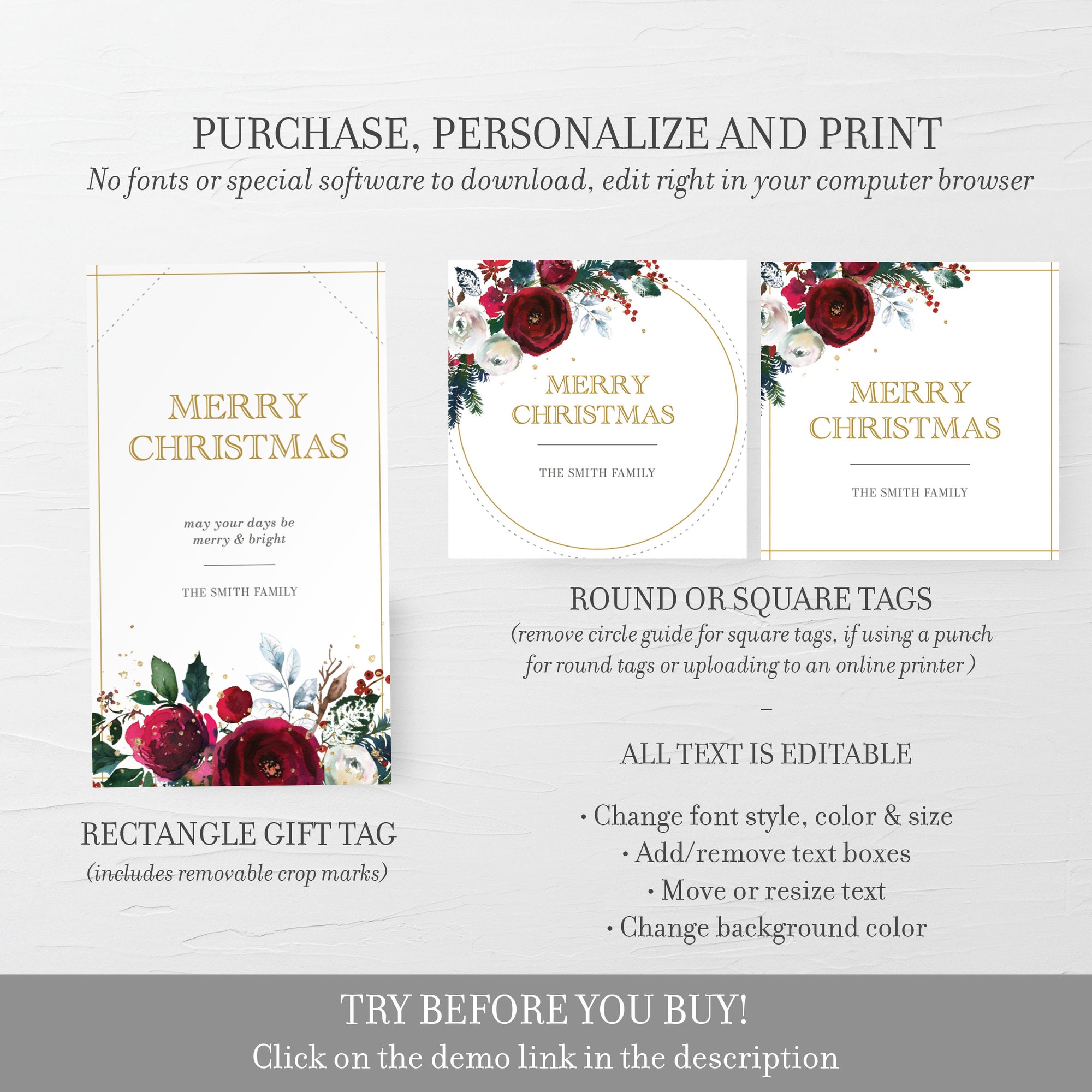 These Christmas gift tags are available as an INSTANT DOWNLOAD editable template. Edit right in your browser using the online program, Templett. No software to download or fonts to install and you can even try it out before you buy!