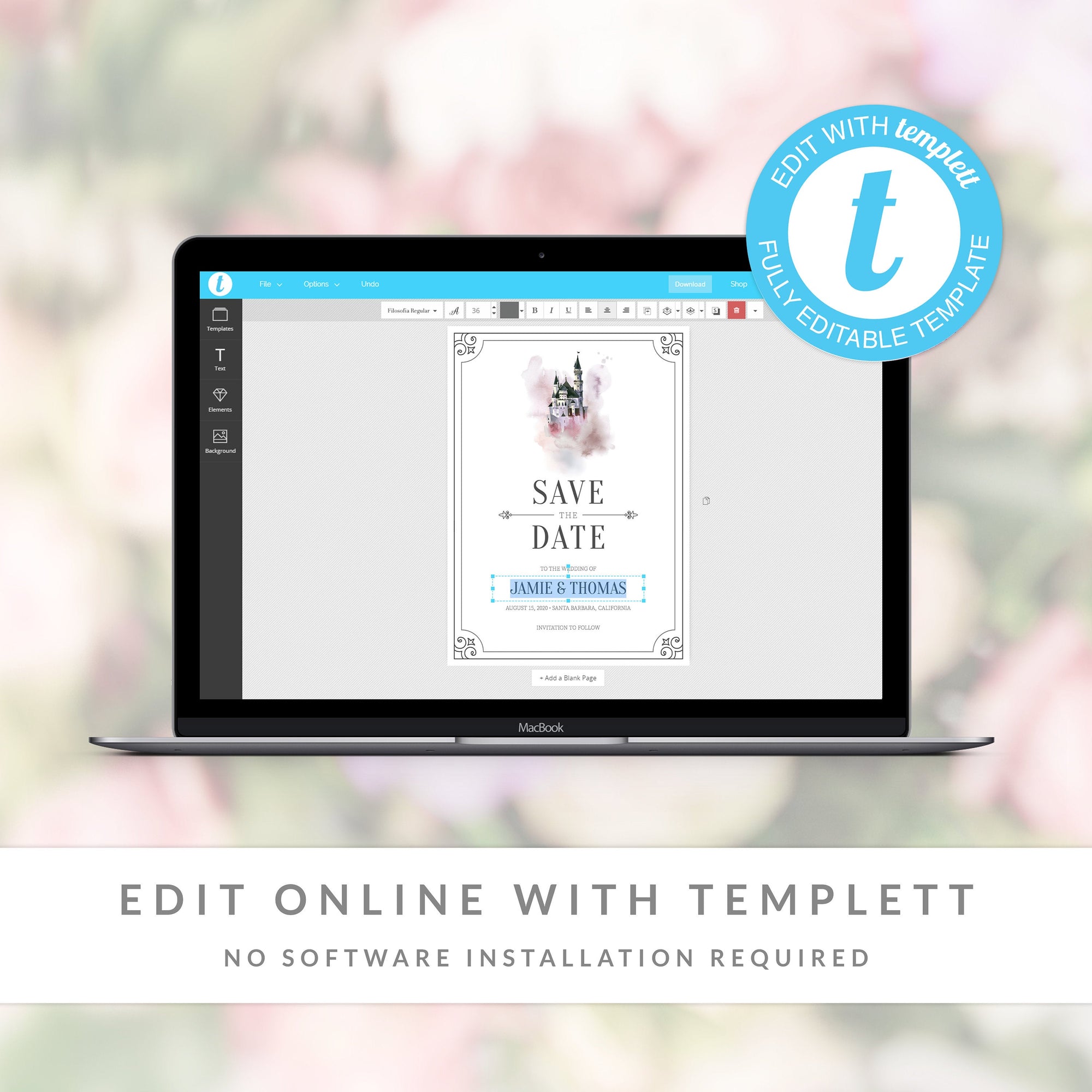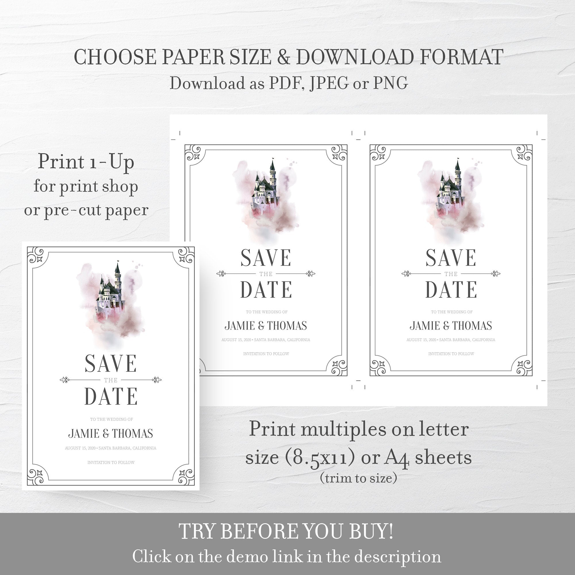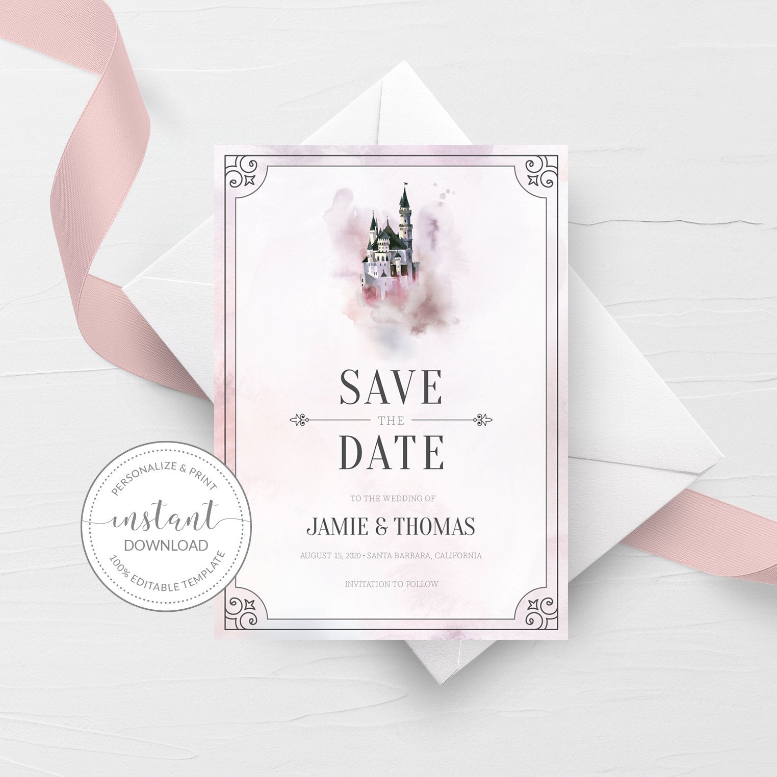 This fairytale save the date card is available as an INSTANT DOWNLOAD editable template. Edit right in your browser using the online program, Templett. No software to download or fonts to install and you can even try it out before you buy!