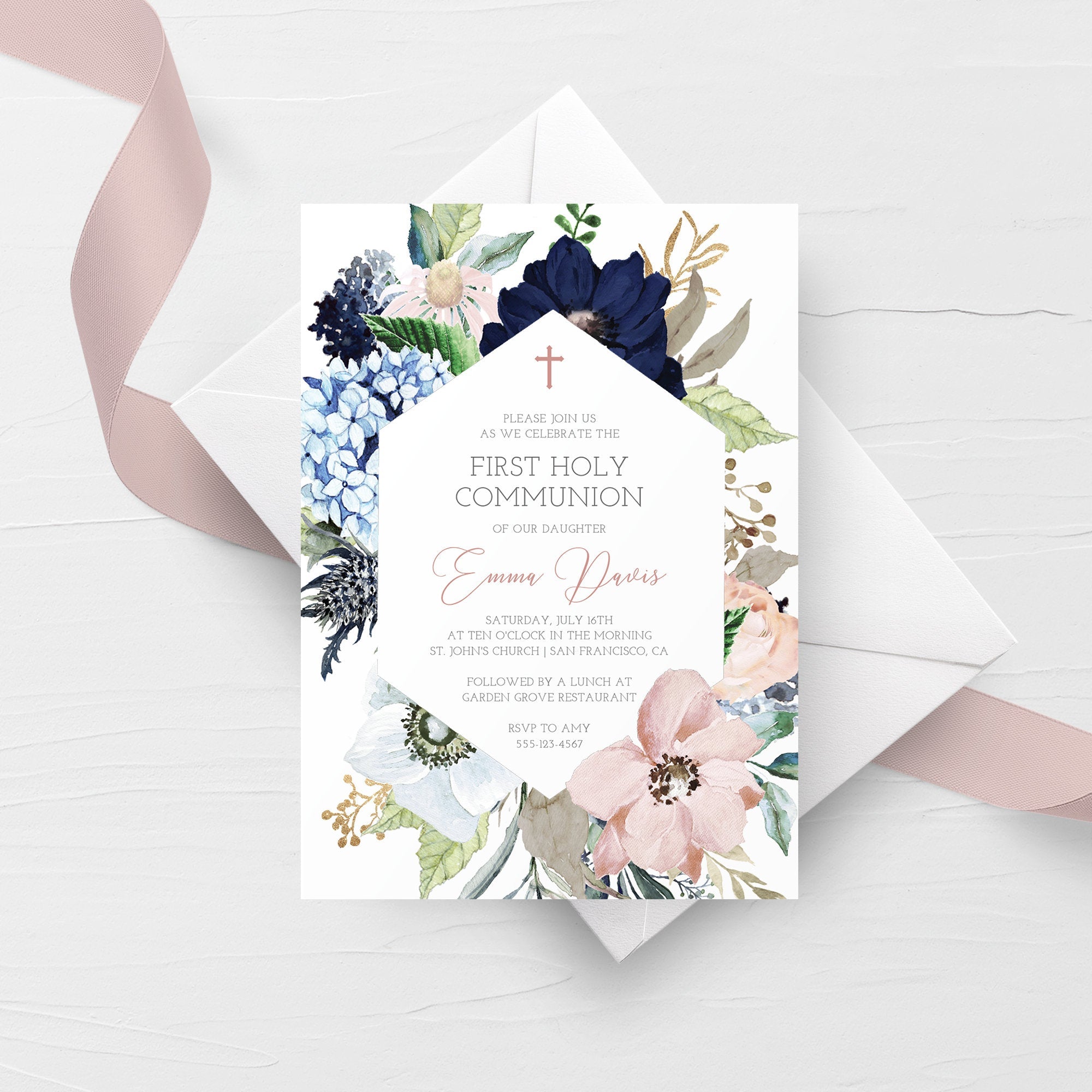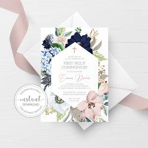 Navy and Blush Girl First Holy Communion Invitation Template, Printable Holy Communion Girl Invitation, 1st Holy Communion Invite, 5x7, Editable INSTANT DOWNLOAD - MB100