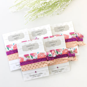 Our personalized hair tie party favors are a unique and practical take home gift. These elastic hair ties are an extremely versatile party favor and are something that your guests will actually use! These sparkling elastic hair ties come affixed to a personalized card and packaged in a clear cello envelope, perfect for gifting to your guests.