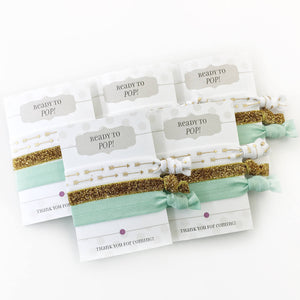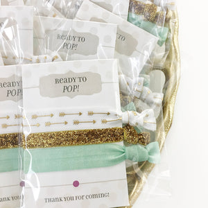 Ready to POP! These sweet mint green and gold hair ties make the perfect favors for a gender neutral baby shower, baby sprinkle, sip and see, or gender reveal party!