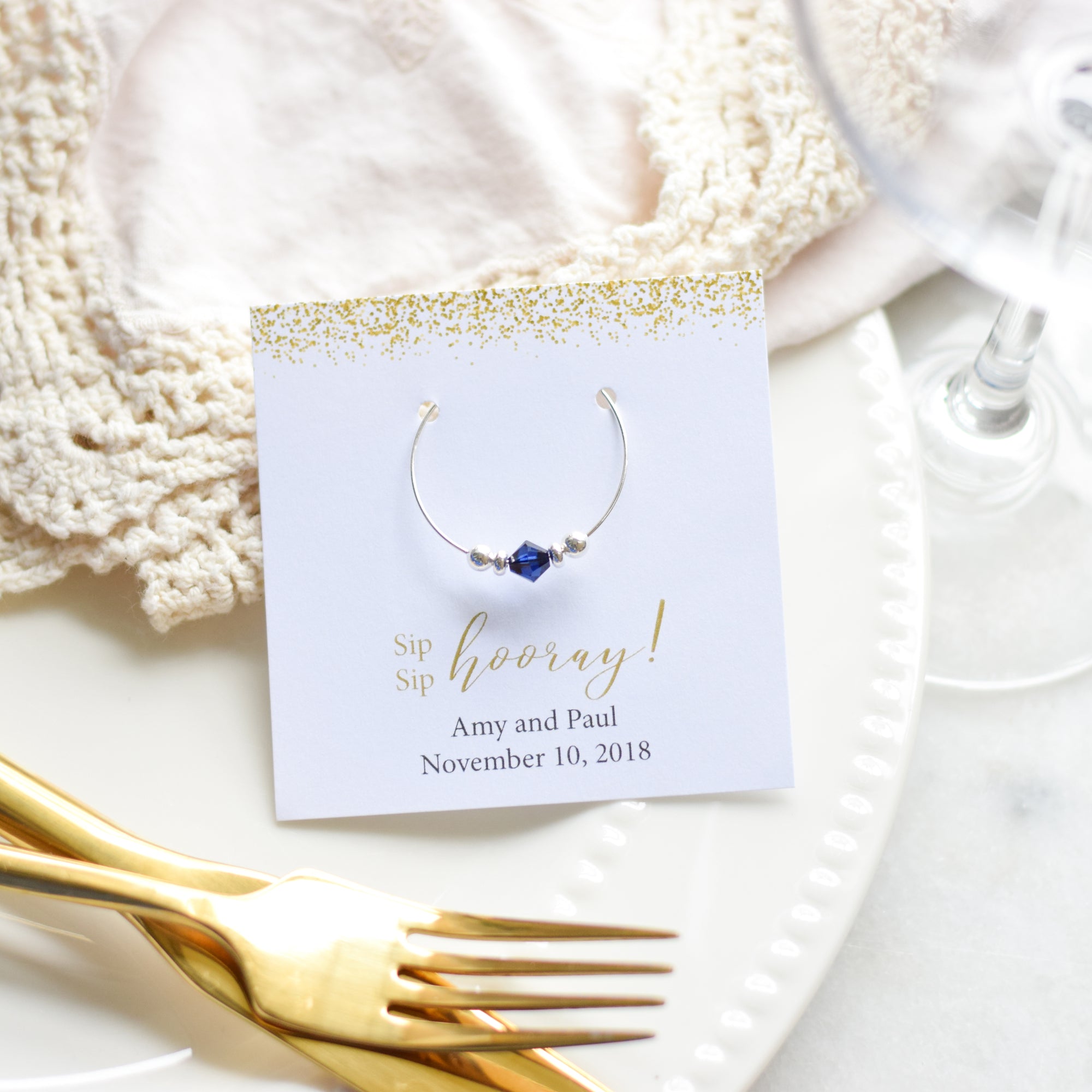 Each Swarovski crystal wine charm comes affixed to a personalized card and packaged in a clear cello envelope, perfect for gifting to your guests.