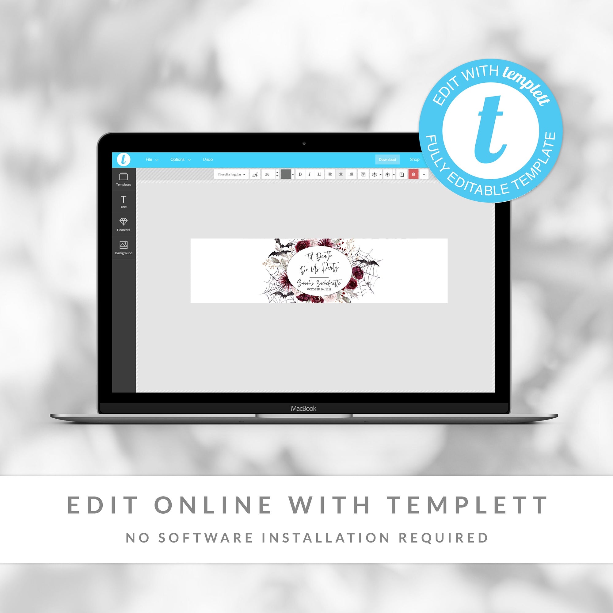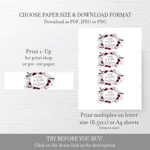 These water bottle labels are available as an INSTANT DOWNLOAD editable template. Edit right in your browser using the online program, Templett. No software to download or fonts to install and you can even try it out before you buy!