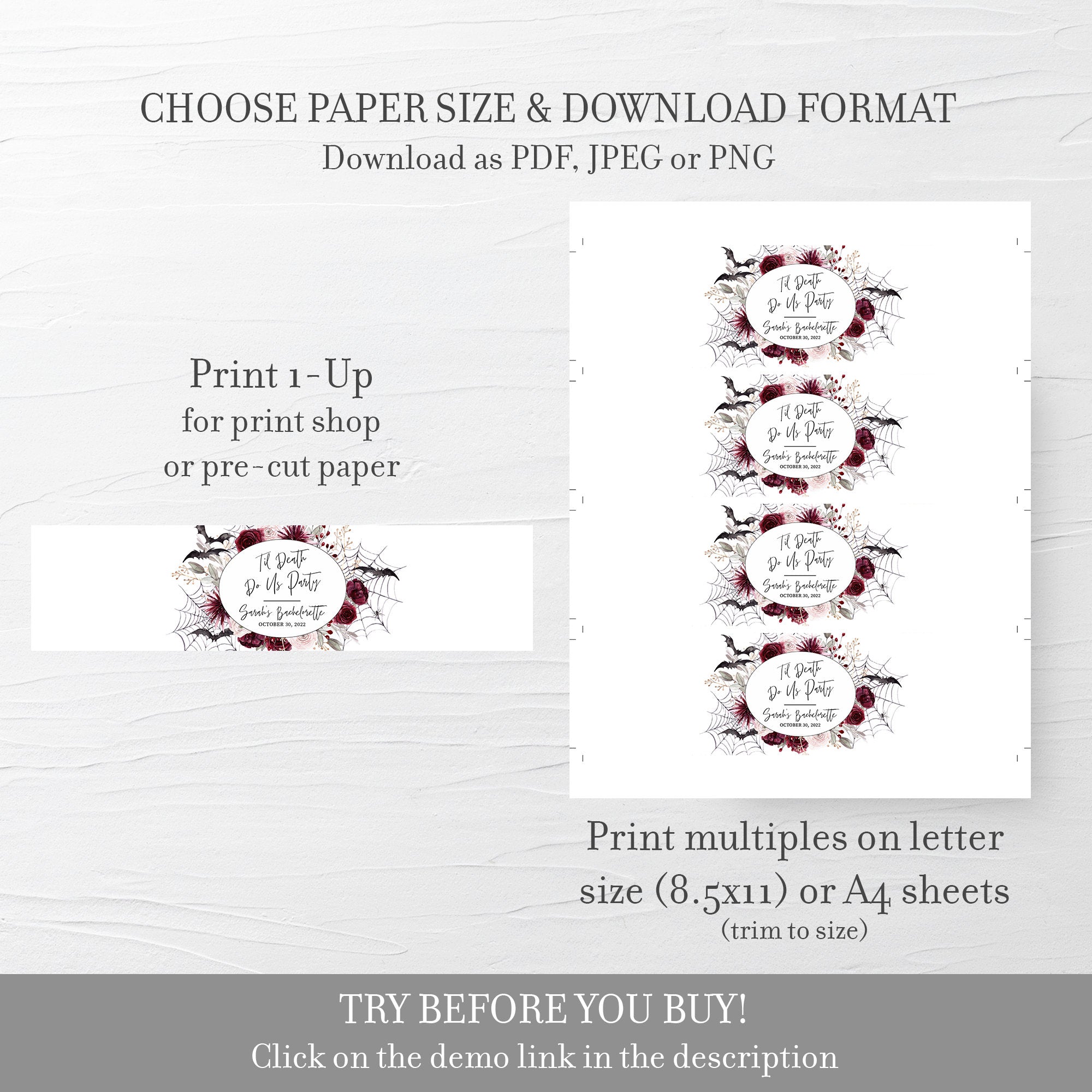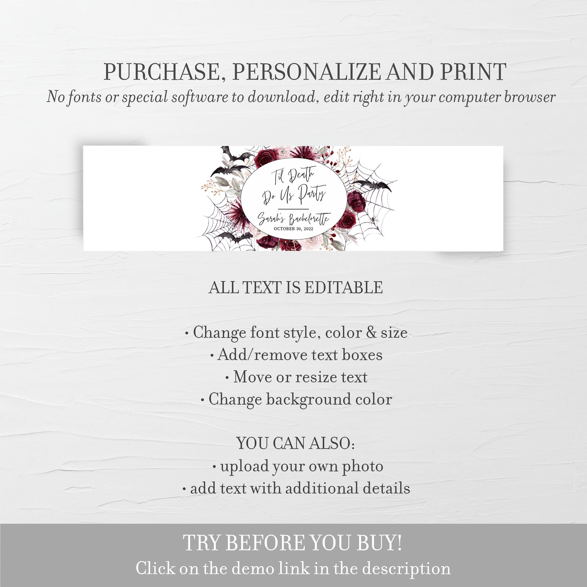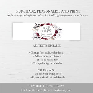 Til Death Do Us Party Bachelorette Water Bottle Labels Template, Gothic Halloween Drink Label, Editable INSTANT DOWNLOAD - H100
