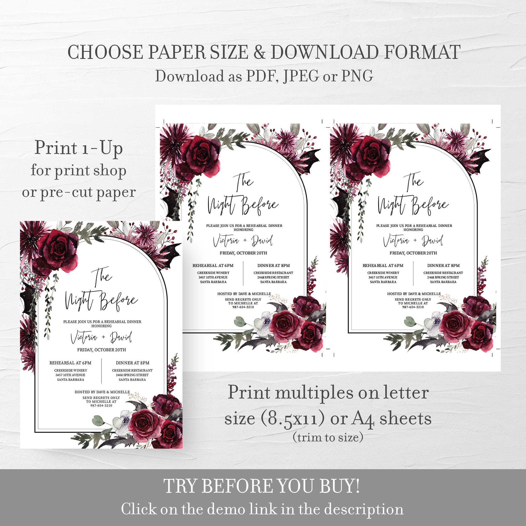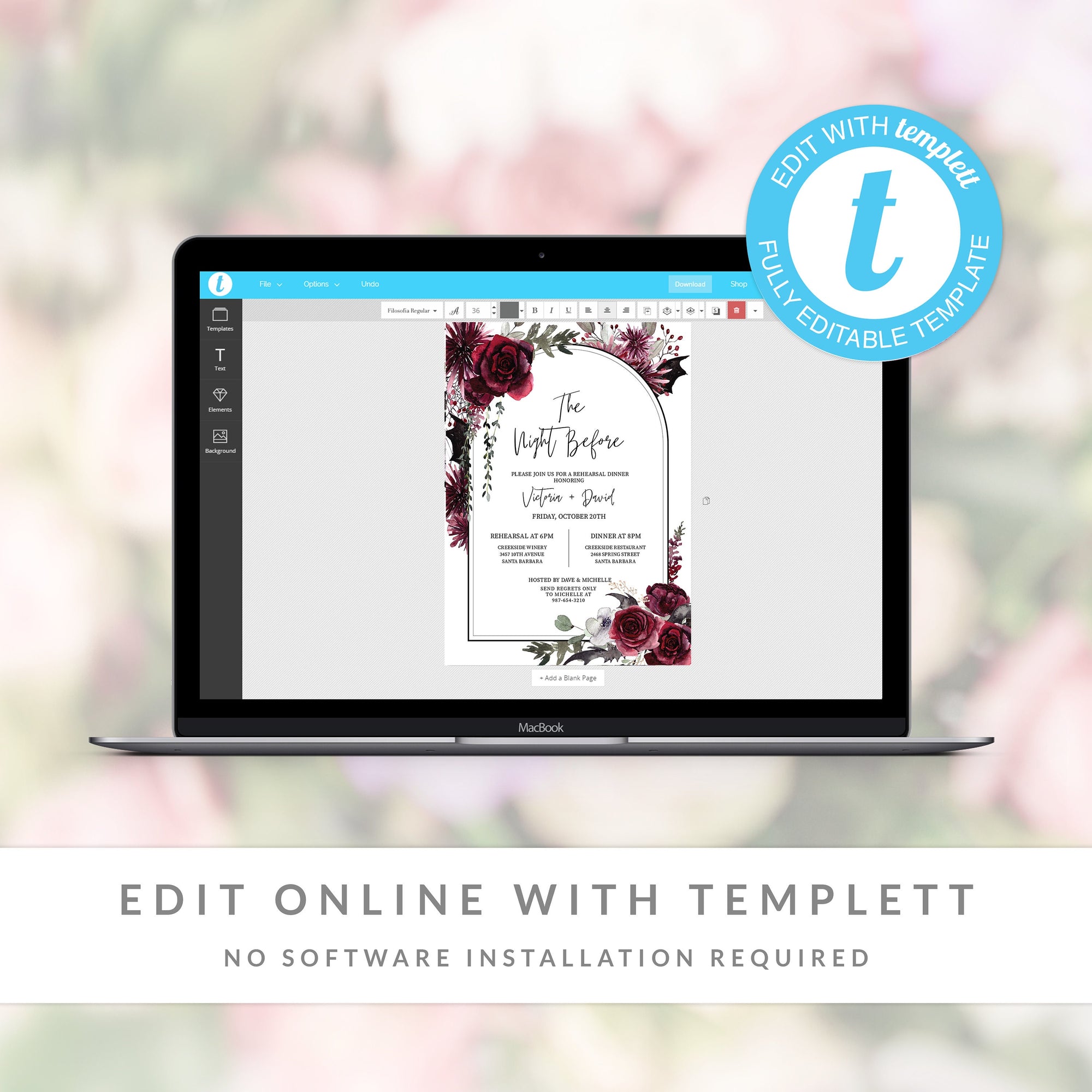 This Halloween wedding rehearsal dinner invitation is available as an INSTANT DOWNLOAD editable template. Edit right in your browser using the online program, Templett. No software to download or fonts to install and you can even try it out before you buy!
