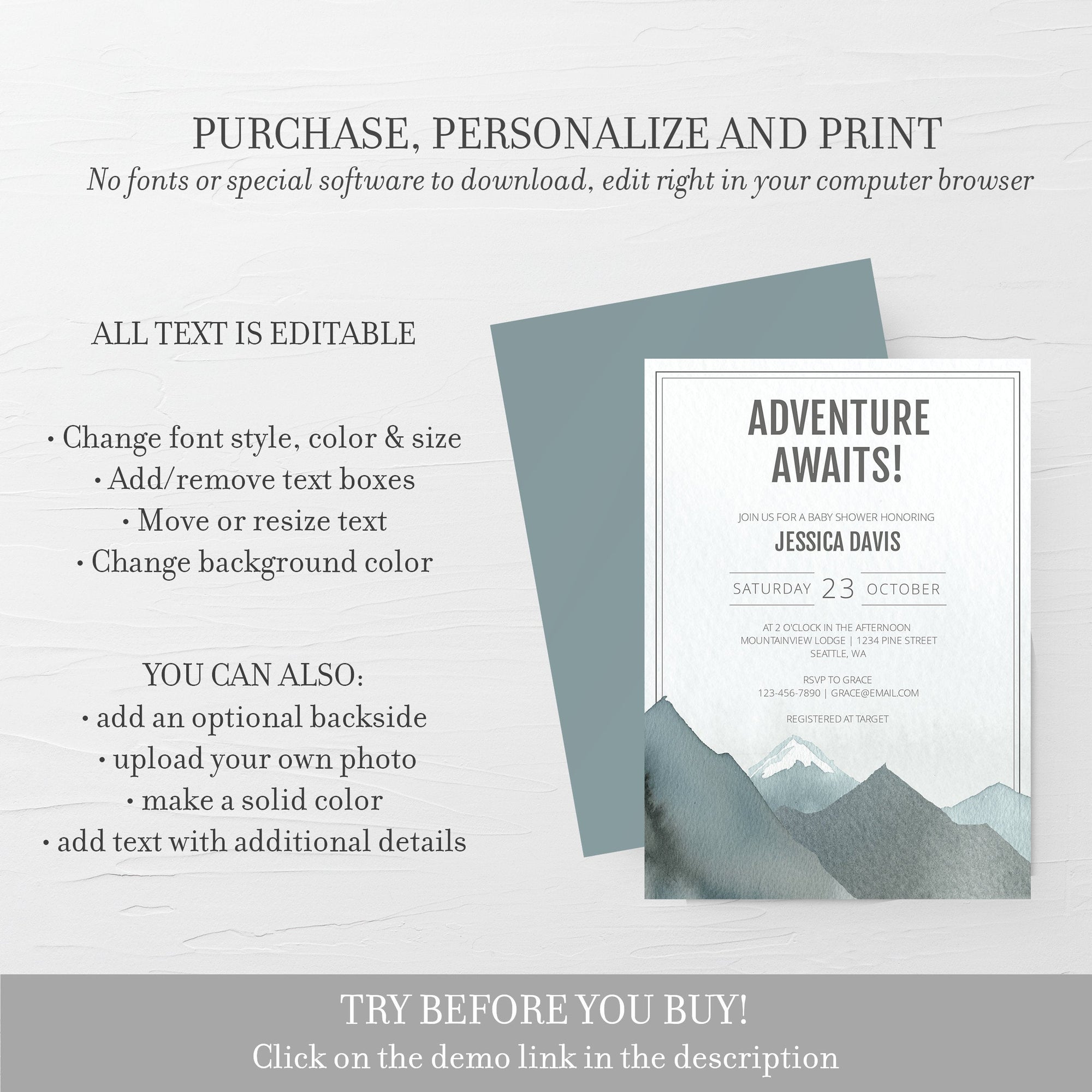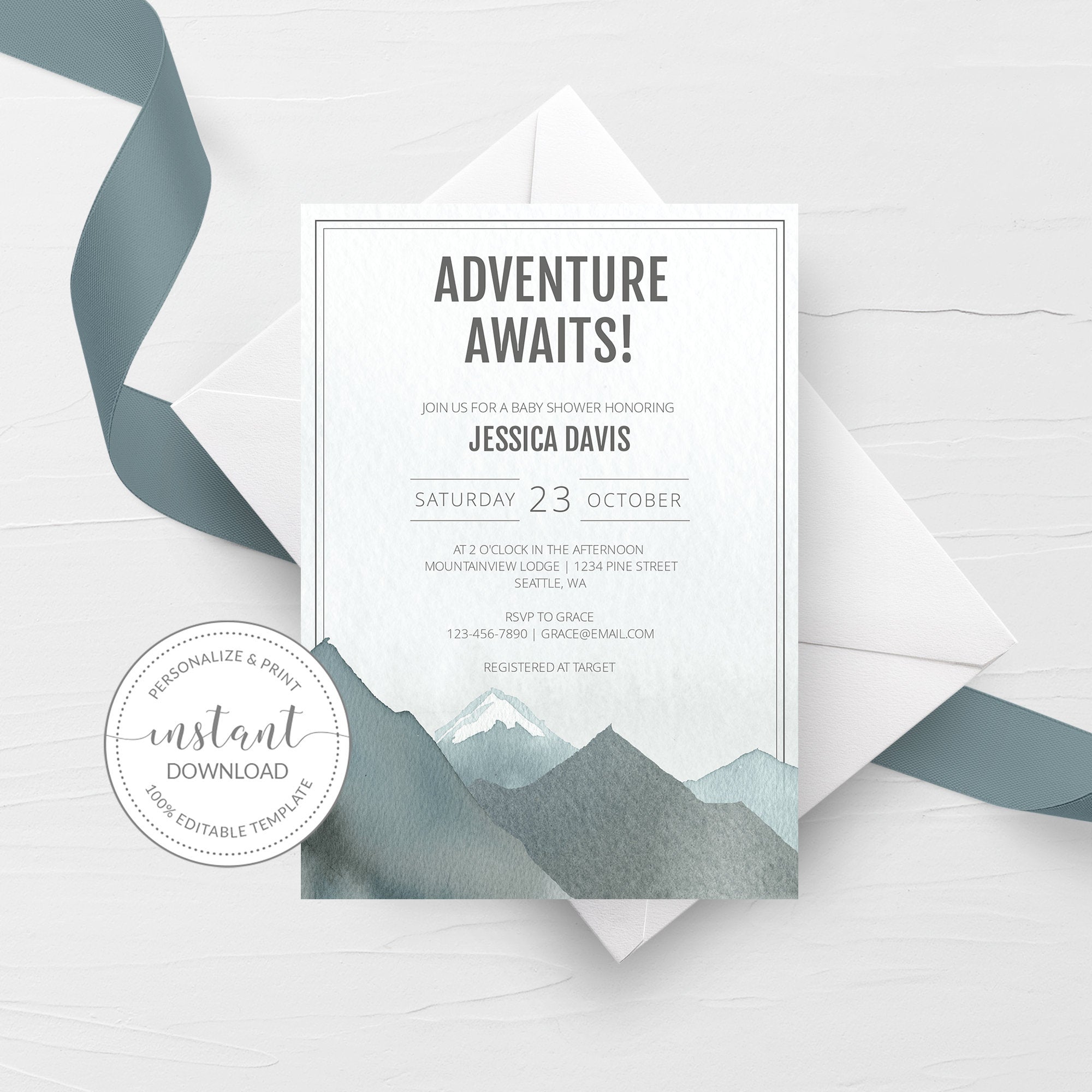 Mountain Baby Shower Invitation Template, Printable Adventure Awaits Invite, Editable INSTANT DOWNLOAD - D100