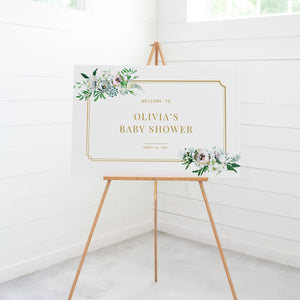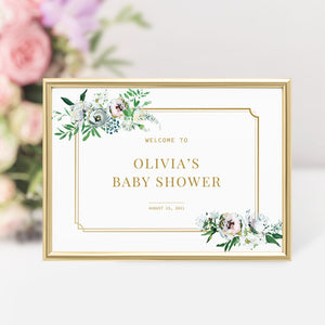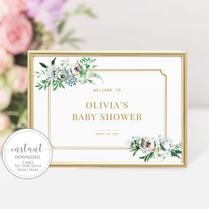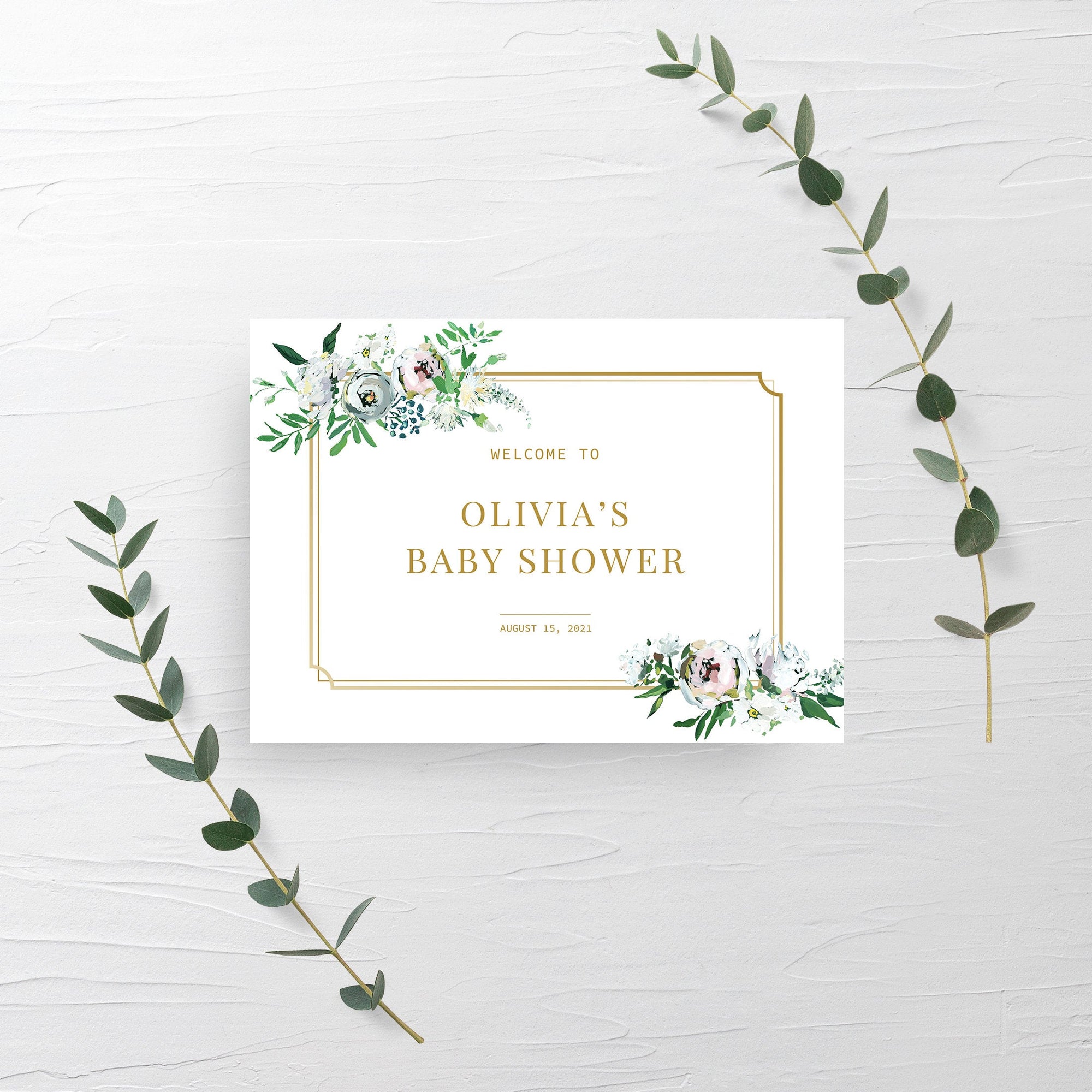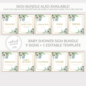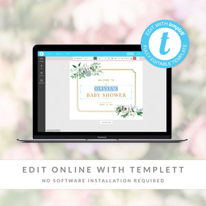 This gold and blush floral baby shower welcome sign is available as an INSTANT DOWNLOAD editable template. Edit right in your browser using the online program, Templett. No software to download or fonts to install and you can even try it out before you buy!