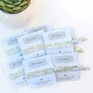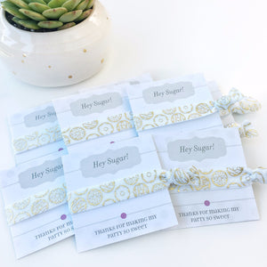 Our hair tie favors are a perfect way to say "thank you" to your guests. Every time they use the hair ties to throw their hair up, they will think of the fabulous details and awesome time they had at your party!